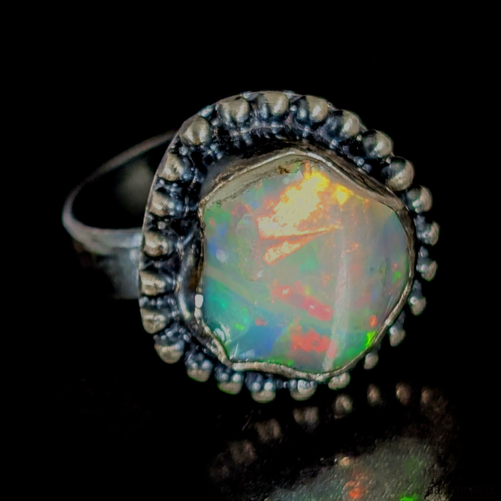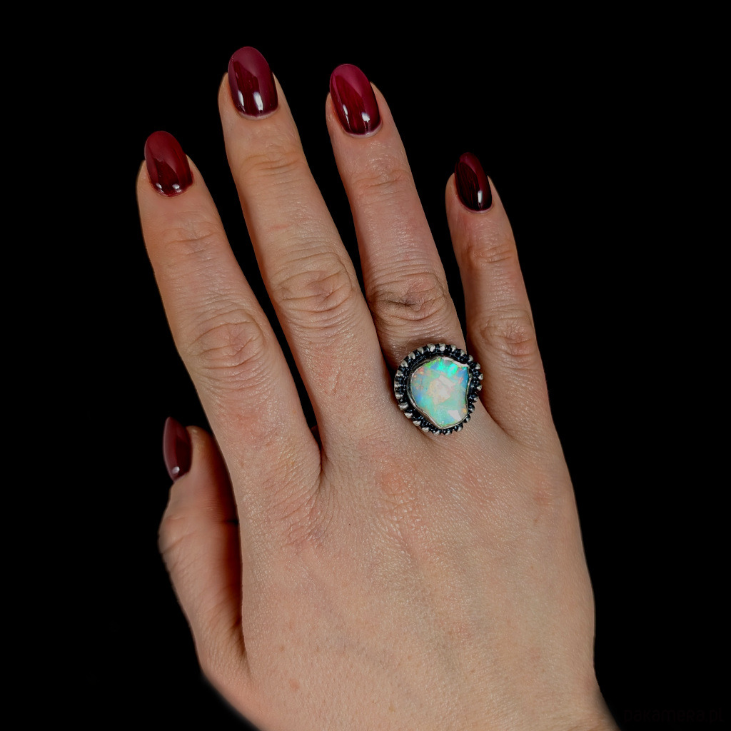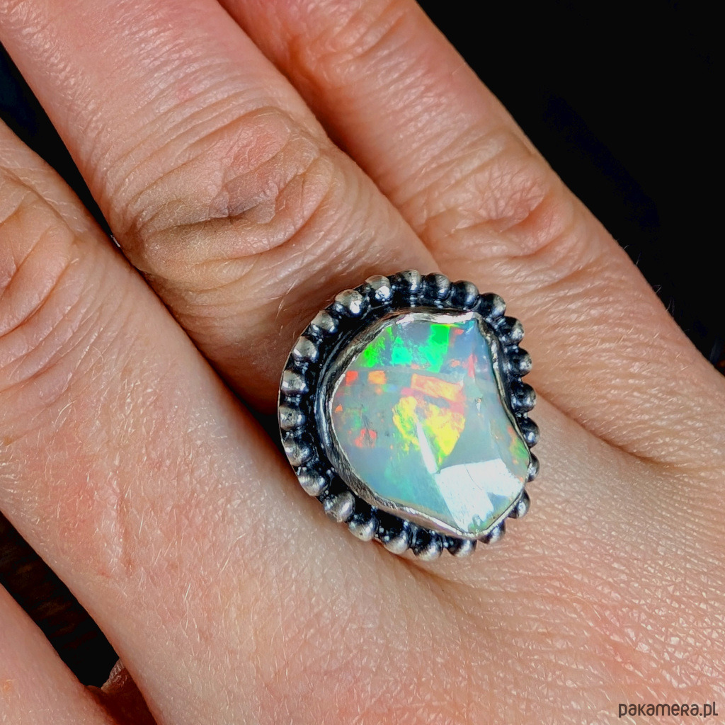 Piękny, surowy pierścień z oprawionym opalem etiopskim Srebro pr.925, oksydowane. Wymiary oprawy 20 x 18 mm. Waga 7,7 g. Obrączka regulowana w szerokim zakresie (9-26), proszę napisać po zakupie, to dopasuję na konkretny rozmiar. Obrączka ma 5 mm szerokości. Zapakowany w ozdobne pudełeczko.