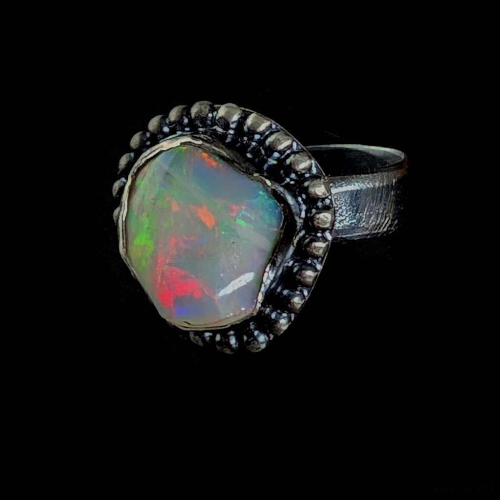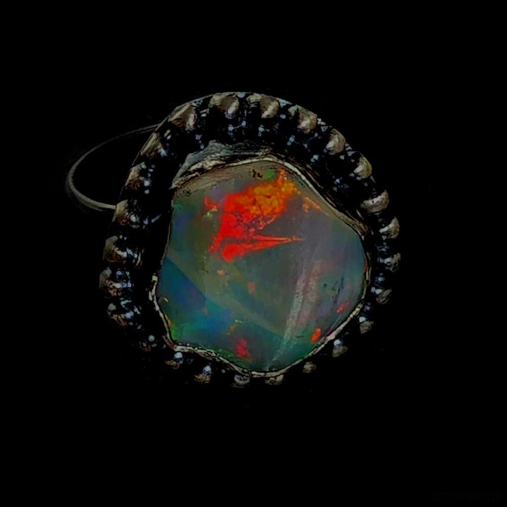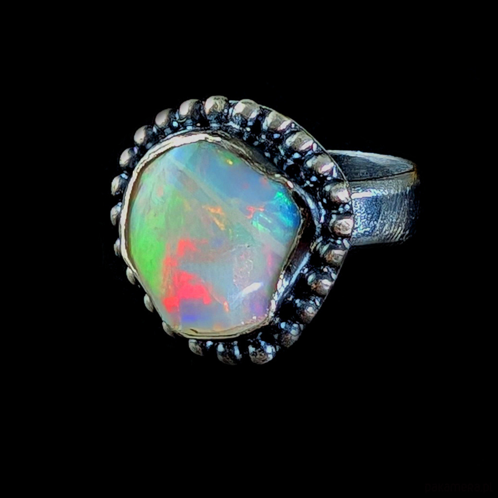 Piękny, surowy pierścień z oprawionym opalem etiopskim Srebro pr.925, oksydowane. Wymiary oprawy 20 x 18 mm. Waga 7,7 g. Obrączka regulowana w szerokim zakresie (9-26), proszę napisać po zakupie, to dopasuję na konkretny rozmiar. Obrączka ma 5 mm szerokości. Zapakowany w ozdobne pudełeczko.