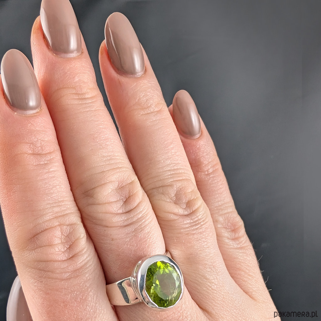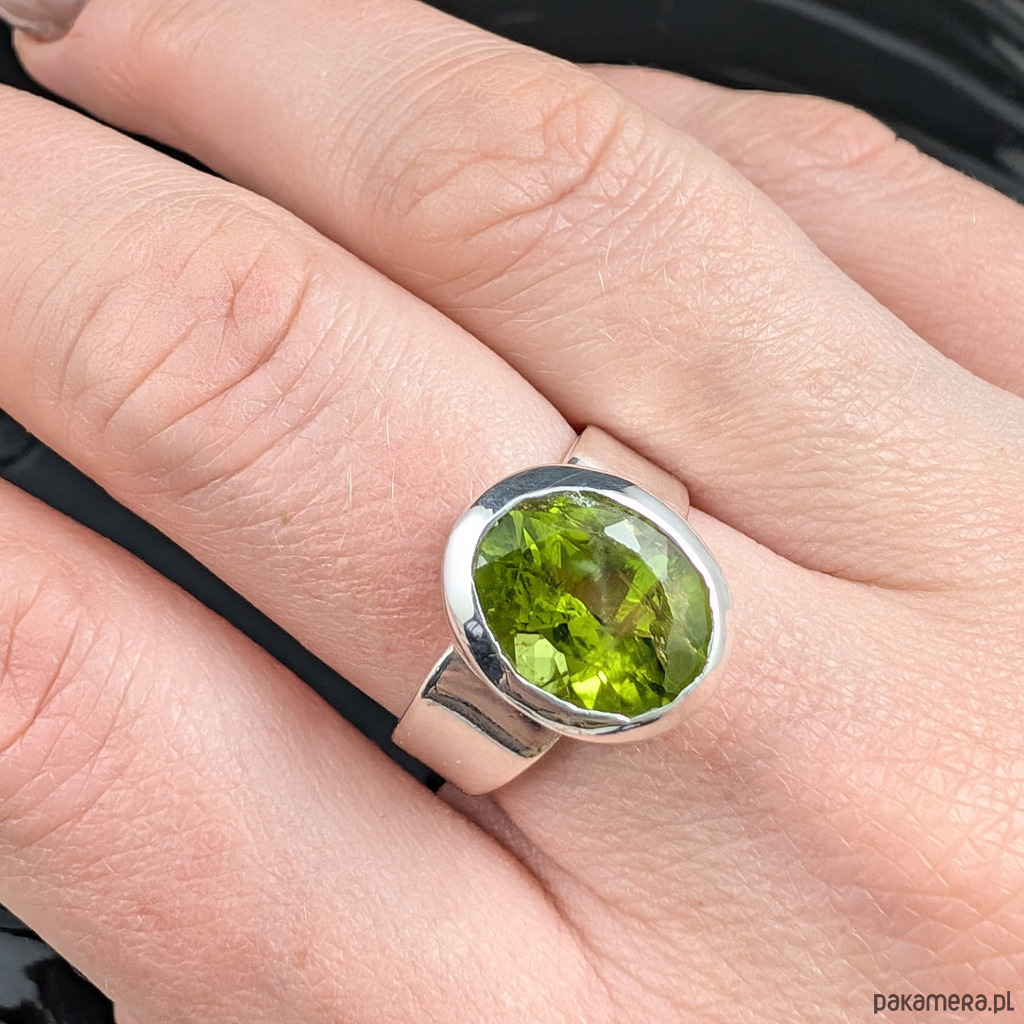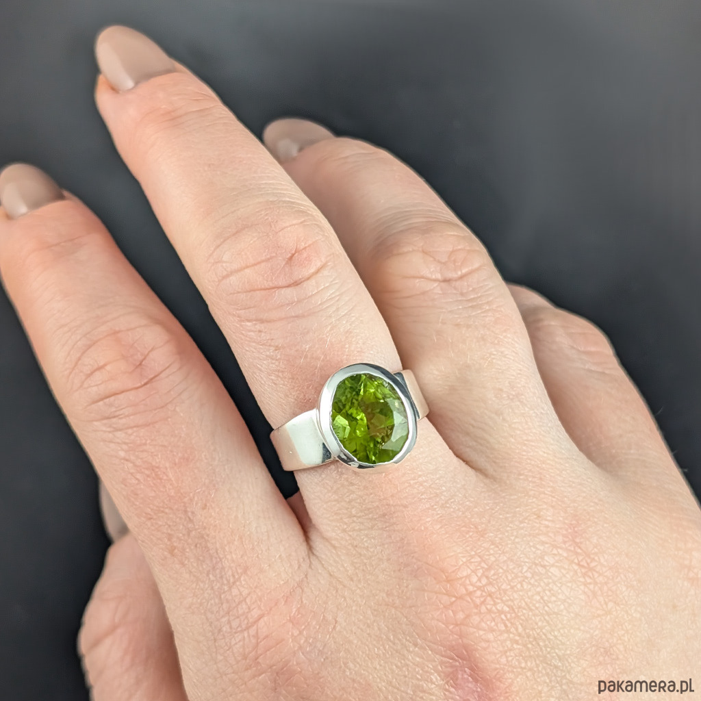 W srebrną obrączkę oprawiony został piękny fasetowany peridot, szlachetna odmiana oliwinu o wymiarach oprawy 15 x 12 mm. Szerokość obrączki max 7 mm. Srebro pr 925. Rozmiar jubilerski 17 z możliwością dopasowania na max 18. Waga 7 g. Wykonany przez dostawcę kamieni, polecam, przepiękny kamień. Pierścionek zostanie zapakowany w ozdobne pudełeczko.