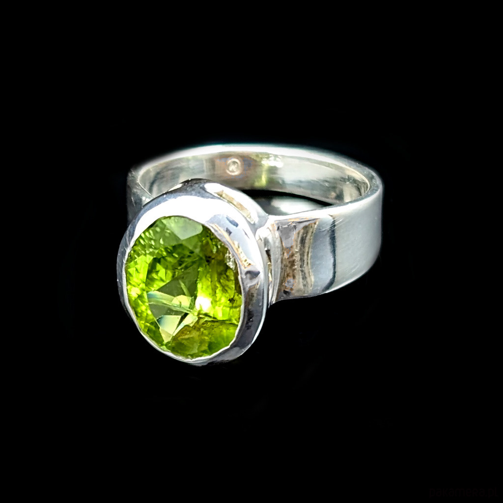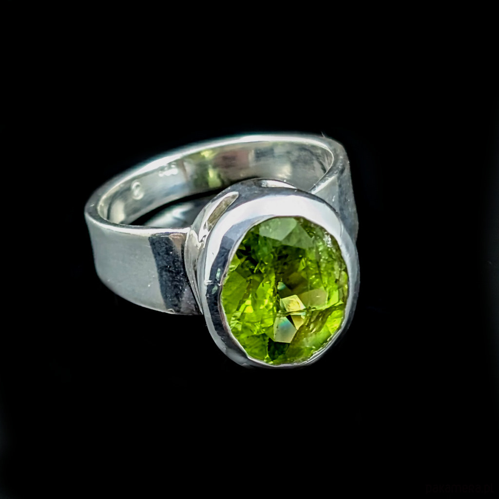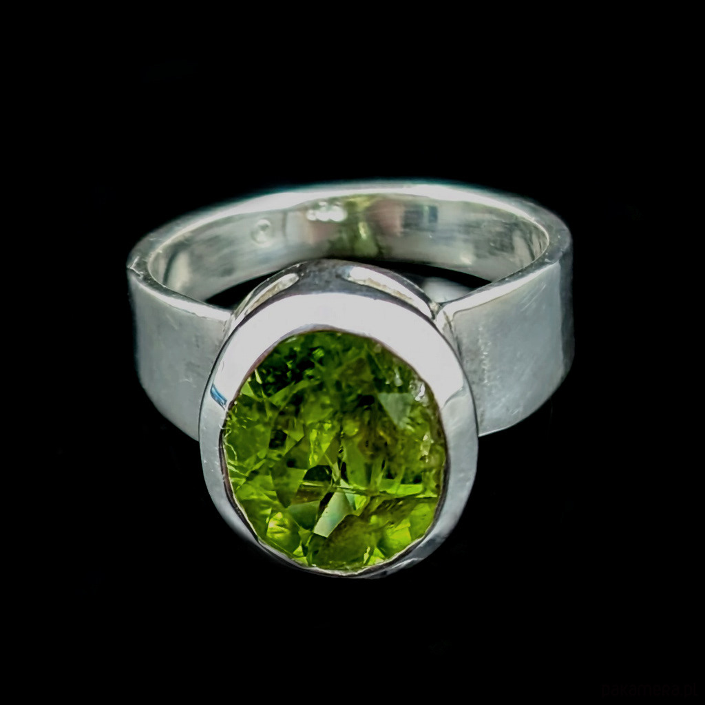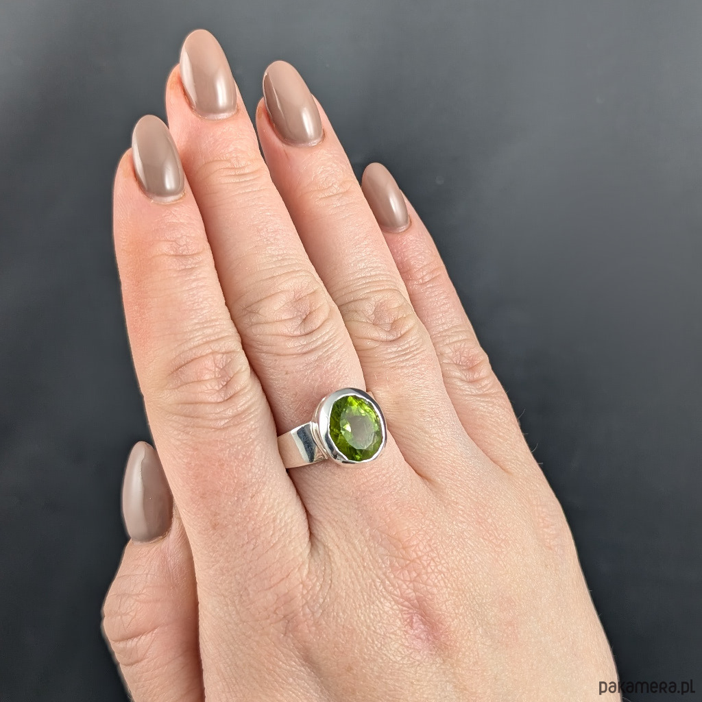 W srebrną obrączkę oprawiony został piękny fasetowany peridot, szlachetna odmiana oliwinu o wymiarach oprawy 15 x 12 mm. Szerokość obrączki max 7 mm. Srebro pr 925. Rozmiar jubilerski 17 z możliwością dopasowania na max 18. Waga 7 g. Wykonany przez dostawcę kamieni, polecam, przepiękny kamień. Pierścionek zostanie zapakowany w ozdobne pudełeczko.