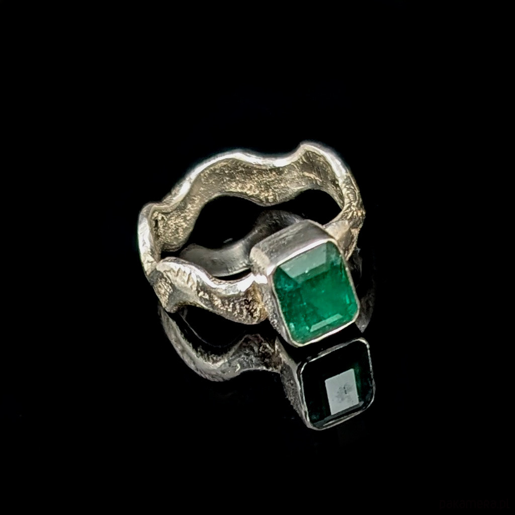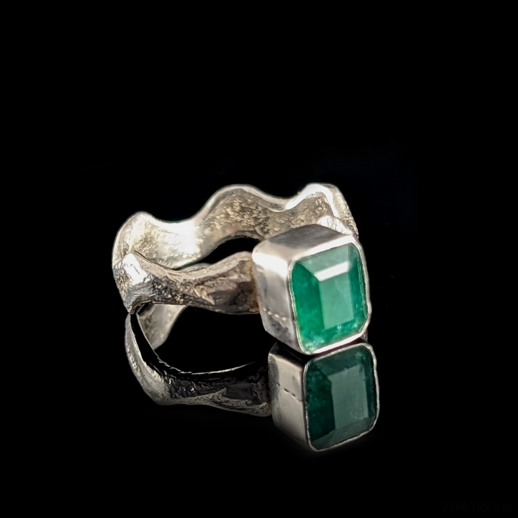 Pierścionek z oprawionym w srebrną obrączkę fasetowanym szlachetnym szmaragdem o przepięknym odecieniu zieleni.