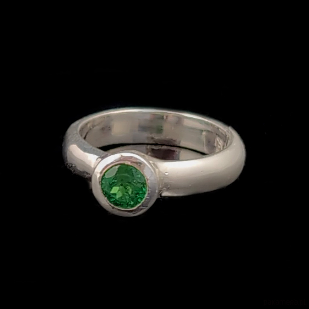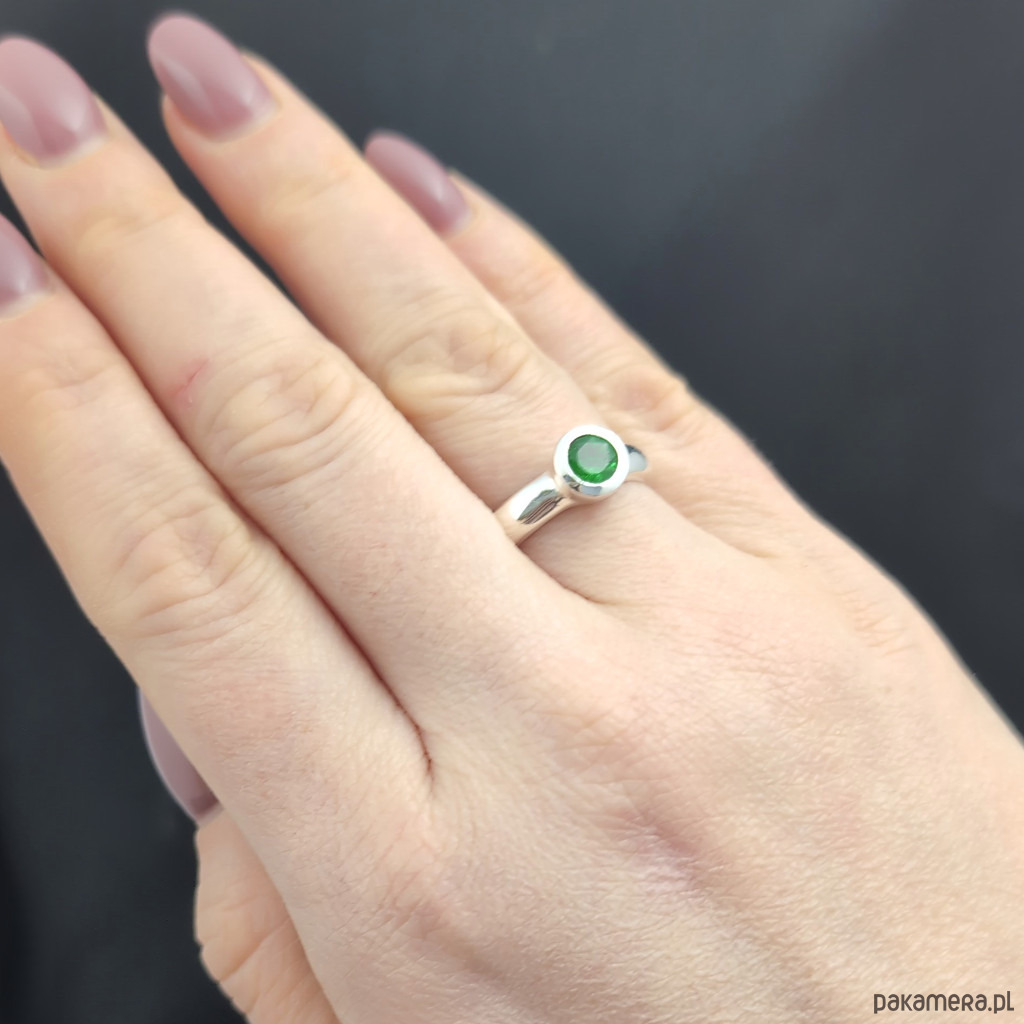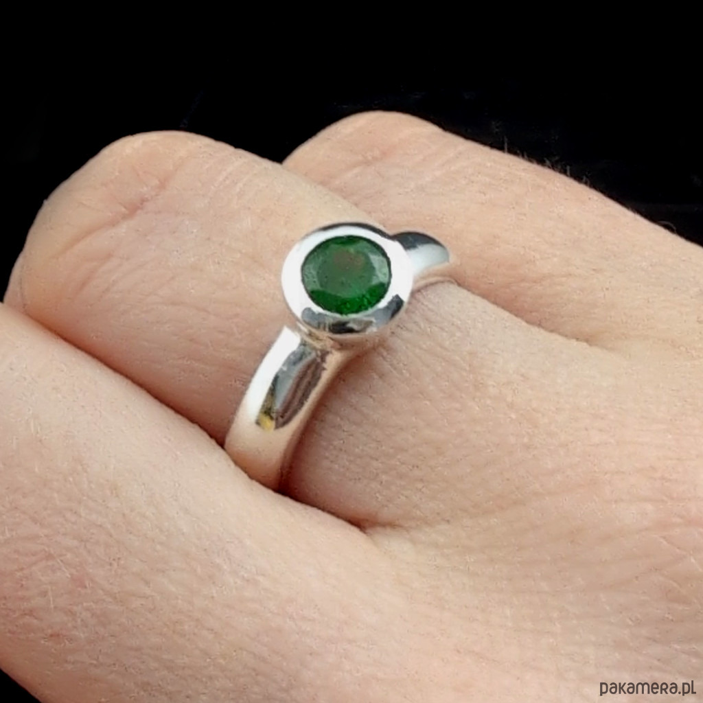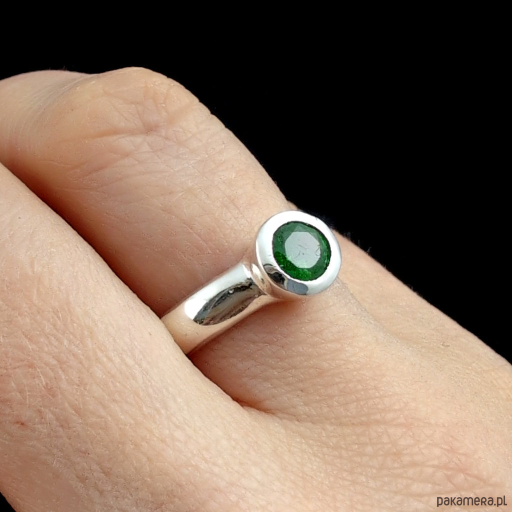 Pierścionek ze srebra pr. 925 oraz szlachetnego, fasetowanego tsavorytu, który ma nieziemsko piękną barwę (najlepiej oddają ją zdjęcia na palcu), oprawa średnica 7mm. Rozmiar jubilerski 16, bez możliwości zmiany. Waga 6,62 g. Wykonany przez dostawcę kamieni. Pierścień zostanie zapakowany w ozdobne pudełeczko.