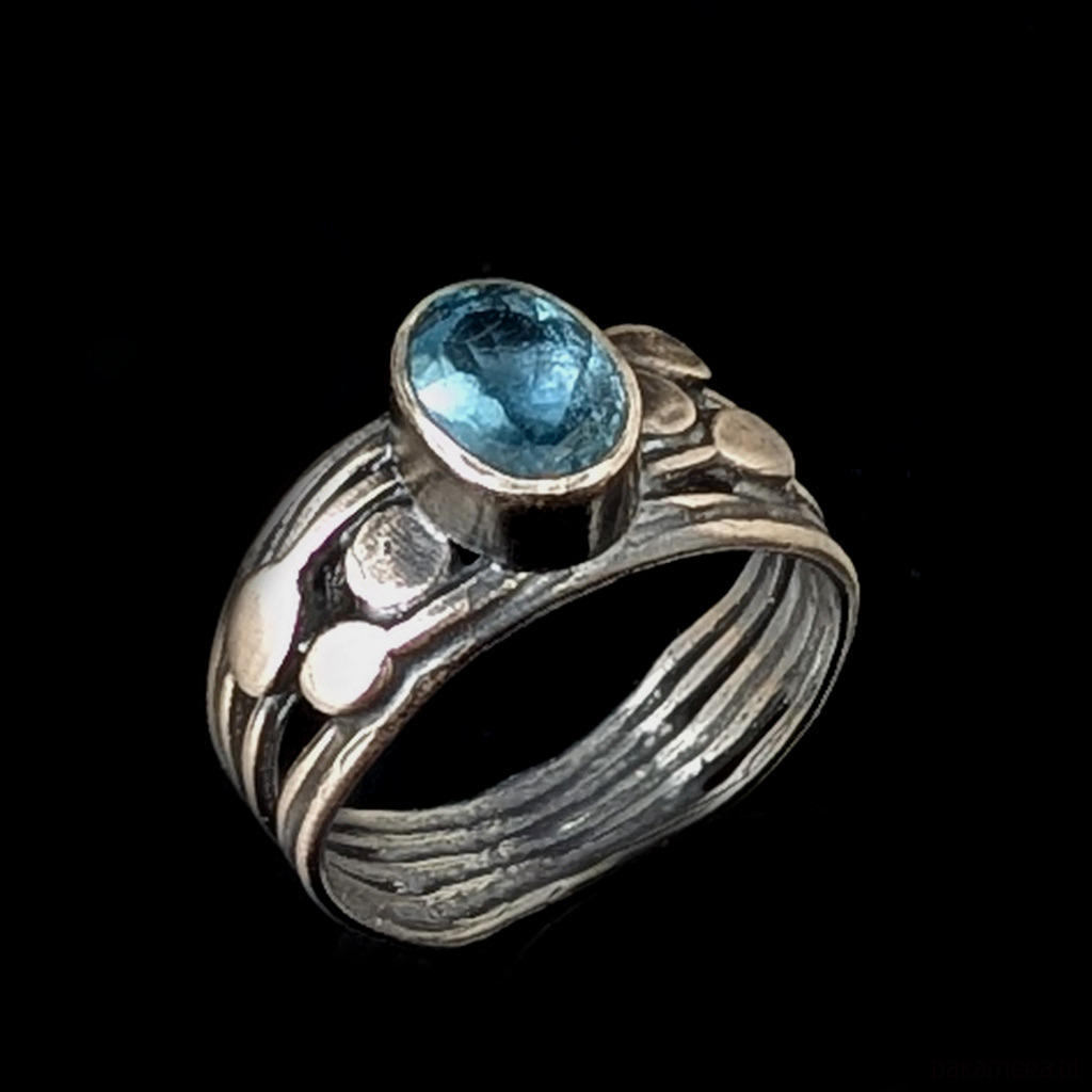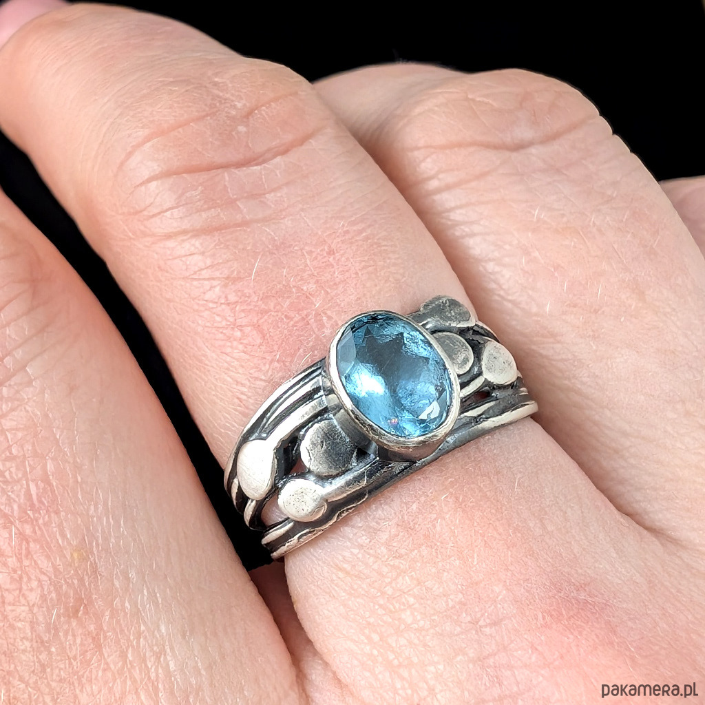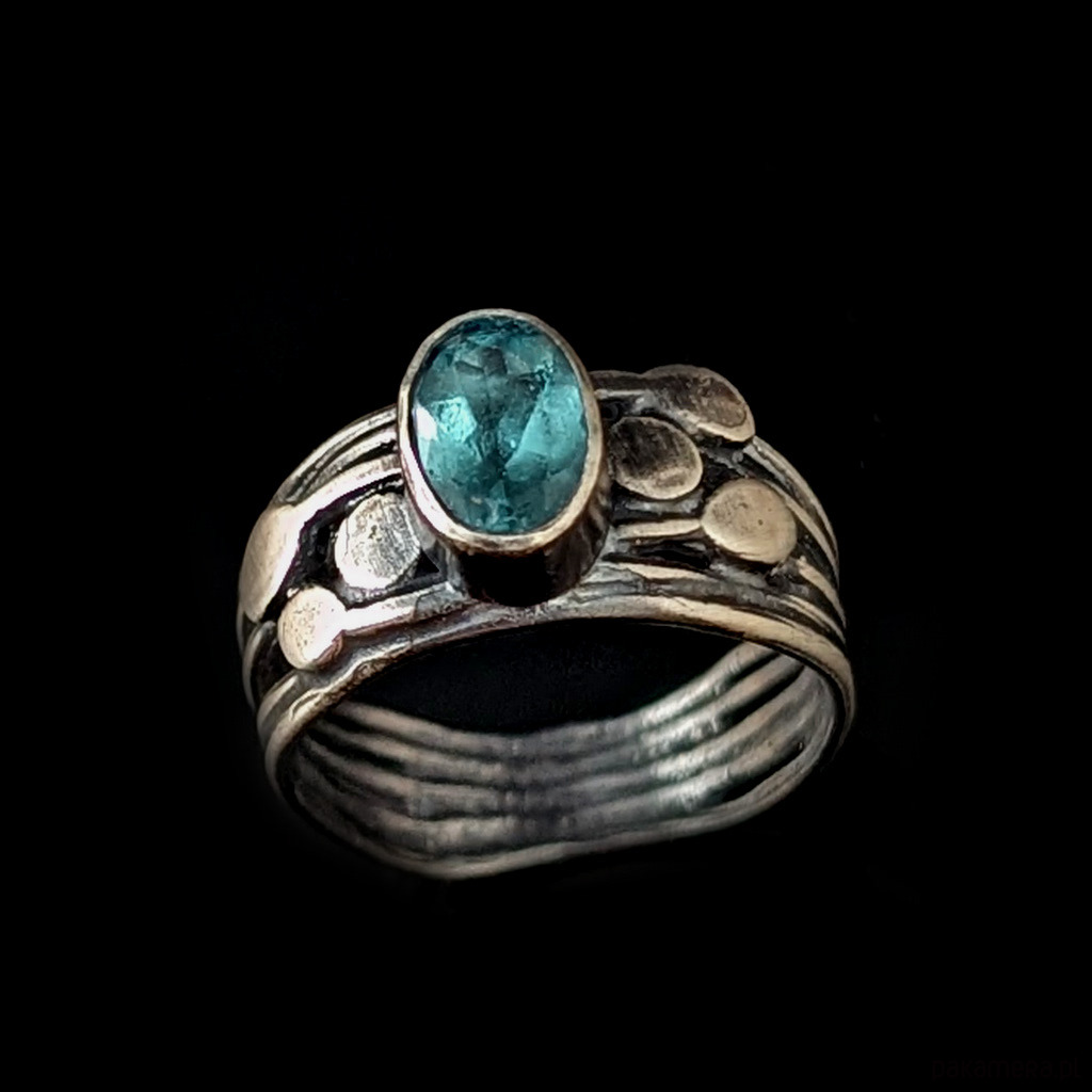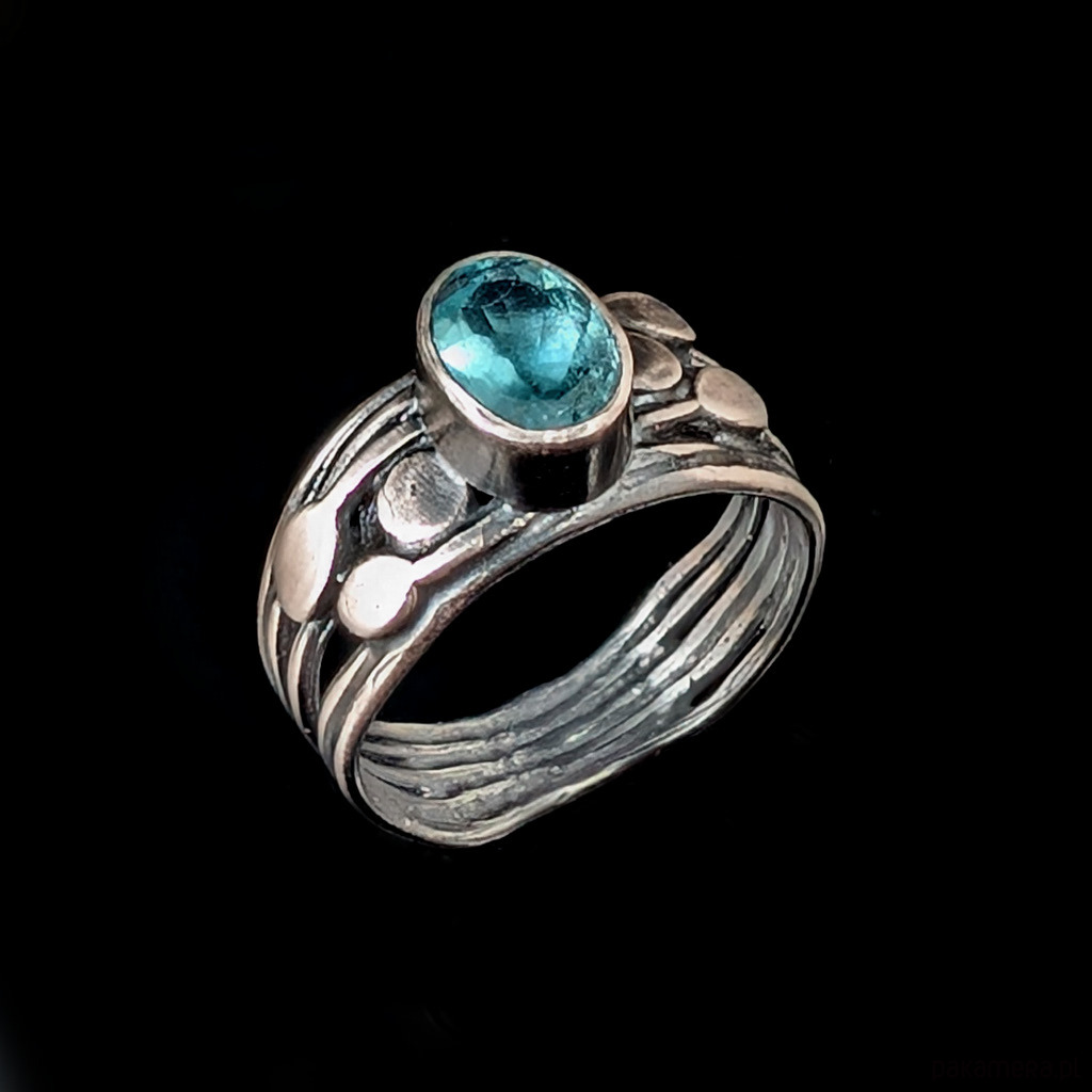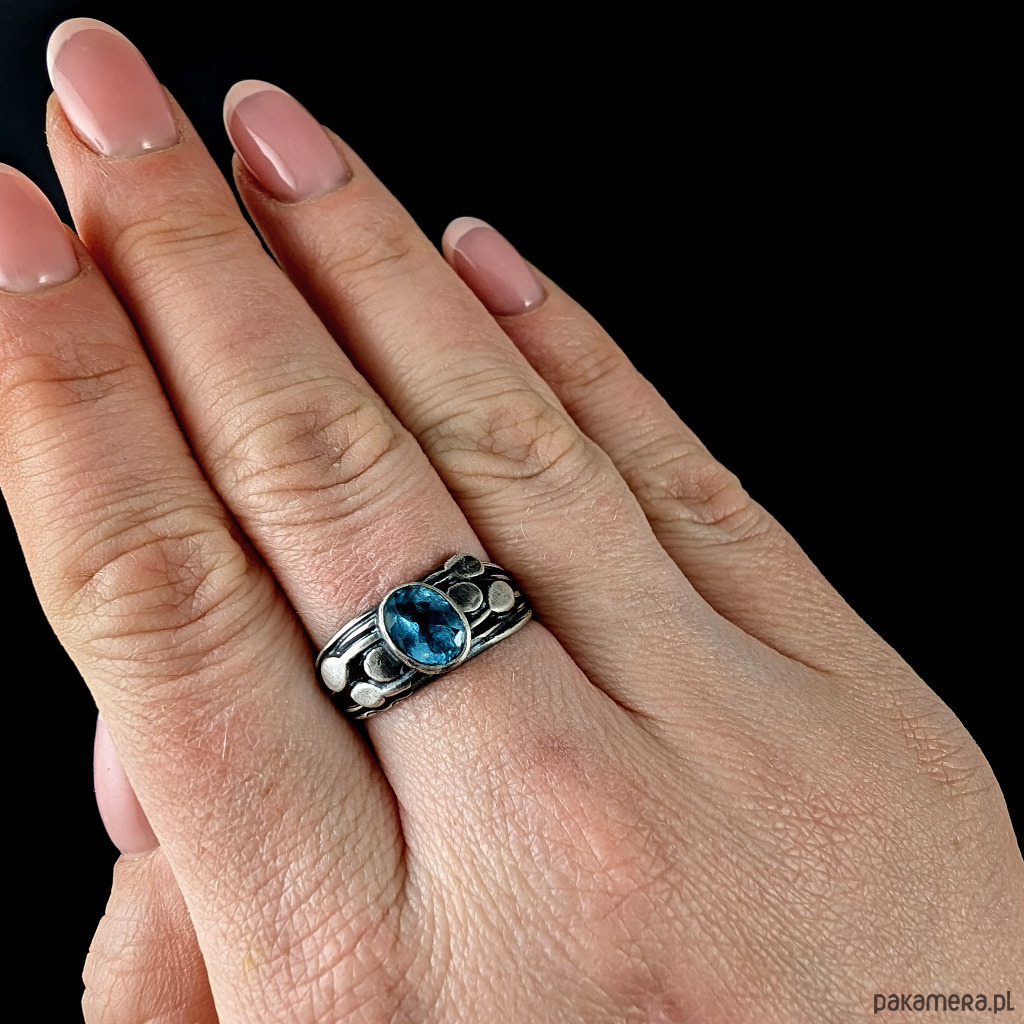 Pierścionek ze szlachetnym, rzadkim kamienim cyrkonem oprawionym w oksydowane srebro 925. Kamień elegancko fasetowany. Rozmiar jubilerski 17, mogę powiększyc na max 18. Obrączka ma 8 mm szerokości. Oprawa kamienia 8 x 6 mm. Waga 4,66 g. Pierścień zostanie zapakowany w ozdobne puedełeczko.