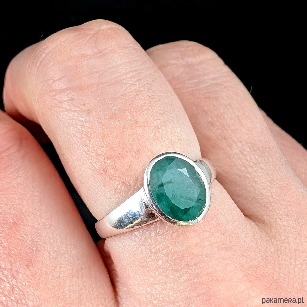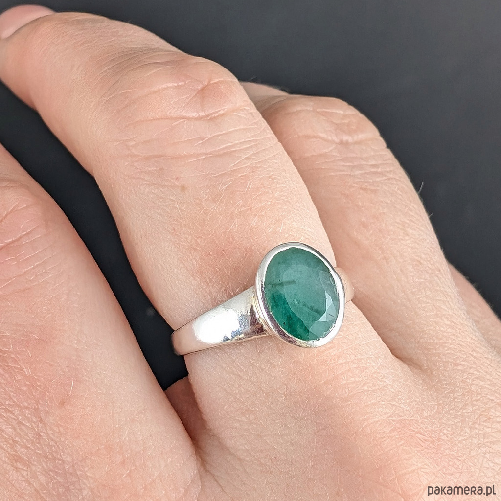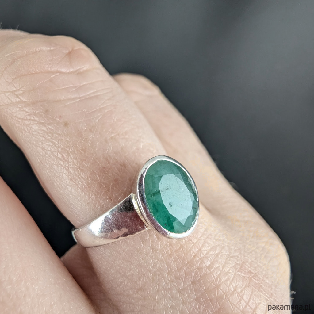 Pierścień z oprawionym w srebro próby 925 pięknym, fasetowanym szmaragdem. Szerokość obrączki max 4 mm. Kamień ma oprawę 10 x 8 mm. Rozmiar jubilerski 12, dostępne również inne rozmiary. Waga 2,5 g. Wykonany przez dostawcę kamieni. Pierścień zapakowany zostanie w ozdobne pudełeczko.