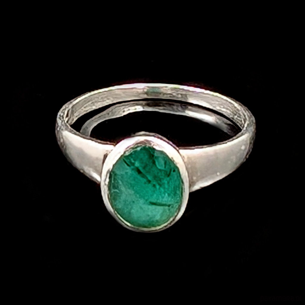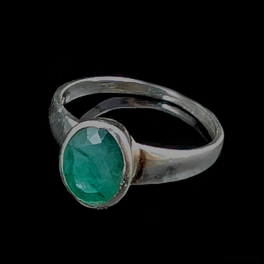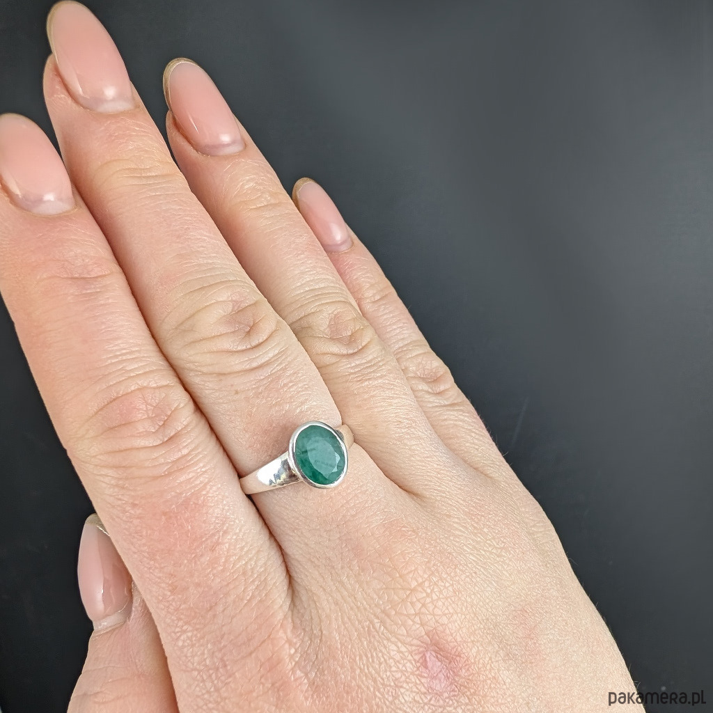 Pierścień z oprawionym w srebro próby 925 pięknym, fasetowanym szmaragdem. Szerokość obrączki max 4 mm. Kamień ma oprawę 10 x 8 mm. Rozmiar jubilerski 12, dostępne również inne rozmiary. Waga 2,5 g. Wykonany przez dostawcę kamieni. Pierścień zapakowany zostanie w ozdobne pudełeczko.