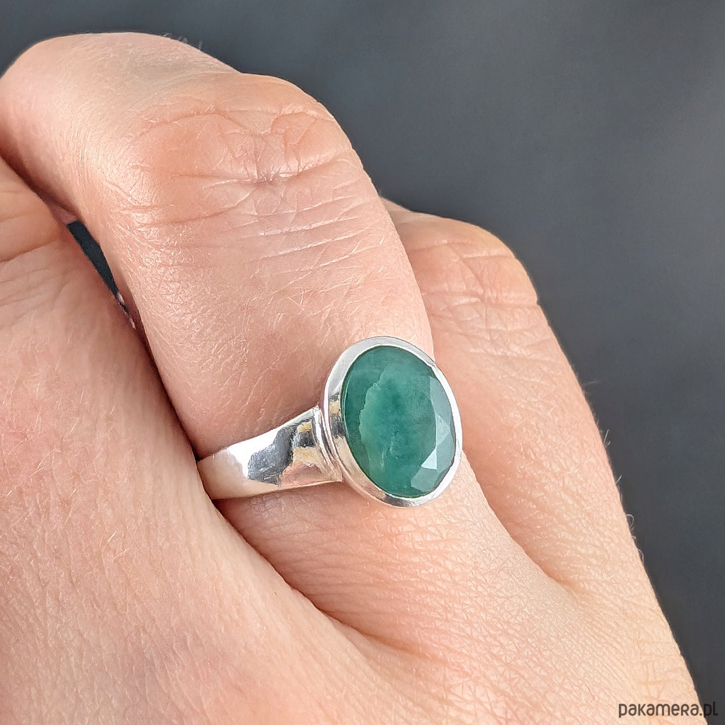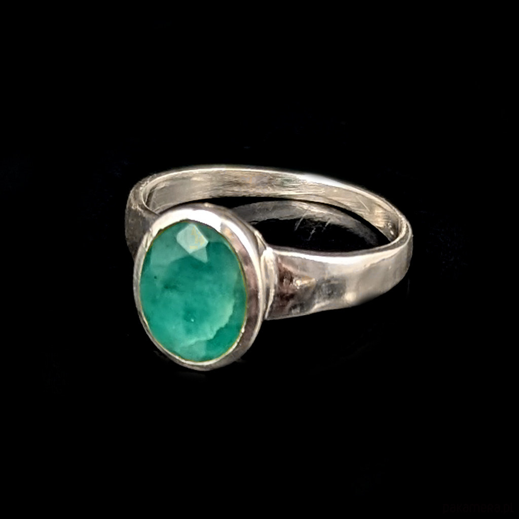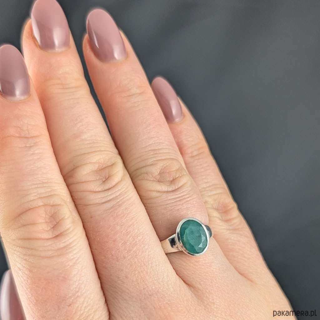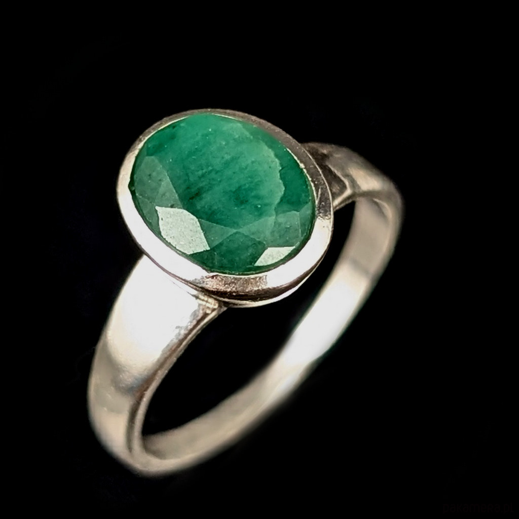 Pierścień z oprawionym w srebro próby 925 pięknym, fasetowanym szmaragdem. Szerokość obrączki max 4 mm. Kamień ma oprawę 10 x 8 mm. Rozmiar jubilerski 15, dostępne również inne rozmiary. Waga 2,66 g. Wykonany przez dostawcę kamieni. Pierścień zapakowany zostanie w ozdobne pudełeczko.