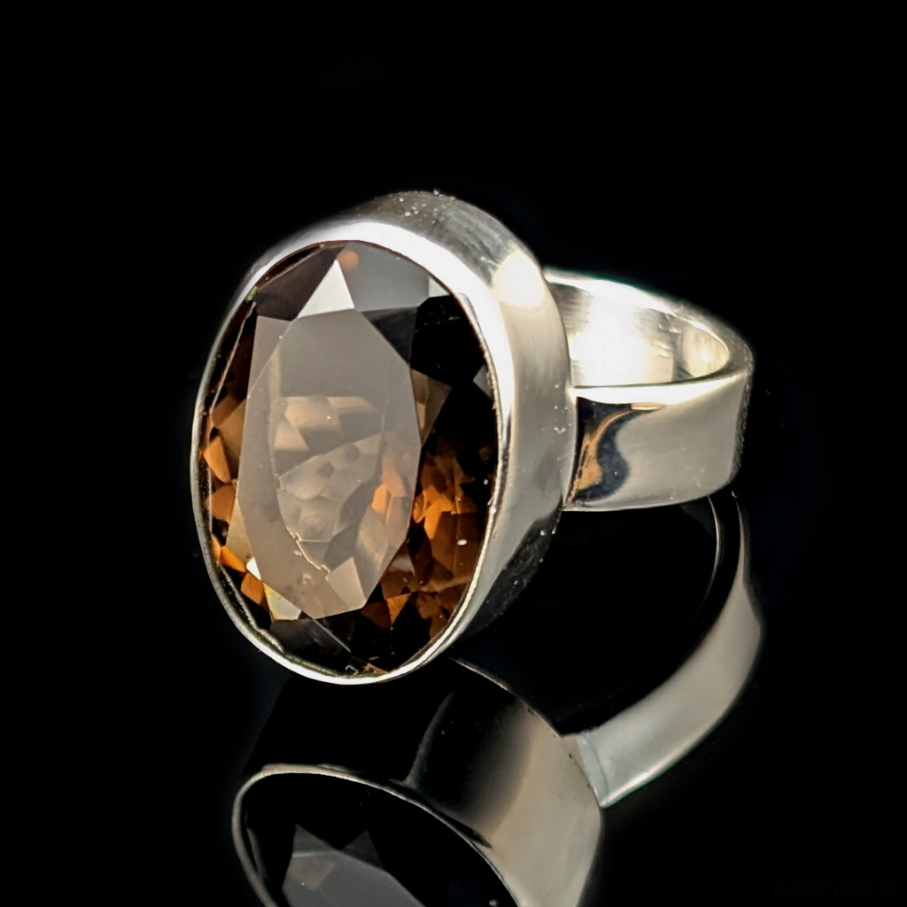 Pierścień wykonany ze srebra próby 925 oraz okazałego kwarcu dymnego w pięknym szlifie. Wymiary oprawy 18 x 13 mm, waga to 7,8 grama. Rozmiar jubilerski 14. Obrączka ma szerokość 5 mm. Zostanie zapakowany w ozdobne pudełeczko. Wykonany przez dostawcę kamieni,