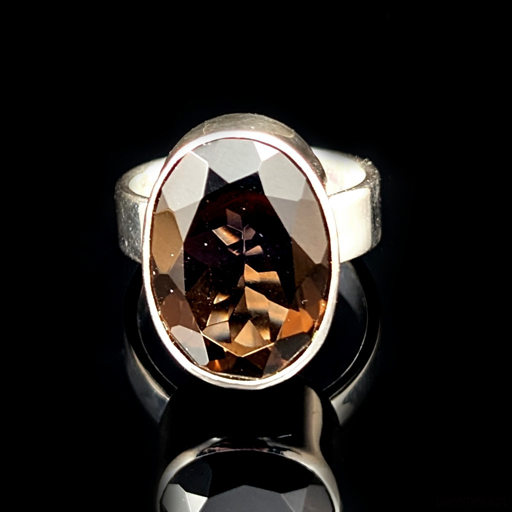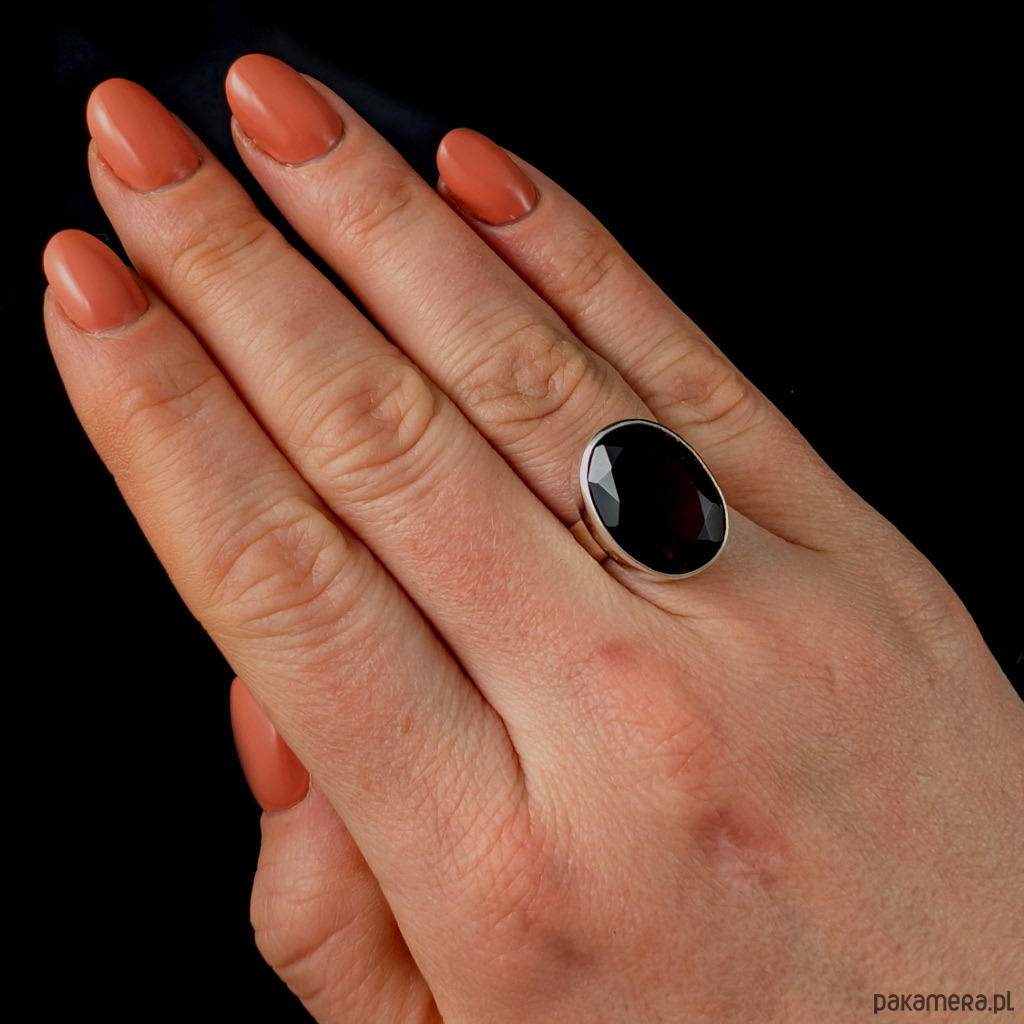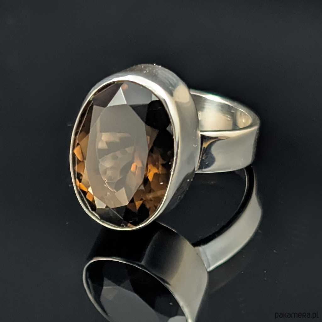Pierścień wykonany ze srebra próby 925 oraz okazałego kwarcu dymnego w pięknym szlifie. Wymiary oprawy 18 x 13 mm, waga to 7,8 grama. Rozmiar jubilerski 14. Obrączka ma szerokość 5 mm. Zostanie zapakowany w ozdobne pudełeczko. Wykonany przez dostawcę kamieni,