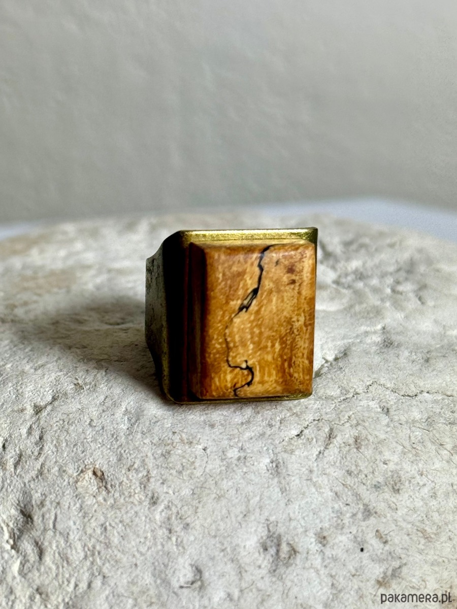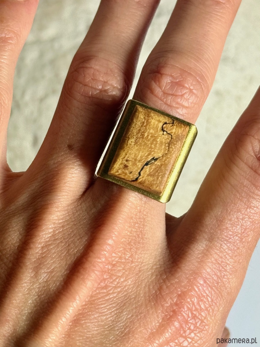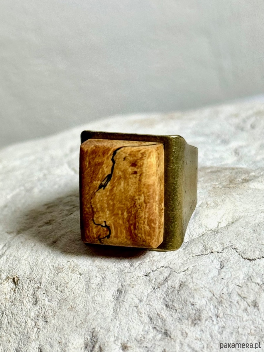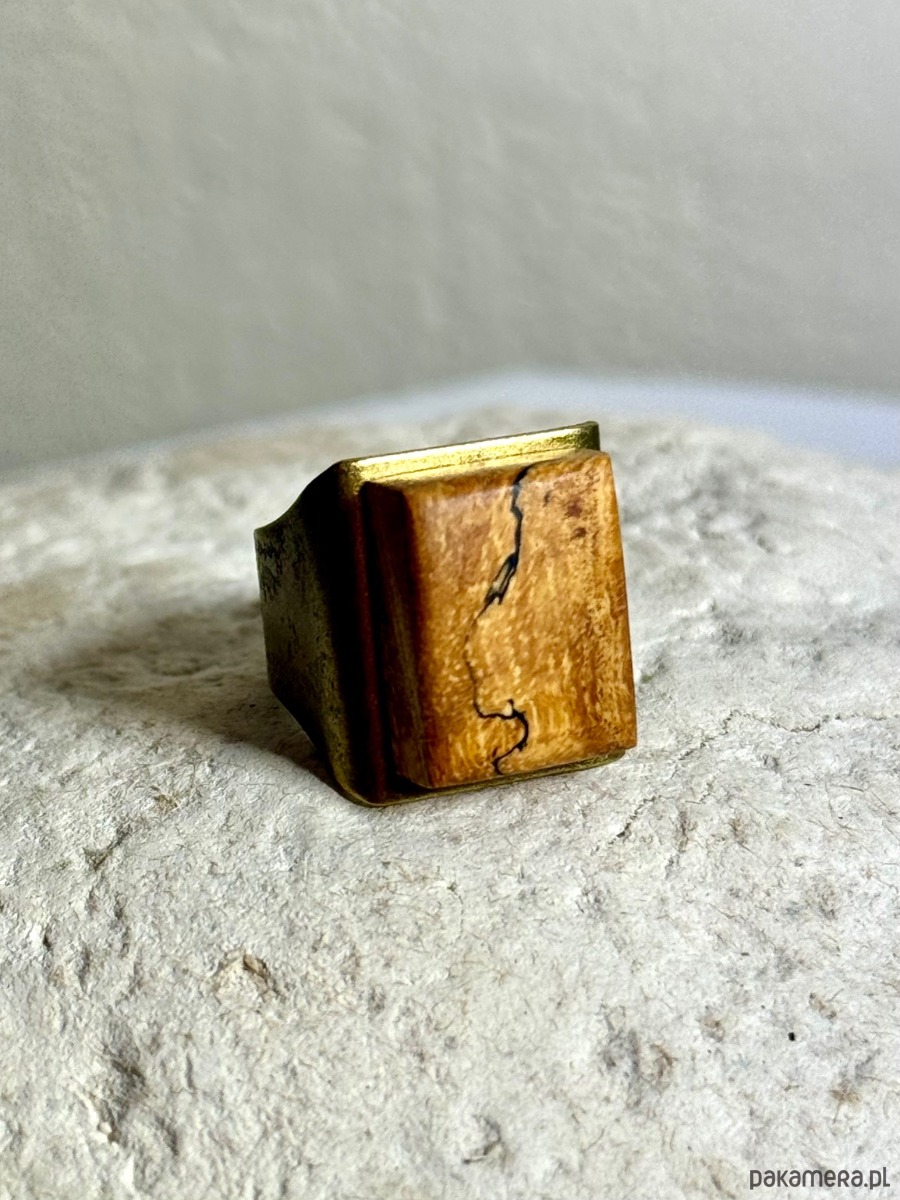 Duży, regulowany pierścionek, wykonany ręcznie z litego, zagrzybionego drewna tamaryndowca. To unikatowe drewno jest poszukiwane przez artystów na całym świecie ze względu na swoje niepowtarzalne wzory – nieregularne, ciemne linie i marmurkowate strefy, stworzone w wyniku naturalnego procesu biologicznego.