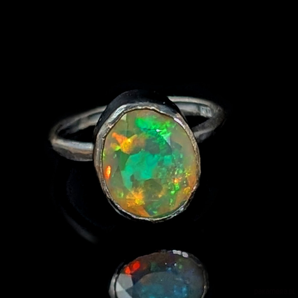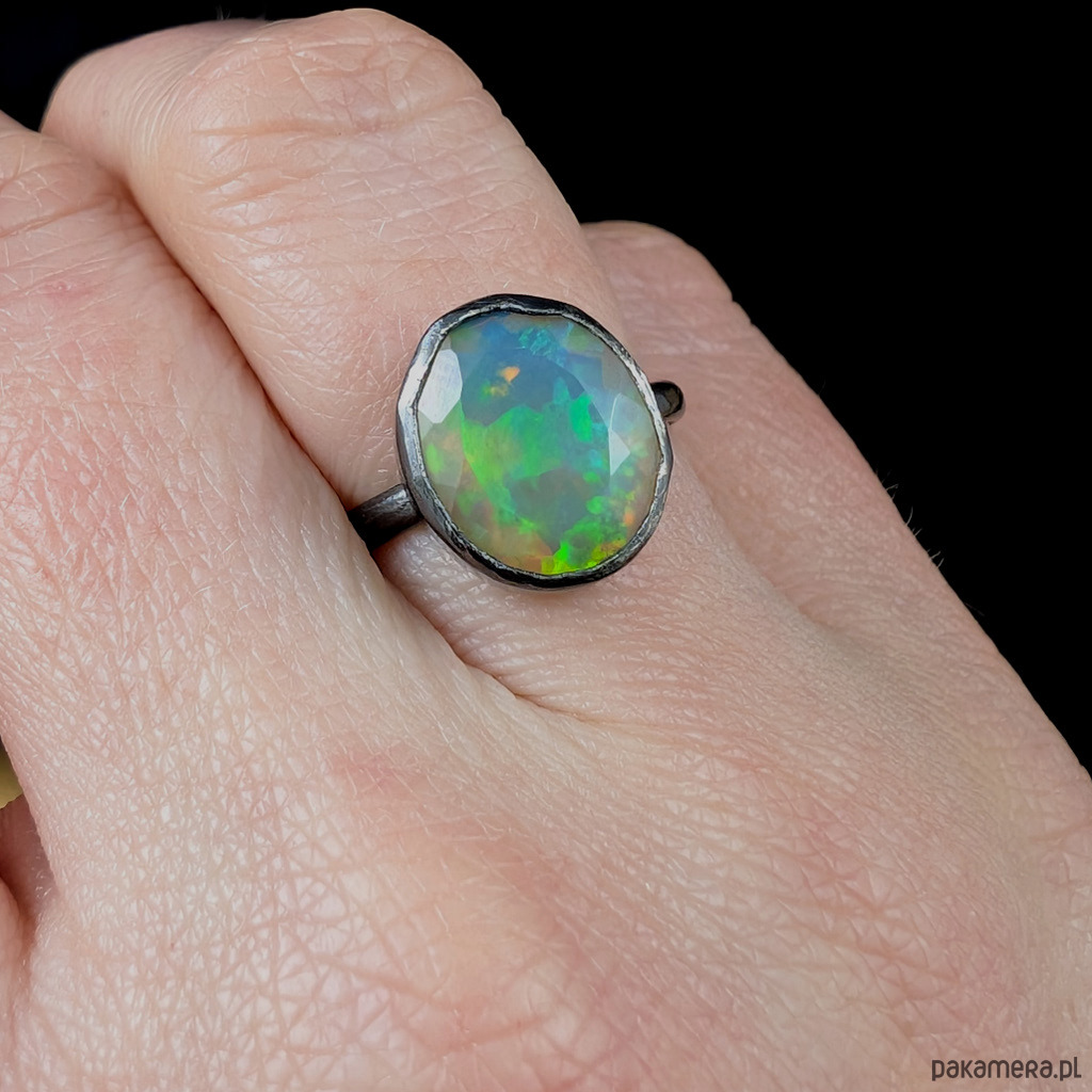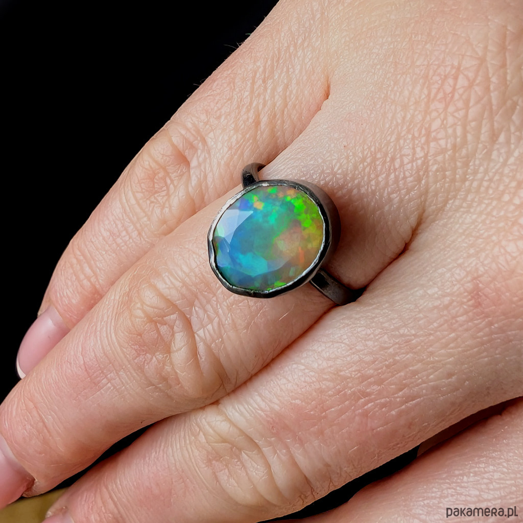 Elegancki pierścień z oprawionym w srebro próby 925 przepięknym, baśniowym opalem z Etiopii.