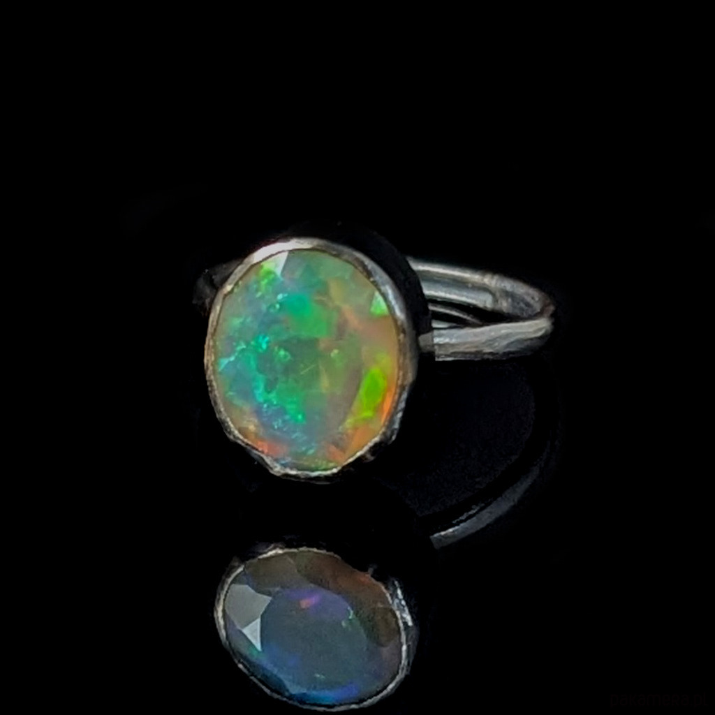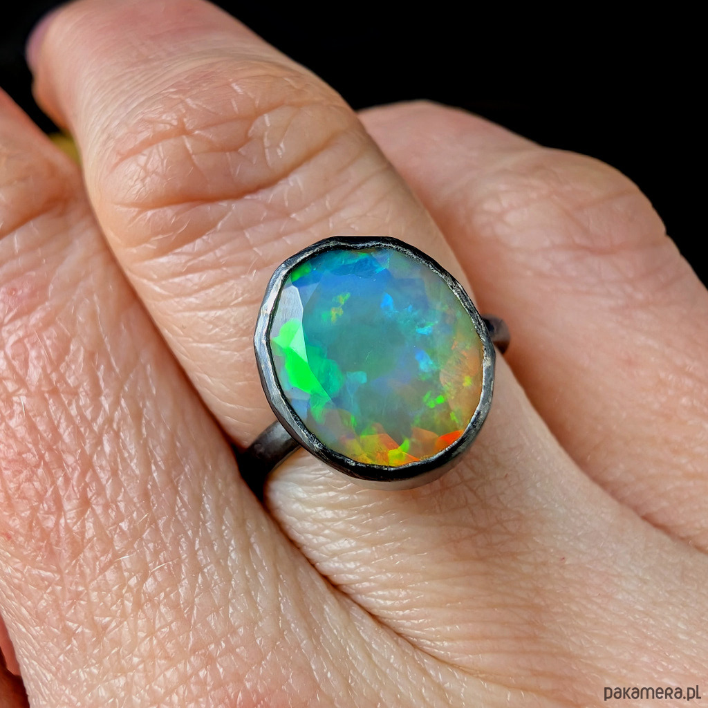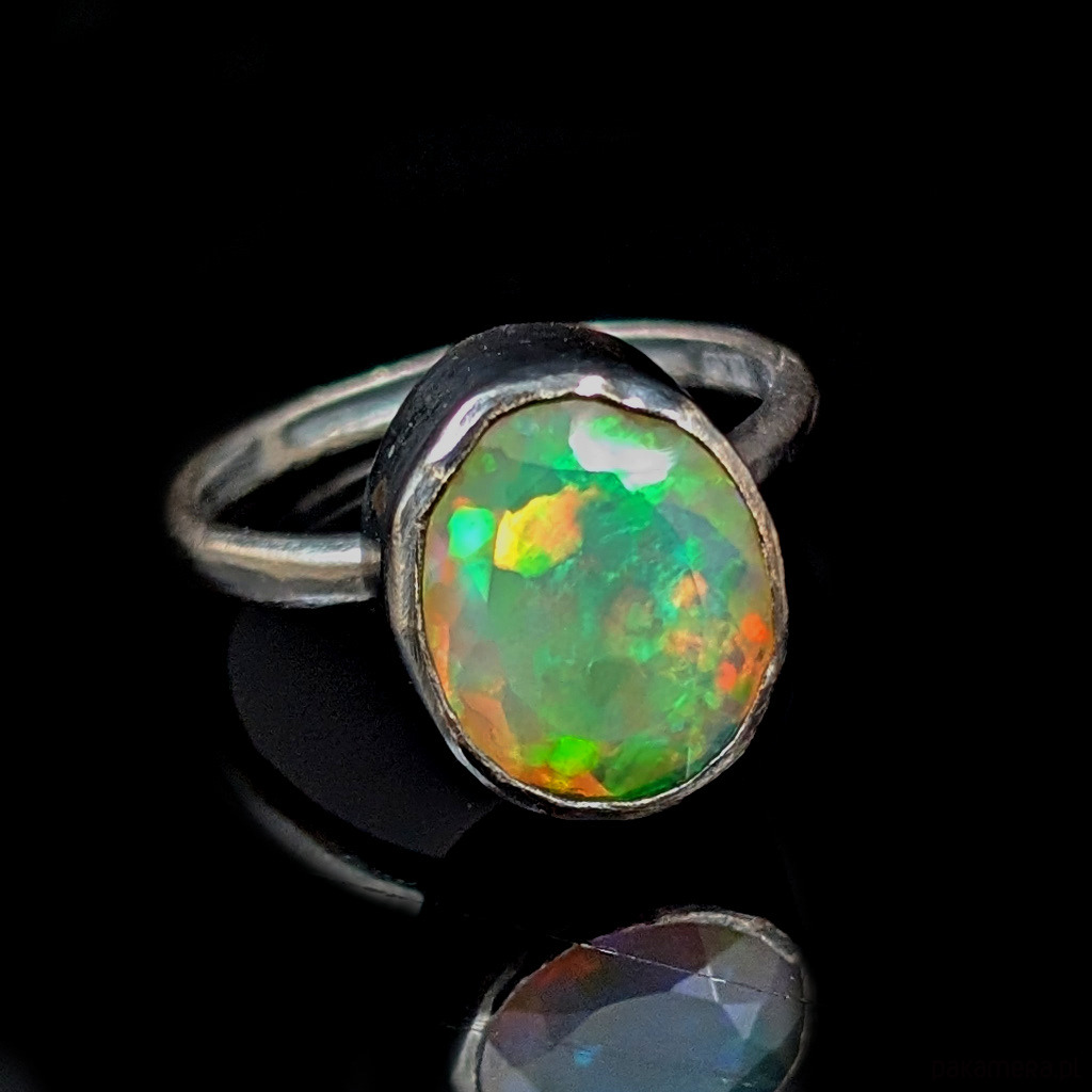 Elegancki pierścień z oprawionym w srebro próby 925 przepięknym, baśniowym opalem z Etiopii.