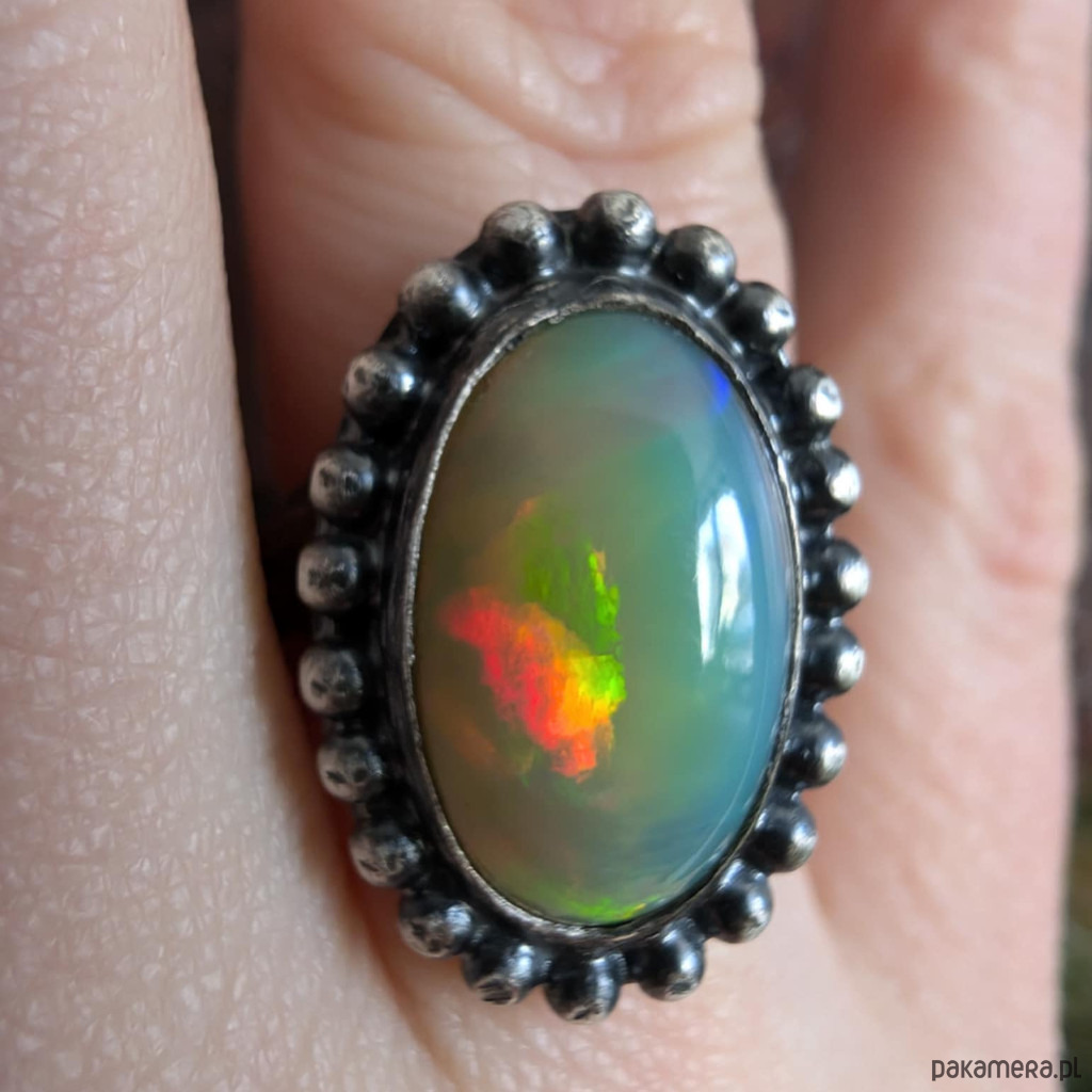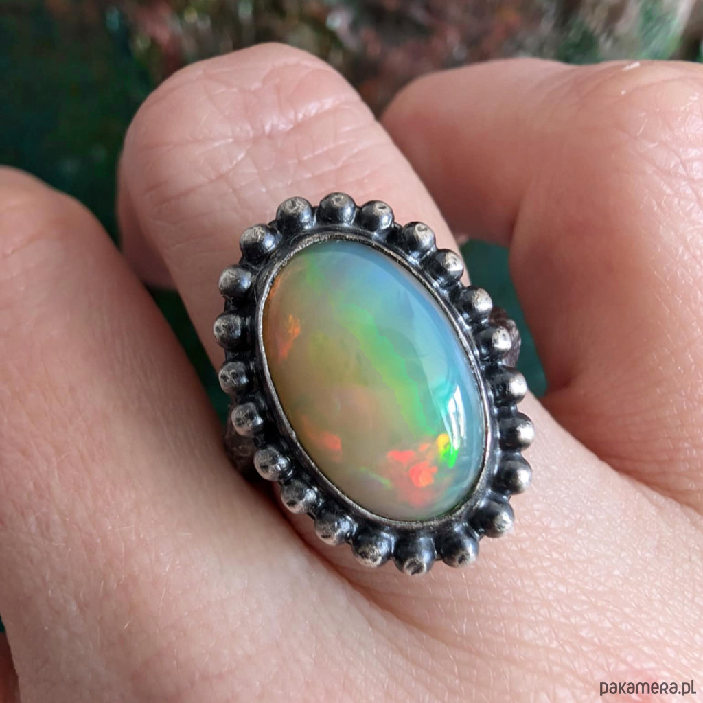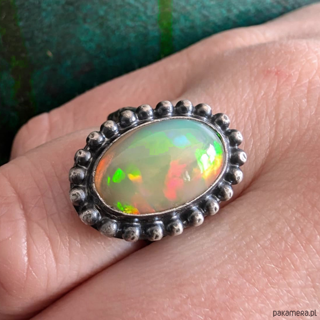 Pierścionek wykonany z oksydowanego srebra próby 925. Rozmiar pierścionka dzięki otwartej podstawie regulowany, mogę dopasować na dowolny rozmiar w zakresie 9-23 Ozdobą pierścionka jest multibarwny, piękny opal z Etiopii. Wymiary oprawy kamienia 22 x 15 mm, szerokość maksymalna obrączki 6 mm, min. 4 mm. Waga 7,14 g. Pierścień zostanie zapakowany w ozdobne pudełeczko.