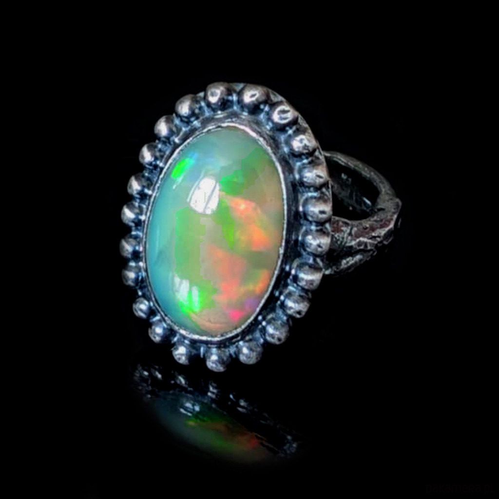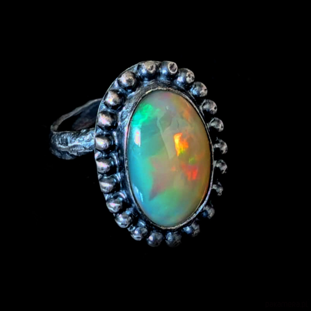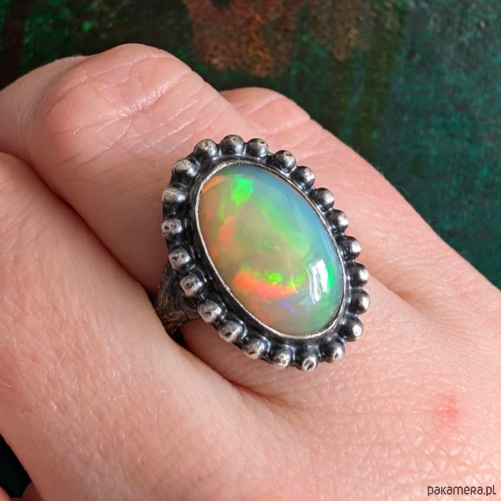 Pierścionek wykonany z oksydowanego srebra próby 925. Rozmiar pierścionka dzięki otwartej podstawie regulowany, mogę dopasować na dowolny rozmiar w zakresie 9-23 Ozdobą pierścionka jest multibarwny, piękny opal z Etiopii. Wymiary oprawy kamienia 22 x 15 mm, szerokość maksymalna obrączki 6 mm, min. 4 mm. Waga 7,14 g. Pierścień zostanie zapakowany w ozdobne pudełeczko.