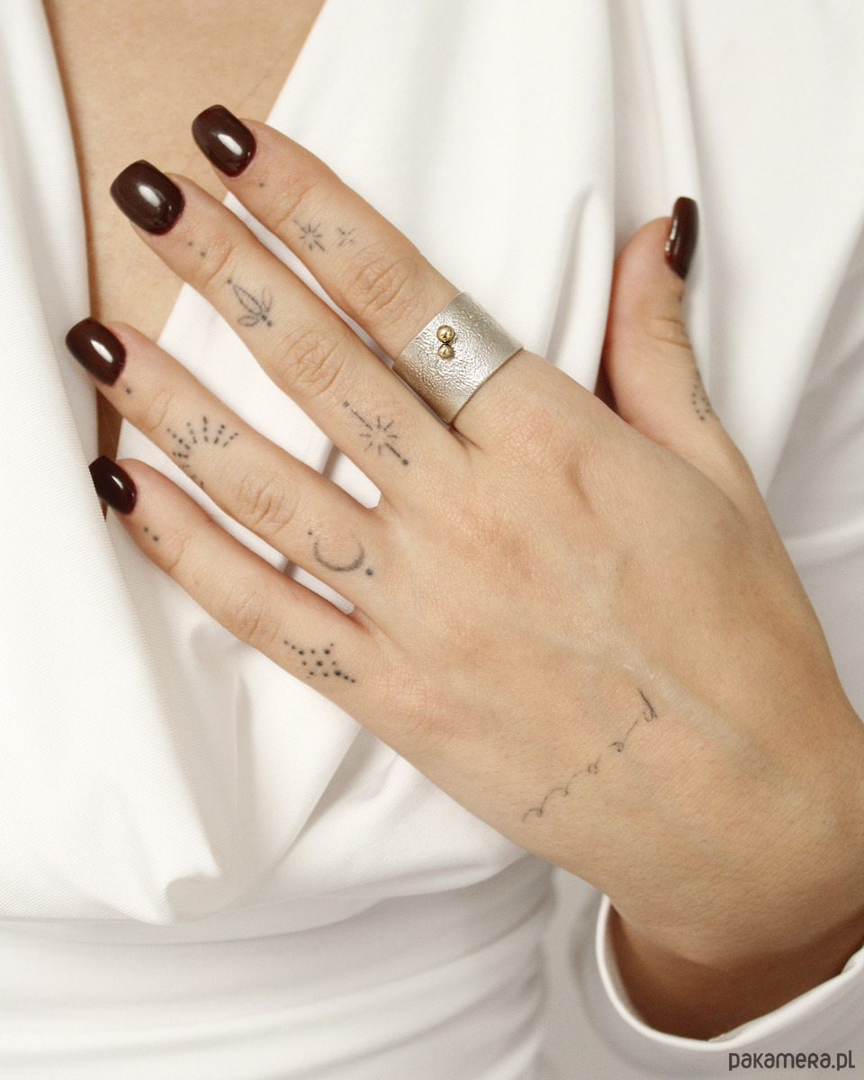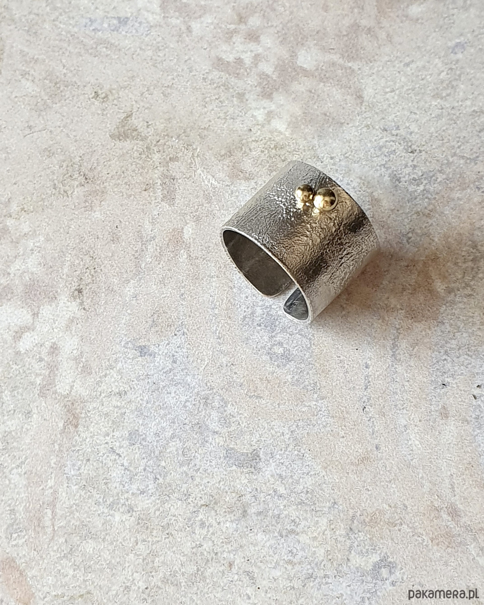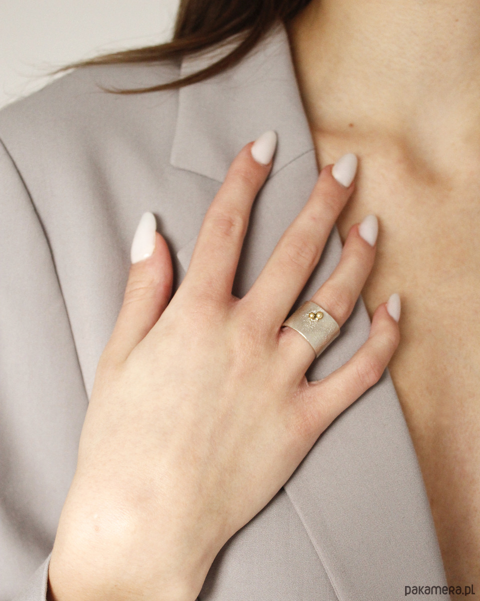 Wysokość pierścionka to ok. 1,5 cm. Istnieje możliwość delikatnej regulacji rozmiaru, dzięki otwartej formie.