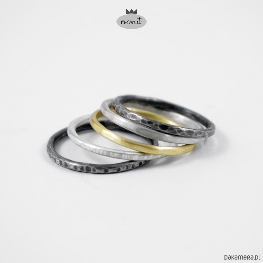 Mix obrączek fakturowanych, satynowanych, oksydowanych. Jedna złocona, dwie oksydowane.