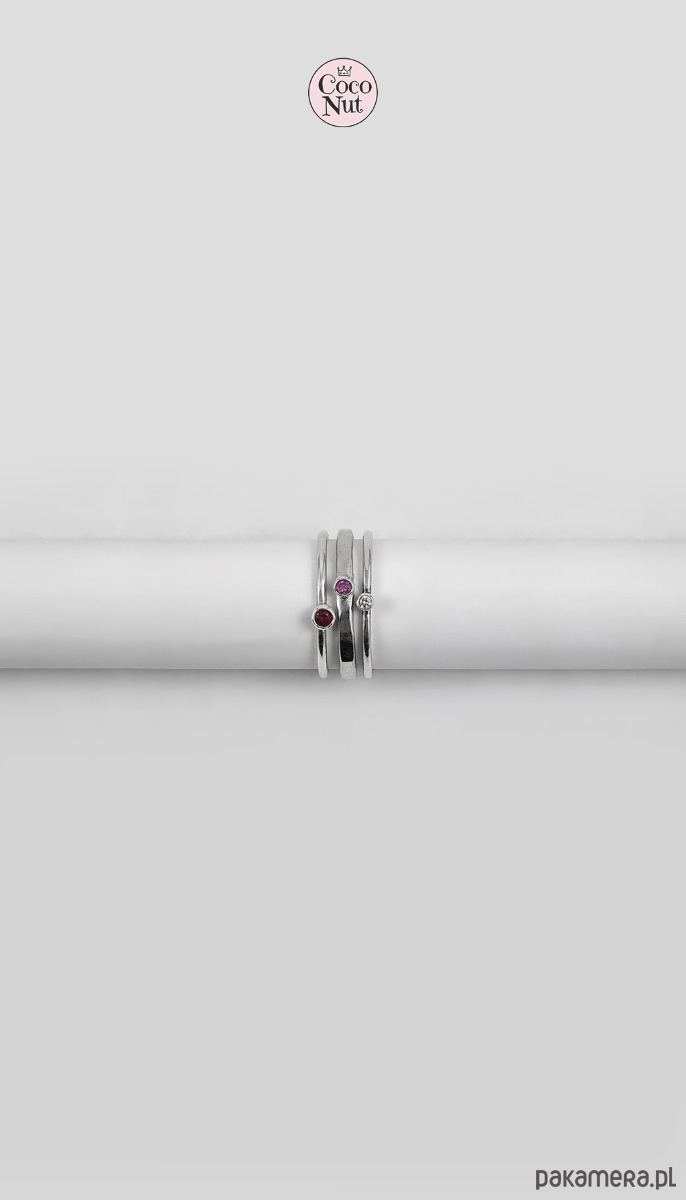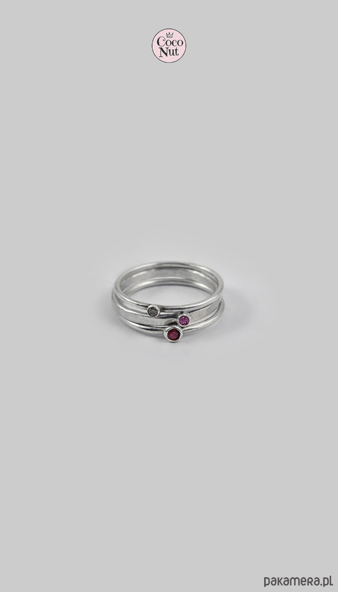 Zestaw: trzy pierścionki z naturalnymi kamieniami wysokiej jakości: białym topazem, różowym turmalinem oraz rubinem, kamienie naturalne fasetowane ok. 2 mm, srebro 925. Obrączki o szerokości 1,5 - 2,5 mm.