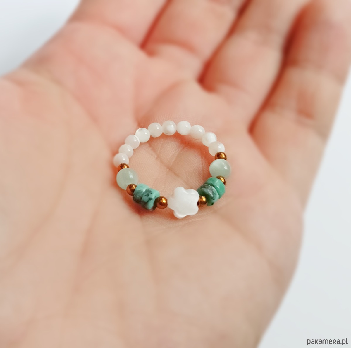Pierścionek : turkus, angelit, muszla, hematyt