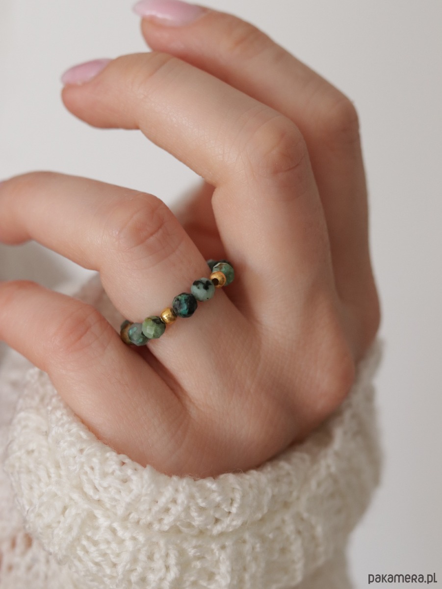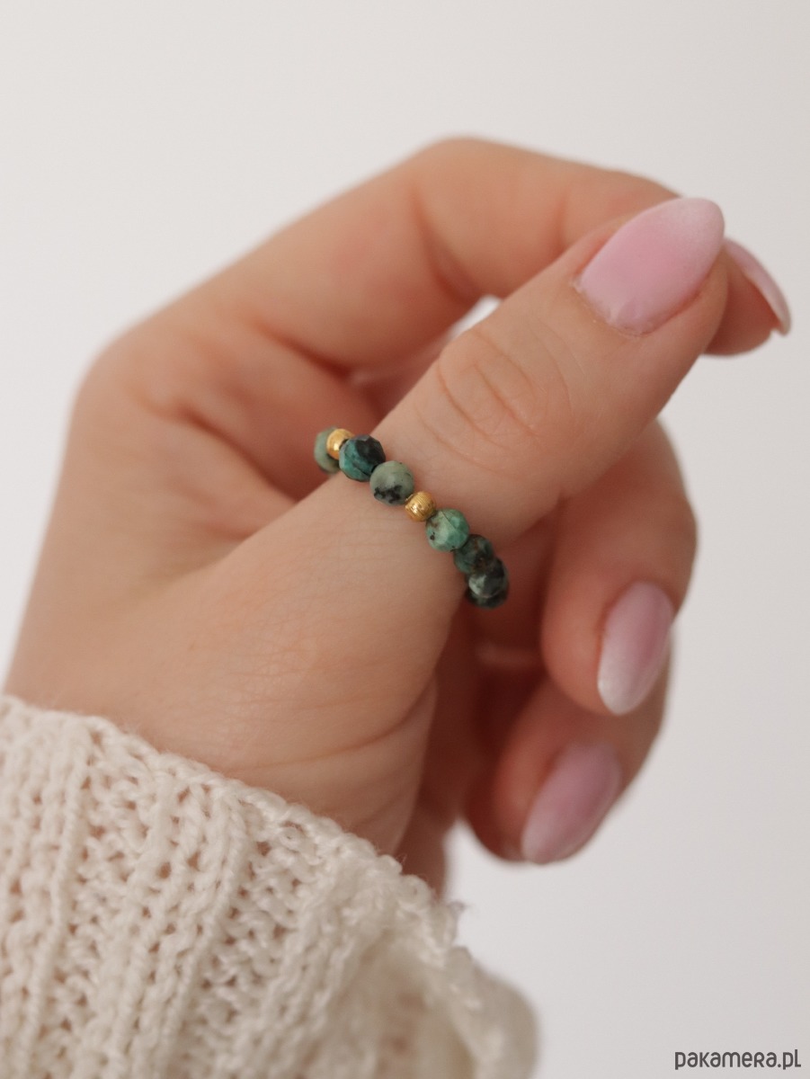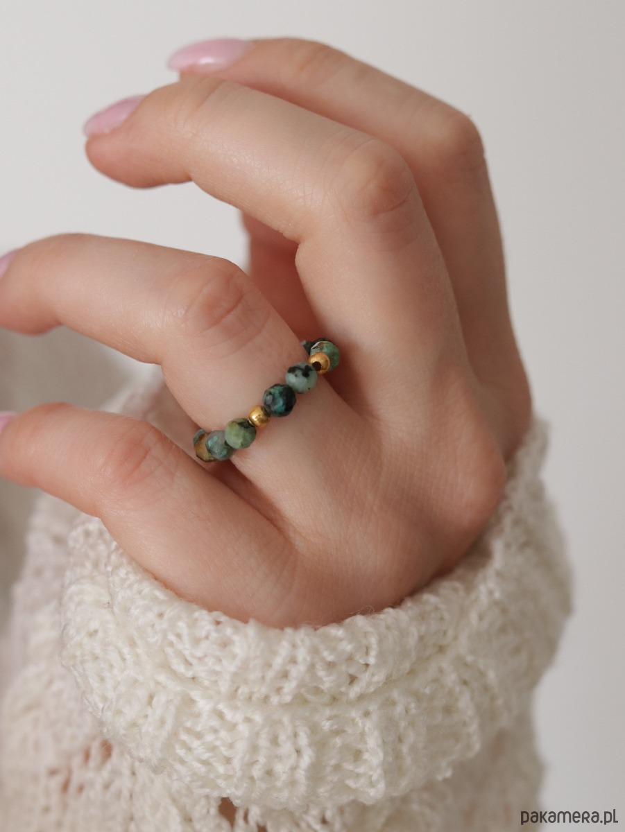 Pierścionek z naturalnych kamieni turkusu , przelatany przekładką ze stali szlachetnej pozłacanej .