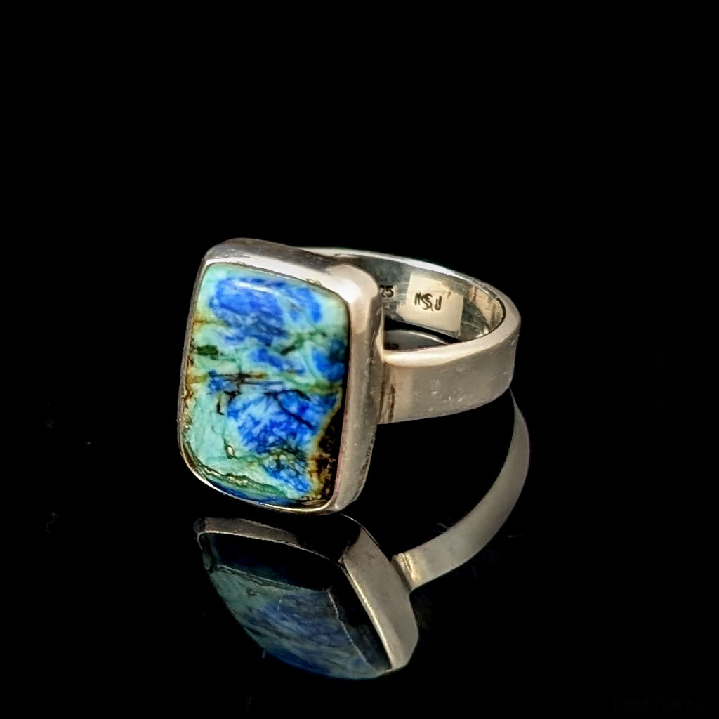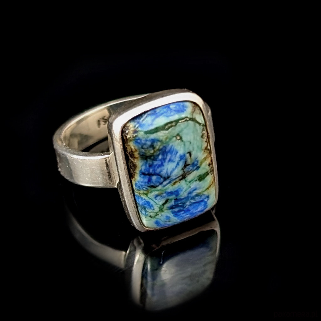 Pierścień, który zdobi wyjątkowy okaz turkusu z azurytem.