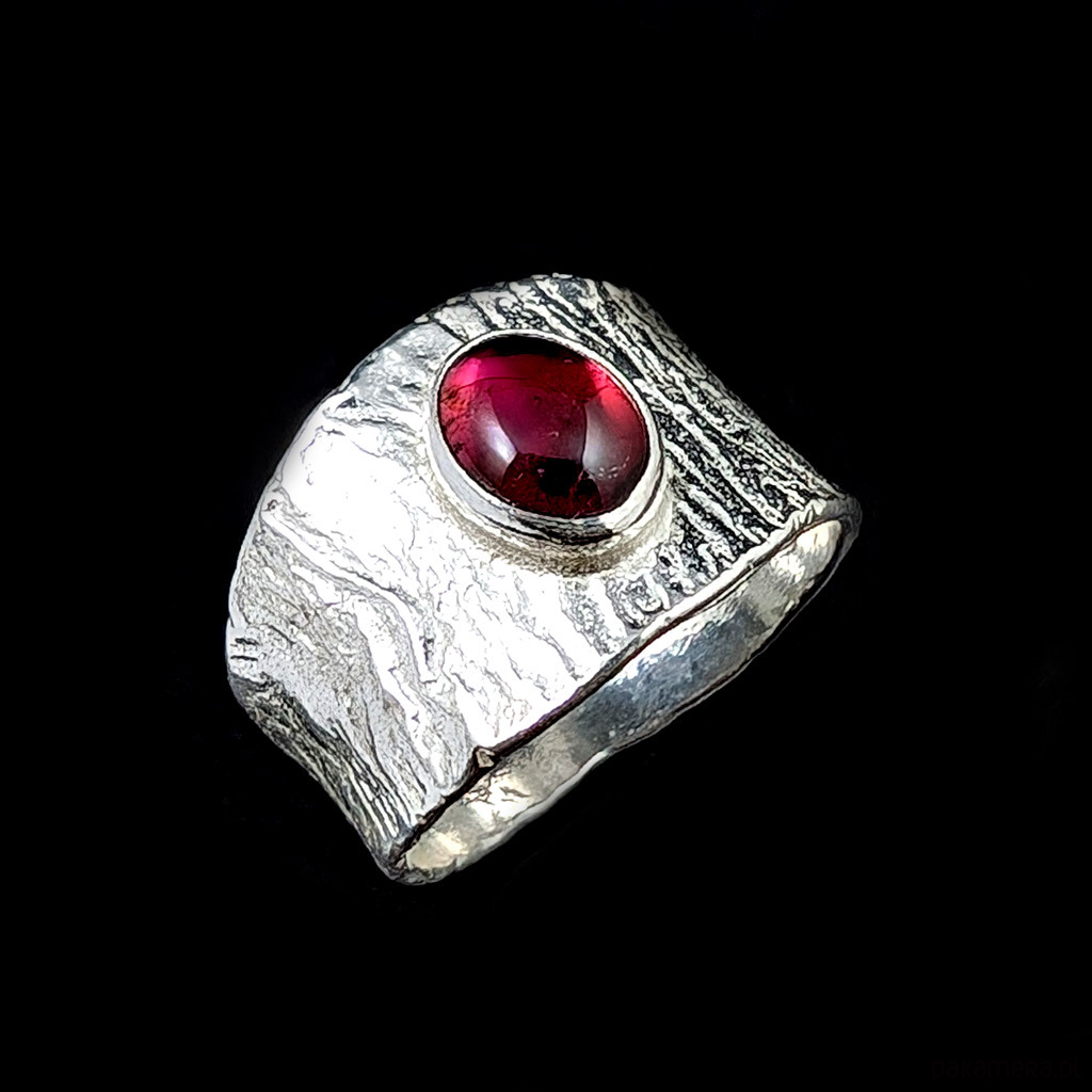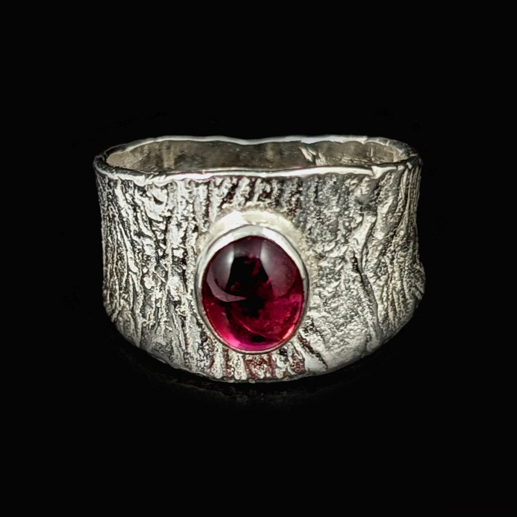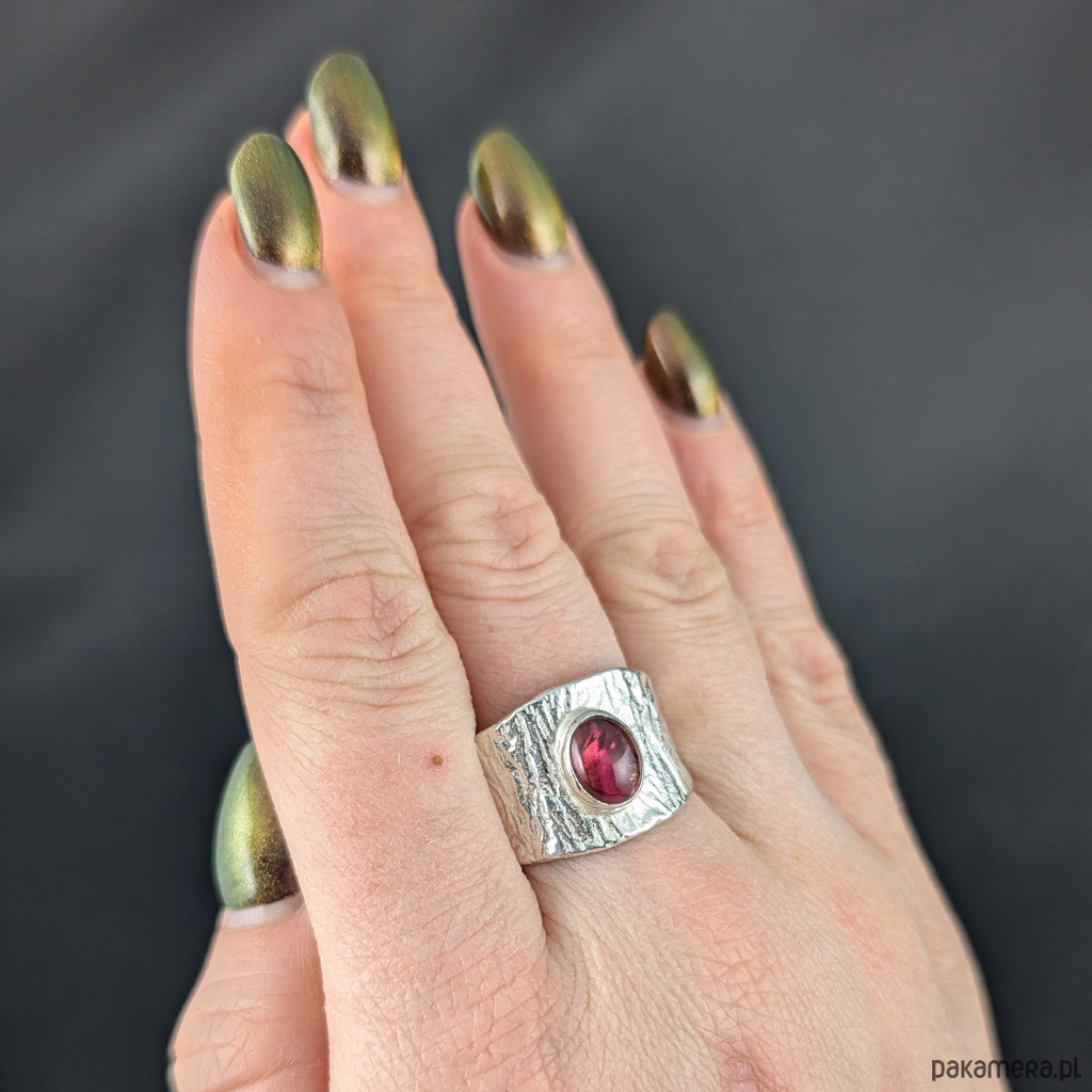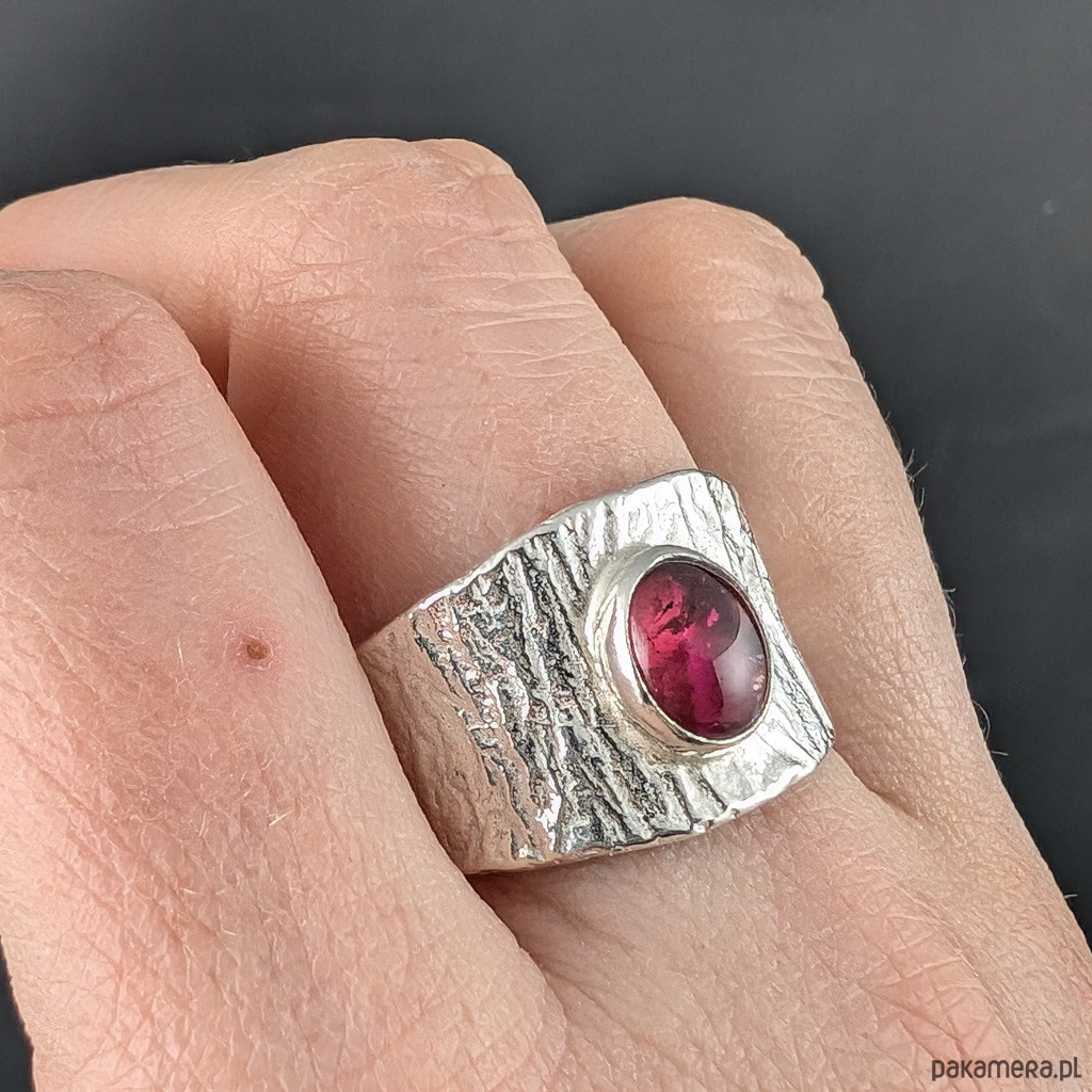 Piękny, rzadki i poszukiwany w jubilerstwie rubelit- cenna odmiana turmalinu. Kamień zakomponowany w oprawę srebra pr. 925. Szeroka na 14 mm obrączka przypomina korę drzewa. Wymiary oprawy kamienia 9 x 7 mm, waga 8,2 grama. Rozmiar jubilerski 24, mogę powiększyć na max 25. Pierścień zostanie zapakowany w eleganckie pudełeczko.