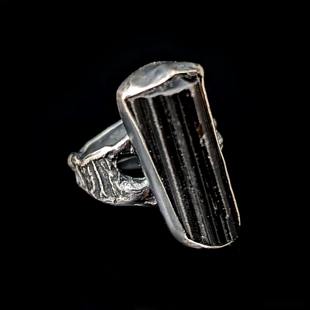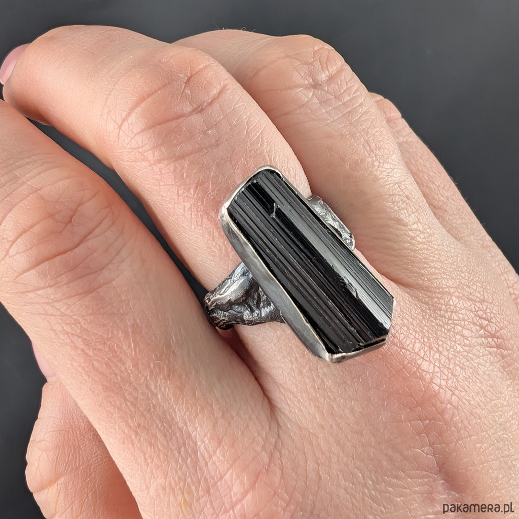 Oryginalny pierścionek wykonany z oksydowanego srebra próby 925 oraz turmalinu czarnego. Asymetryczna, stapiana obrączka. Wymiary oprawy 25 x 12 mm. Pierścień będzie pasował na rozmiar jubilerski 16, mogę powiększyć do MAX 17. Waga 9,4 grama. Pierścionek zostanie zapakowany w ozdobne pudełeczko