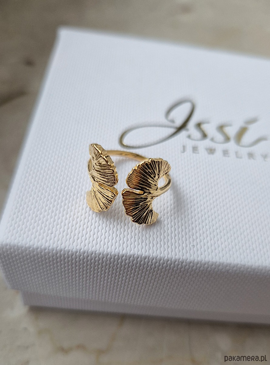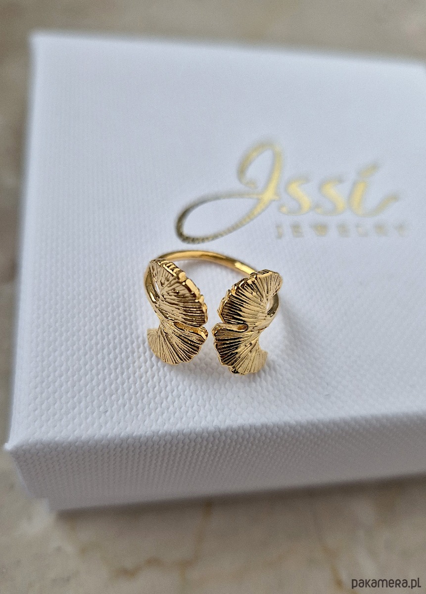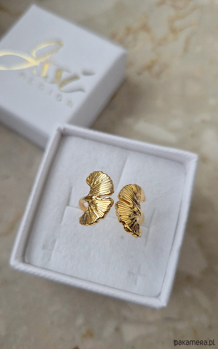 Delikatny pierścionek w kształcie liści miłorzębu japońskiego , wykonany ze srebra próby 925, srebra pokrytego 24 karatowym złotem lub 18 karatowym różowym złotem.