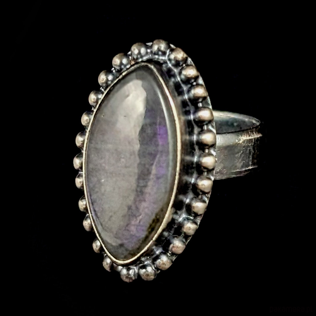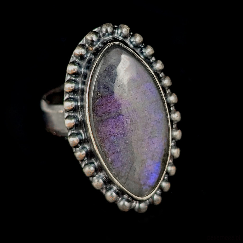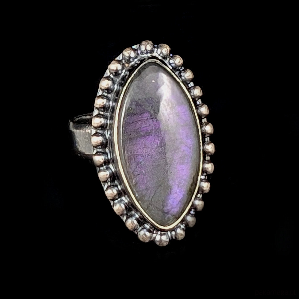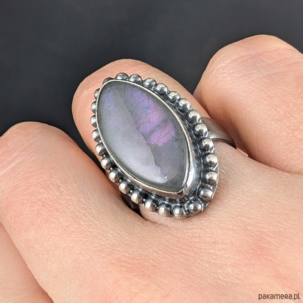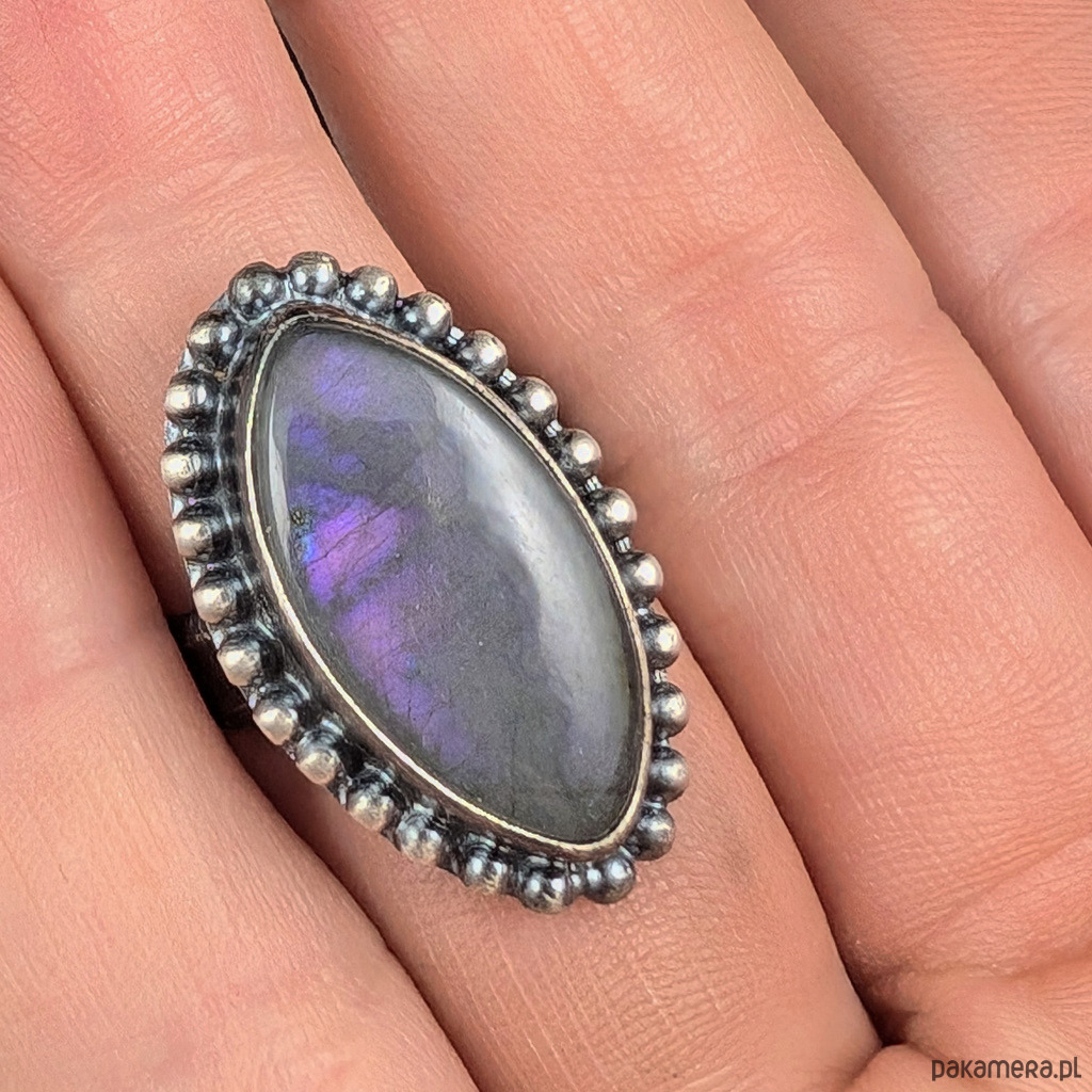 Pierścionek z oprawionym w oksydowane srebro próby 925 labradorytem o fioletowej tafli. Oprawa 27 x 17 mm, Rozmiar jubilerski regulowany w szerokim zakresie, proszę napisać na jaki dopasować. Obrączka ma szerokość 5 mm. Waga 10 g. Pierścień zostanie wysłany w ozdobnym pudełeczku.