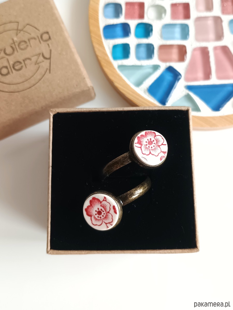 Oto pierścionek z dwoma oczkami, które wykonałam z fragmentów stłuczonego talerza Villeroy & Boch w ciemnoczerwone wzory. Kawałki stłuczki oszlifowałam w okrągłe kształty i połączyłam z metalową bazą w kolorze mosiądzu. Baza jest regulowana - będzie pasowała na każdy rozmiar. Ceramikę zeszlifowałam również z grubości - jest cieńsza niż pierwotnie, dzięki czemu pierścionek nie jest ciężki. Brzegi pokryłam lakierem, co sprawia, że nie brudzą się i nie chłoną wilgoci. Średnica elementów ceramicznych: 12 mm. Unikat - każdy z moich wyrobów występuje w jednym egzemplarzu. Upcykling - nie reprodukuję wykorzystywanych wzorów, niczego nie domalowuję - wykorzystuję wyłącznie oryginalne naczynia i motywy, które się na nich znajdują. Tym samym, stłuczce z odzysku nadaję nowe życie.