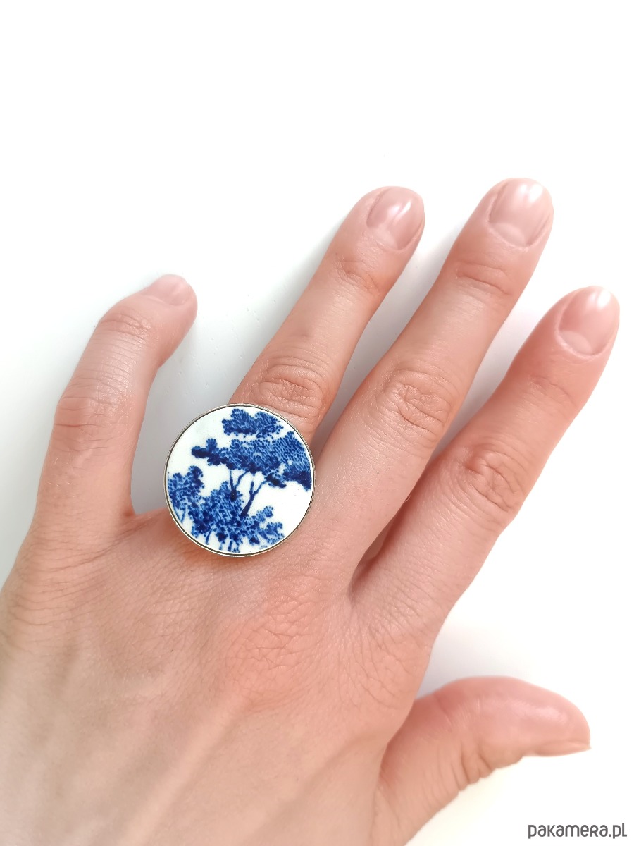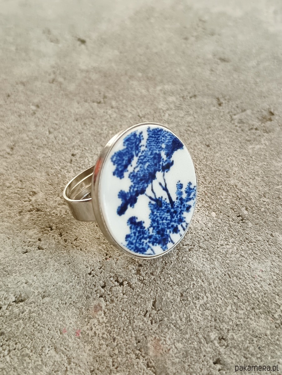 Oto pierścionek, który wykonałam z fragmentu stłuczonego talerza z angielskiego fajansu w kobaltowe wzory. Kawałek stłuczki oszlifowałam w okrągły kształt i połączyłam z metalową bazą w kolorze srebrnym. Baza jest regulowana - będzie pasowała na każdy rozmiar. Ceramikę zeszlifowałam również z grubości - jest cieńsza niż pierwotnie, dzięki czemu pierścionek nie jest ciężki. Brzegi pokryłam lakierem, co sprawia, że nie brudzą się i nie chłoną wilgoci. Średnica elementu ceramicznego: 26 mm. Unikat - każdy z moich wyrobów występuje w jednym egzemplarzu. Upcykling - nie reprodukuję wykorzystywanych wzorów, niczego nie domalowuję - wykorzystuję wyłącznie oryginalne naczynia i motywy, które się na nich znajdują. Tym samym, stłuczce z odzysku nadaję nowe życie.