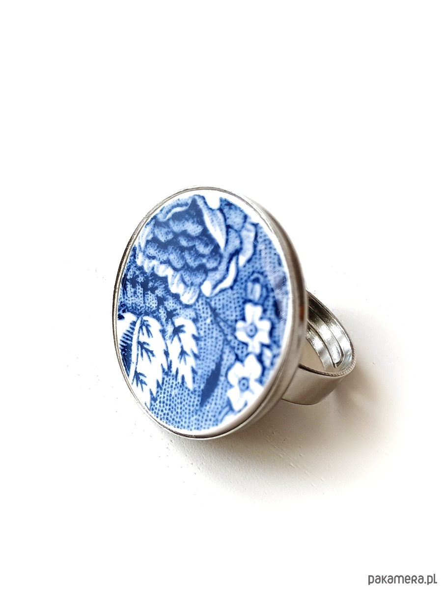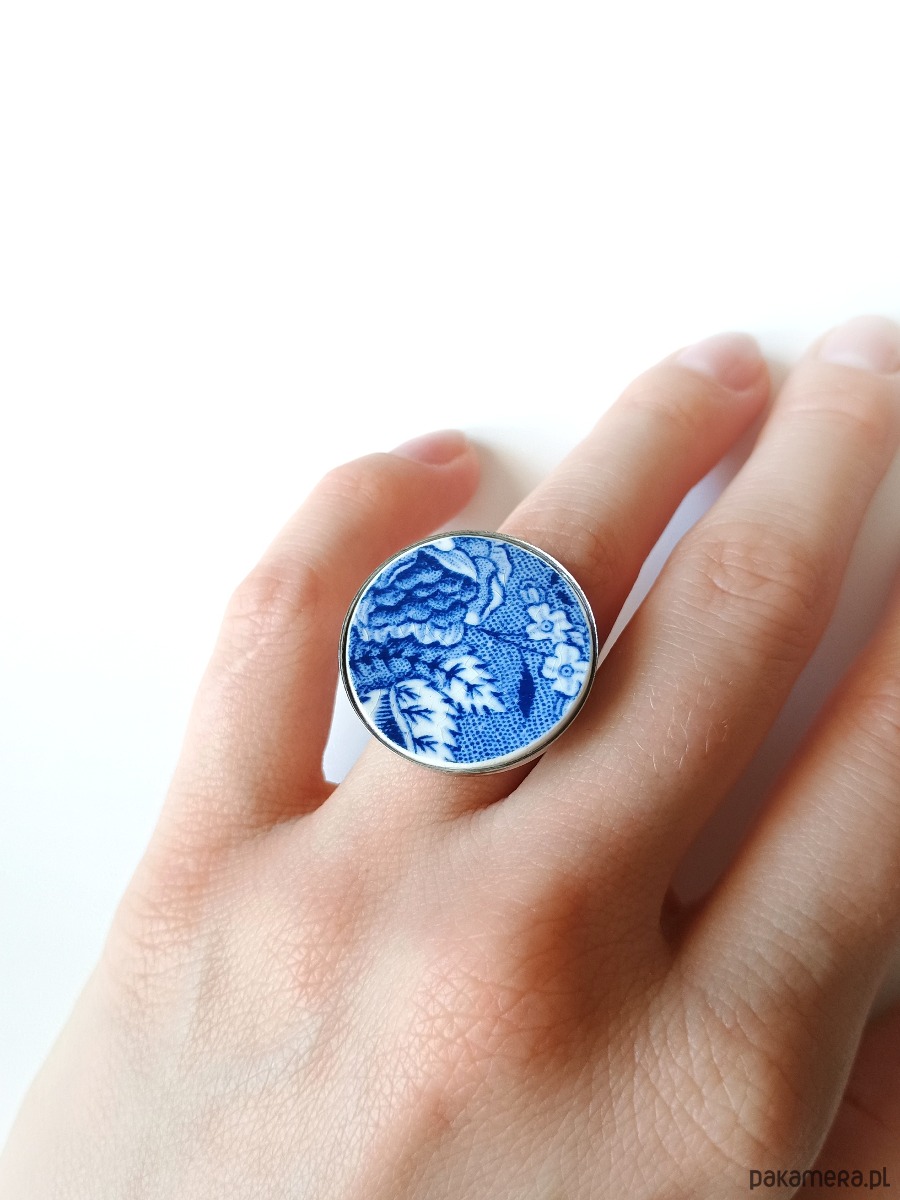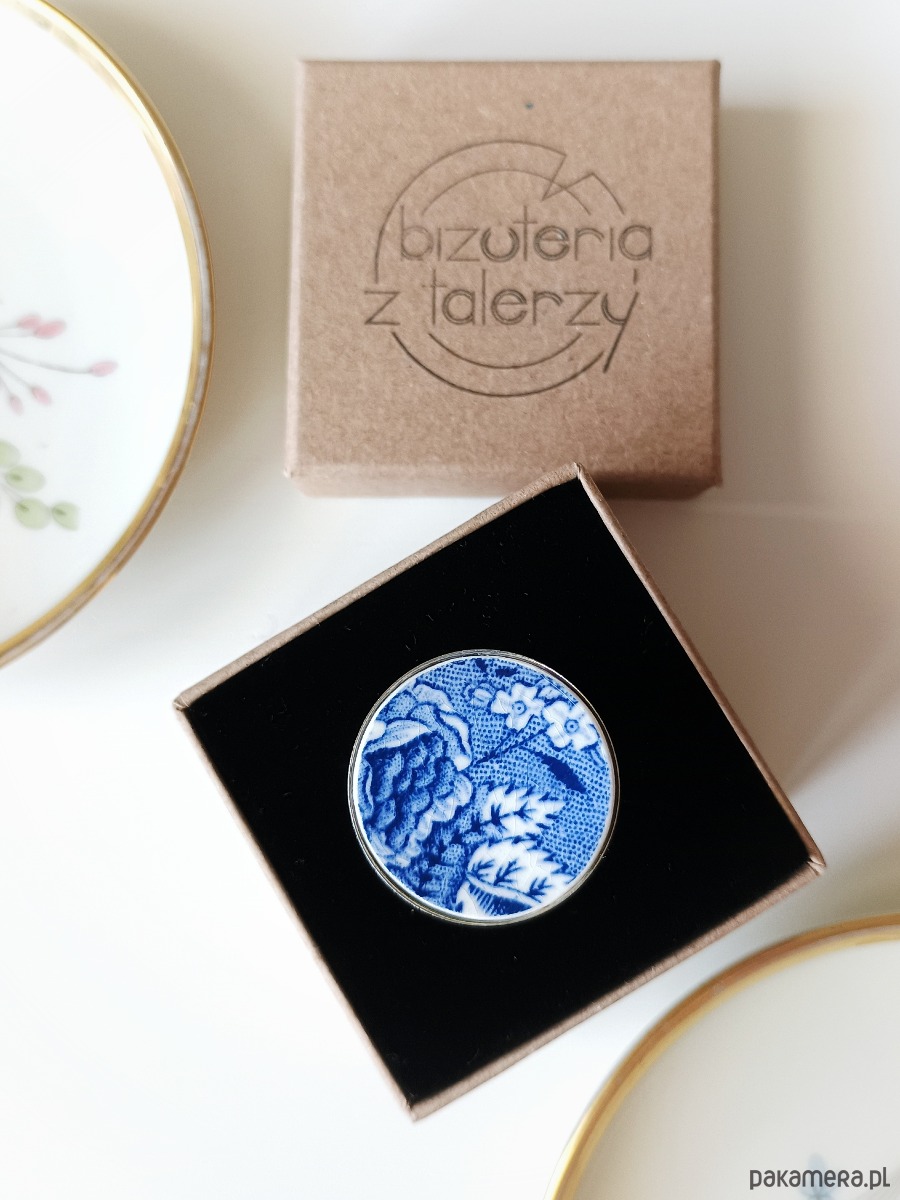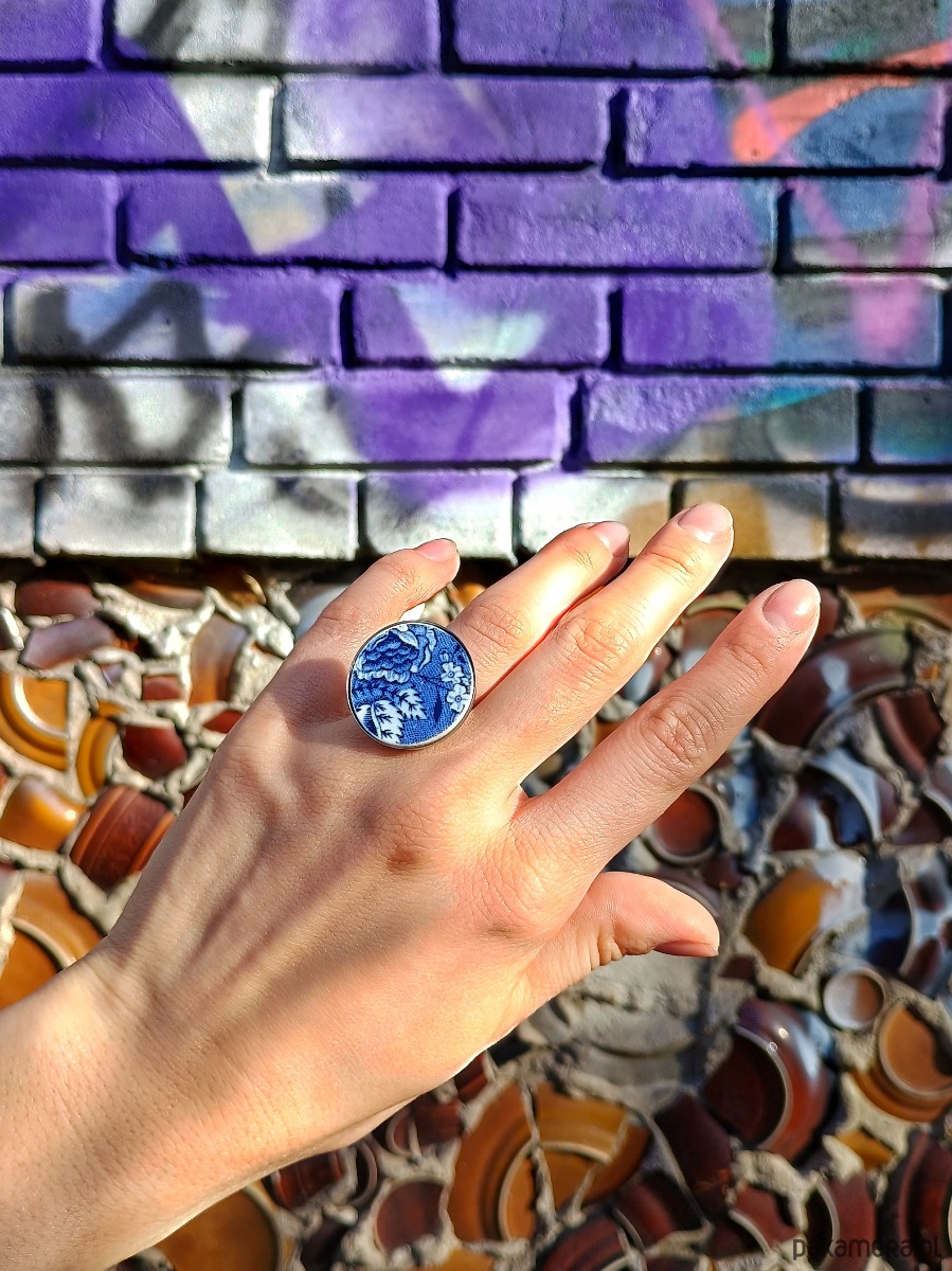 Duży okrągły pierścionek, który wykonałam z fragmentu stłuczonego talerza z fajansu angielskiego w kobaltowe wzory kwiatowe. Kawałek stłuczki oszlifowałam i połączyłam z metalową bazą w kolorze srebrnym. Baza jest regulowana - będzie pasowała na każdy rozmiar. Ceramikę zeszlifowałam również z grubości - jest cieńsza niż pierwotnie, dzięki czemu pierścionek nie jest ciężki. Brzegi pokryłam lakierem, co sprawia, że nie brudzą się i nie chłoną wilgoci. Średnica elementu ceramicznego: 25 mm. Unikat - każdy z moich wyrobów występuje w jednym egzemplarzu. Upcykling - nie reprodukuję wykorzystywanych wzorów, niczego nie domalowuję - wykorzystuję wyłącznie oryginalne naczynia i motywy, które się na nich znajdują. Tym samym, stłuczce z odzysku nadaję nowe życie.