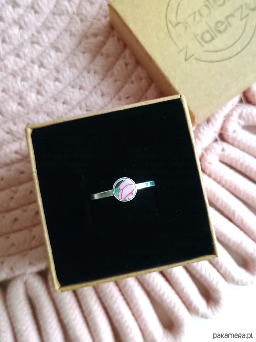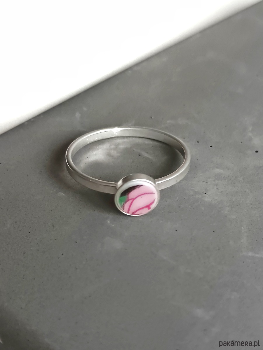 Delikatny pierścionek, który wykonałam z fragmentu starej porcelany - talerza w kwiatowe wzory. Kawałek stłuczki oszlifowałam w okrągły kształt i połączyłam z bazą wykonaną ze srebra próby 925. Rozmiar: 16 (możliwość powiększenia o 1-2 rozmiary). Średnica "oczka" - elementu ceramicznego: 6 mm. Unikat - każdy z moich wyrobów występuje w jednym egzemplarzu. Upcykling - nie reprodukuję wykorzystywanych wzorów, niczego nie domalowuję - wykorzystuję wyłącznie oryginalne naczynia i motywy, które się na nich znajdują. Tym samym, stłuczce z odzysku nadaję nowe życie.