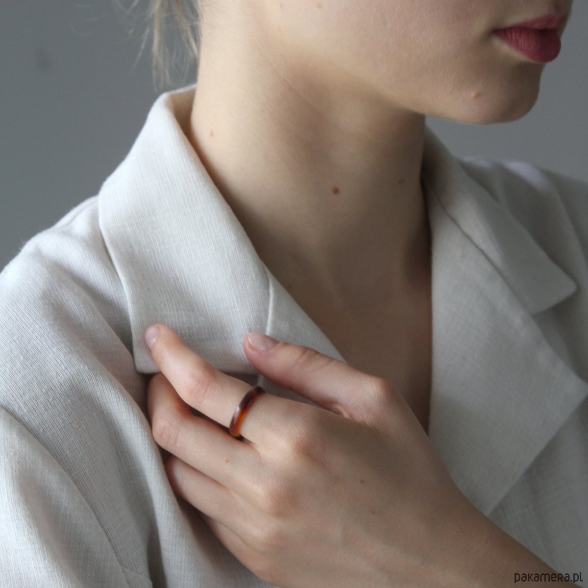 Pierścionek w kolorze Dark Tortoise jest wykonany z octanu celulozy.