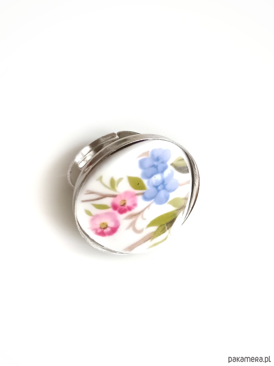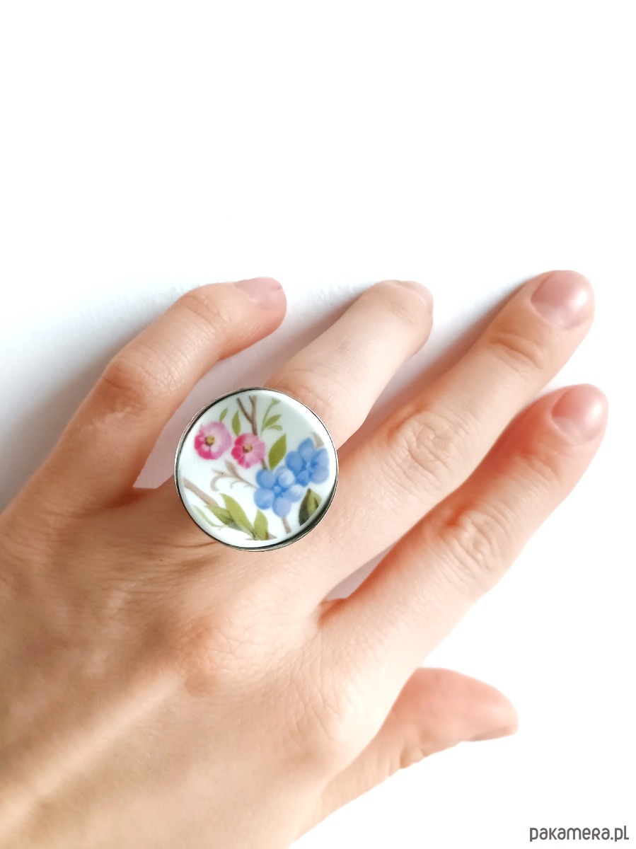 Oto pierścionek, który wykonałam z fragmentu starej porcelany - stłuczonej filiżanki w kolorowe kwiaty. Kawałek stłuczki oszlifowałam w okrągły kształt i połączyłam z metalową bazą w kolorze srebrnym. Baza jest regulowana - będzie pasowała na każdy rozmiar. Ceramikę zeszlifowałam również z grubości - jest cieńsza niż pierwotnie, dzięki czemu pierścionek nie jest ciężki. Brzegi pokryłam lakierem, co sprawia, że nie brudzą się i nie chłoną wilgoci. Średnica elementu ceramicznego: 26 mm. Unikat - każdy z moich wyrobów występuje w jednym egzemplarzu. Upcykling - nie reprodukuję wykorzystywanych wzorów, niczego nie domalowuję - wykorzystuję wyłącznie oryginalne naczynia i motywy, które się na nich znajdują. Tym samym, stłuczce z odzysku nadaję nowe życie.