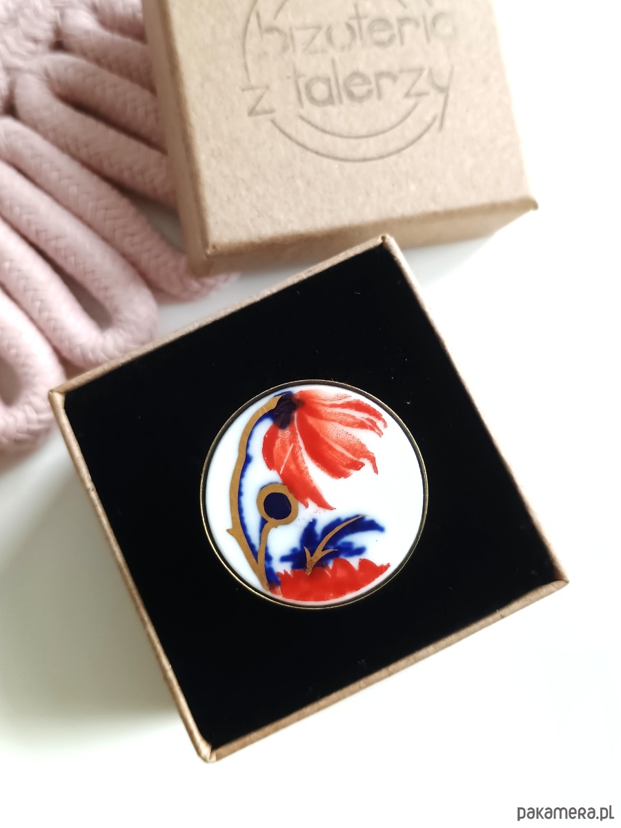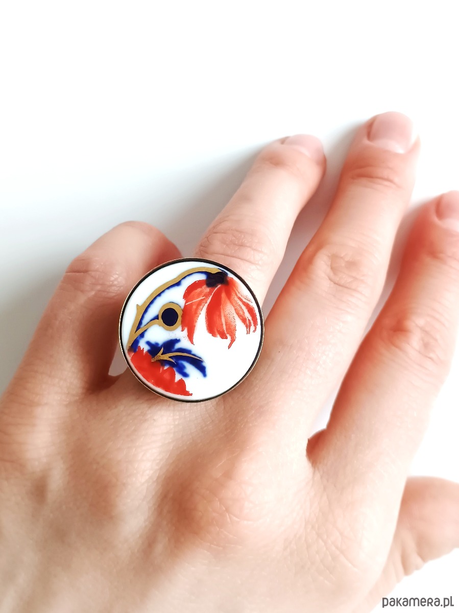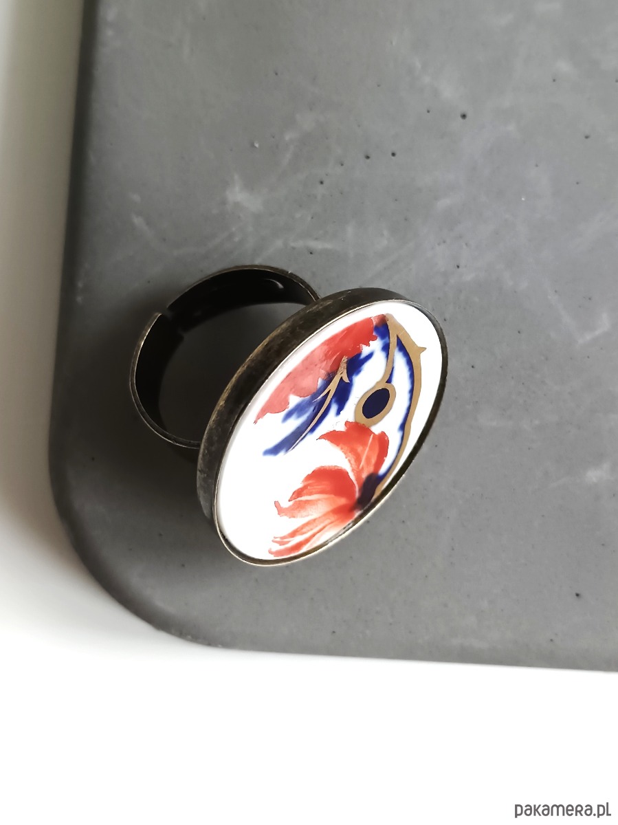 Oto pierścionek, który wykonałam z fragmentu stłuczonego talerza w kolorowe kwiaty. Kawałek stłuczki oszlifowałam w okrągły kształt i połączyłam z metalową bazą w kolorze mosiądzu. Baza jest regulowana - będzie pasowała na każdy rozmiar. Ceramikę zeszlifowałam również z grubości - jest cieńsza niż pierwotnie, dzięki czemu pierścionek nie jest ciężki. Brzegi pokryłam lakierem, co sprawia, że nie brudzą się i nie chłoną wilgoci. Średnica elementu ceramicznego: 26 mm. Unikat - każdy z moich wyrobów występuje w jednym egzemplarzu. Upcykling - nie reprodukuję wykorzystywanych wzorów, niczego nie domalowuję - wykorzystuję wyłącznie oryginalne naczynia i motywy, które się na nich znajdują. Tym samym, stłuczce z odzysku nadaję nowe życie.