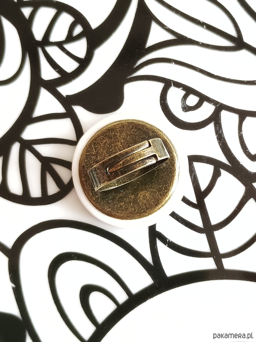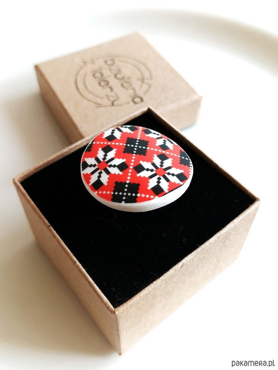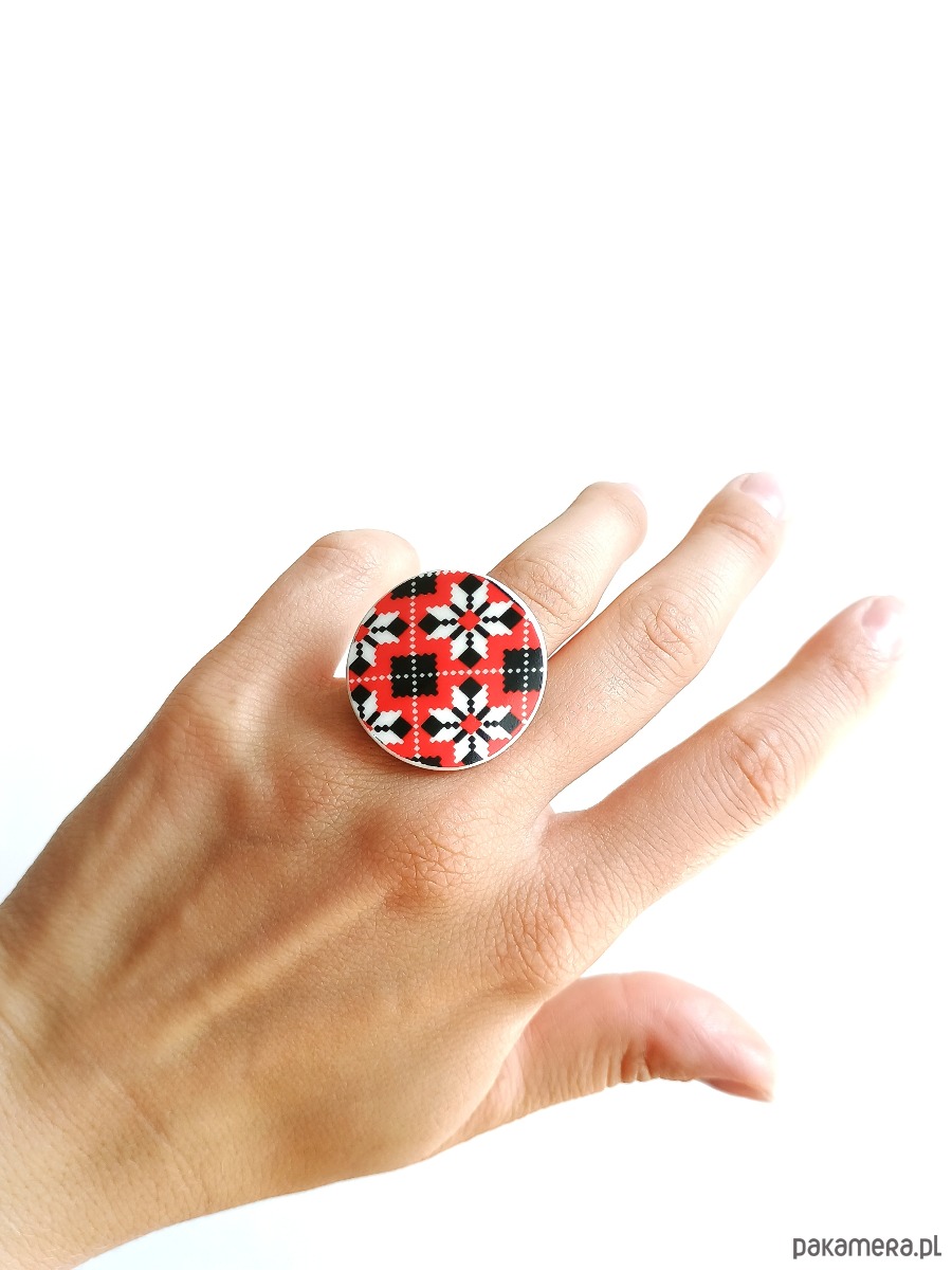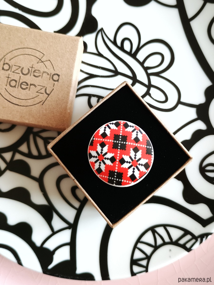 Oto pierścionek, który wykonałam z fragmentu stłuczonej filiżanki w ukraińskie wzory, naśladujące tradycyjny haft krzyżykowy. Kawałek stłuczki oszlifowałam w okrągły kształt i połączyłam z metalową bazą w kolorze mosiądzu. Baza jest regulowana - będzie pasowała na każdy rozmiar. Ceramikę zeszlifowałam również z grubości - jest cieńsza niż pierwotnie, dzięki czemu pierścionek nie jest ciężki. Brzegi pokryłam lakierem, co sprawia, że nie brudzą się i nie chłoną wilgoci. Średnica elementu ceramicznego: 30 mm. Unikat - każdy z moich wyrobów występuje w jednym egzemplarzu. Upcykling - nie reprodukuję wykorzystywanych wzorów, niczego nie domalowuję - wykorzystuję wyłącznie oryginalne naczynia i motywy, które się na nich znajdują. Tym samym, stłuczce z odzysku nadaję nowe życie.