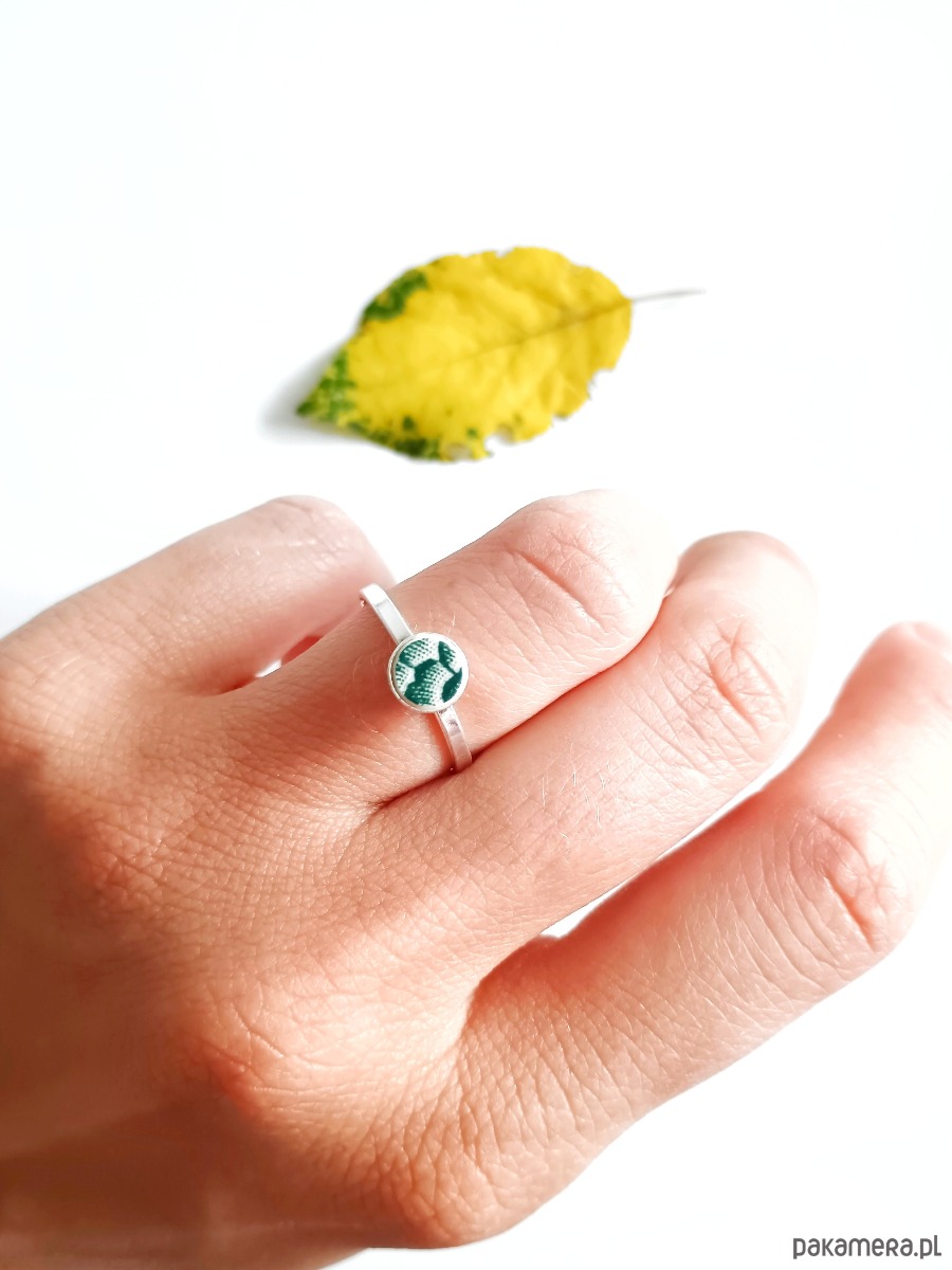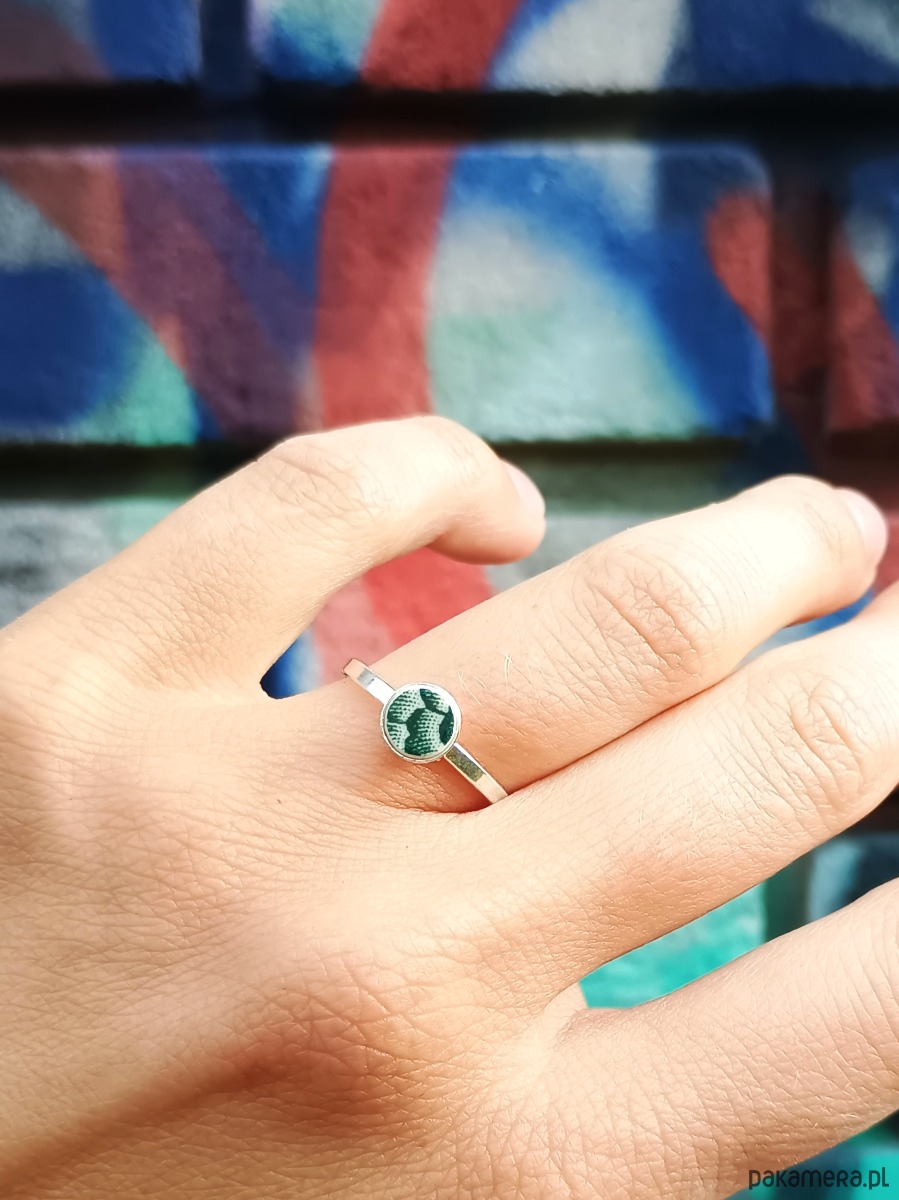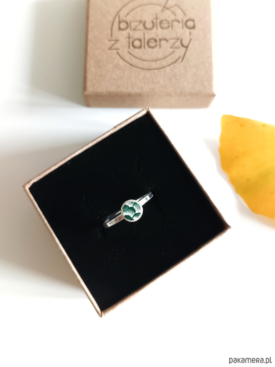 Delikatny pierścionek, który wykonałam z fragmentu stłuczonego talerza w zielone kwiatowe wzory. Kawałek stłuczki oszlifowałam w okrągły kształt i połączyłam z bazą wykonaną ze srebra próby 925. Rozmiar: 15 (możliwość powiększenia o 1-2 rozmiary). Średnica "oczka" - elementu ceramicznego: 6 mm. Unikat - każdy z moich wyrobów występuje w jednym egzemplarzu. Upcykling - nie reprodukuję wykorzystywanych wzorów, niczego nie domalowuję - wykorzystuję wyłącznie oryginalne naczynia i motywy, które się na nich znajdują. Tym samym, stłuczce z odzysku nadaję nowe życie.