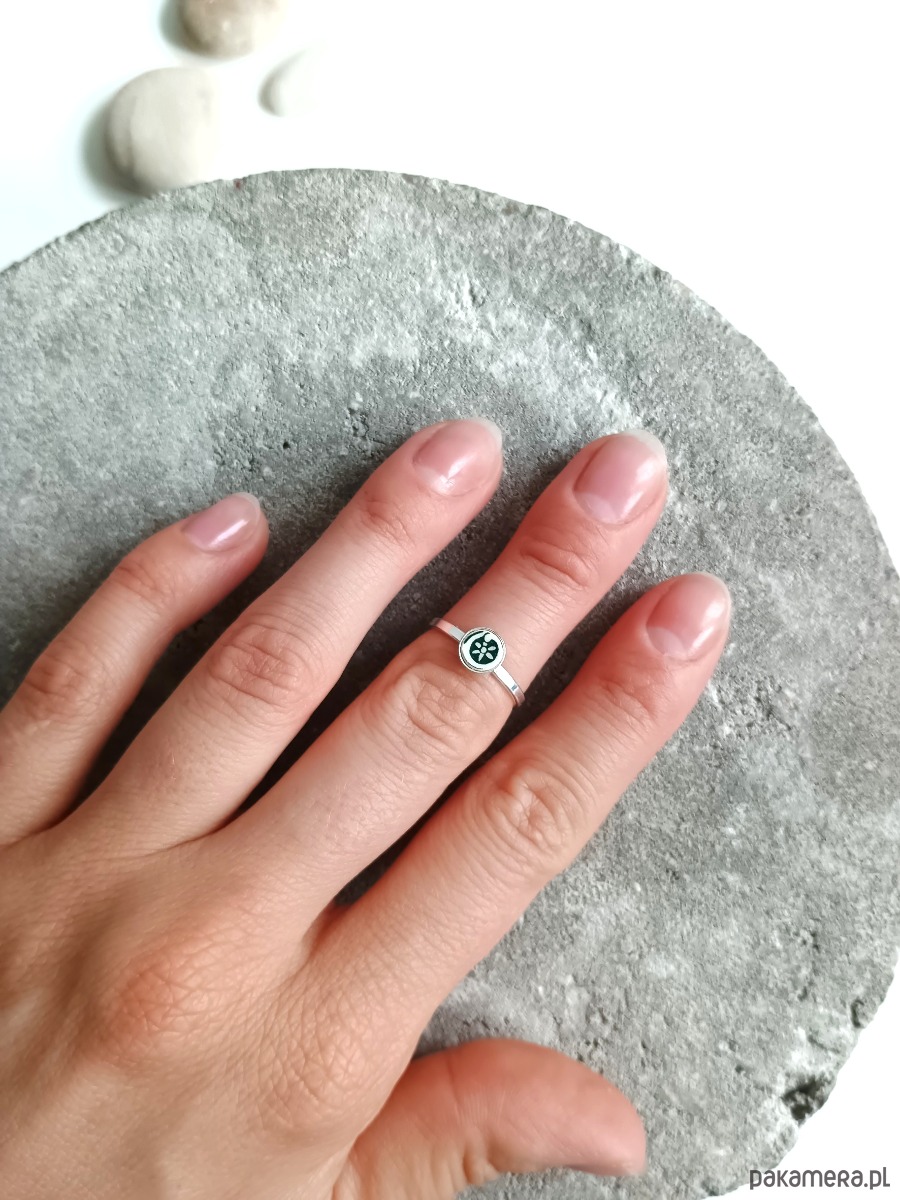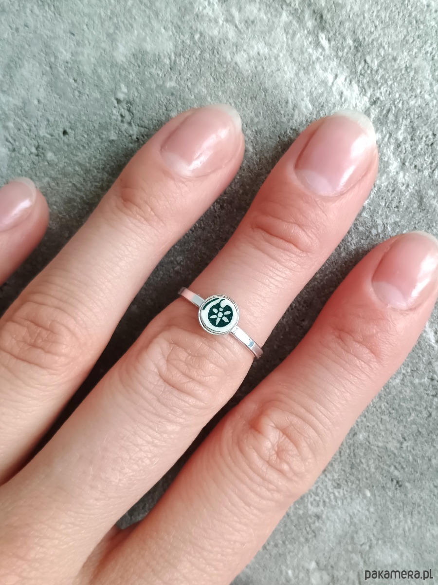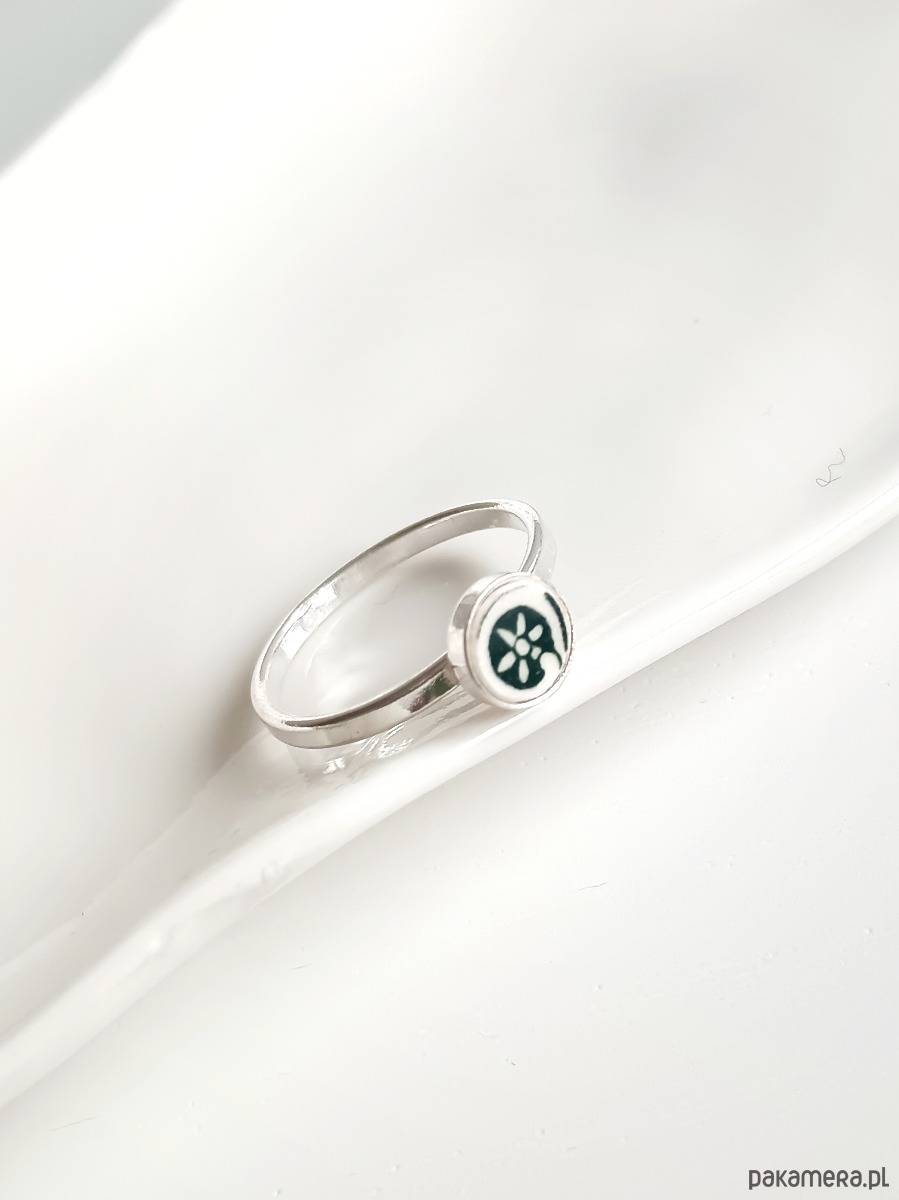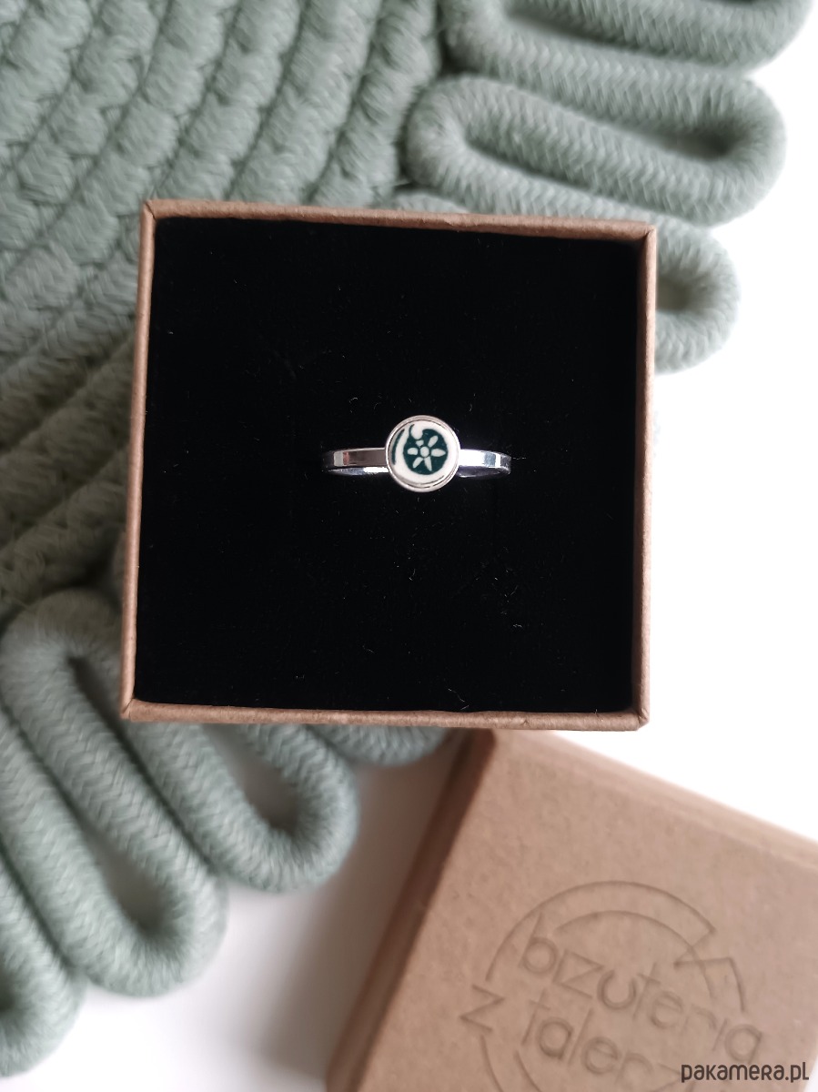 Delikatny pierścionek, który wykonałam z fragmentu stłuczonego talerza w zielone kwiatowe wzory. Kawałek stłuczki oszlifowałam w okrągły kształt i połączyłam z bazą wykonaną ze srebra próby 925. Rozmiar: 10 (możliwość powiększenia o 1-2 rozmiary). Średnica "oczka" - elementu ceramicznego: 6 mm. Unikat - każdy z moich wyrobów występuje w jednym egzemplarzu. Upcykling - nie reprodukuję wykorzystywanych wzorów, niczego nie domalowuję - wykorzystuję wyłącznie oryginalne naczynia i motywy, które się na nich znajdują. Tym samym, stłuczce z odzysku nadaję nowe życie.