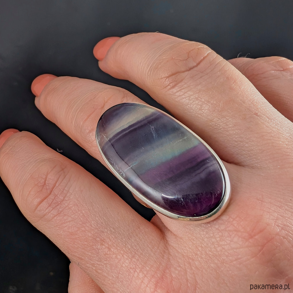 Pierścień wykonany ze srebra próby 925. Rozmiar jubilerski regulowany w wąskim zakresie , mogę dopasować między 15-19. Proszę napisać po zakupie. Ozdobą pierścionka jest przepiękny fluoryt o fioletowych i morskich barwach. Wymiary oprawy kamienia 39 x 19 mm, szerokość obrączki 5 mm. Waga 14 g. Pierścień zostanie zapakowany w ozdobne pudełeczko. Wykonany przez dostawcę kamieni