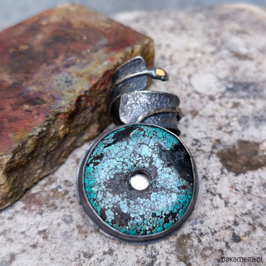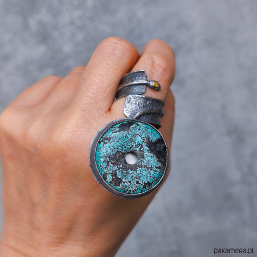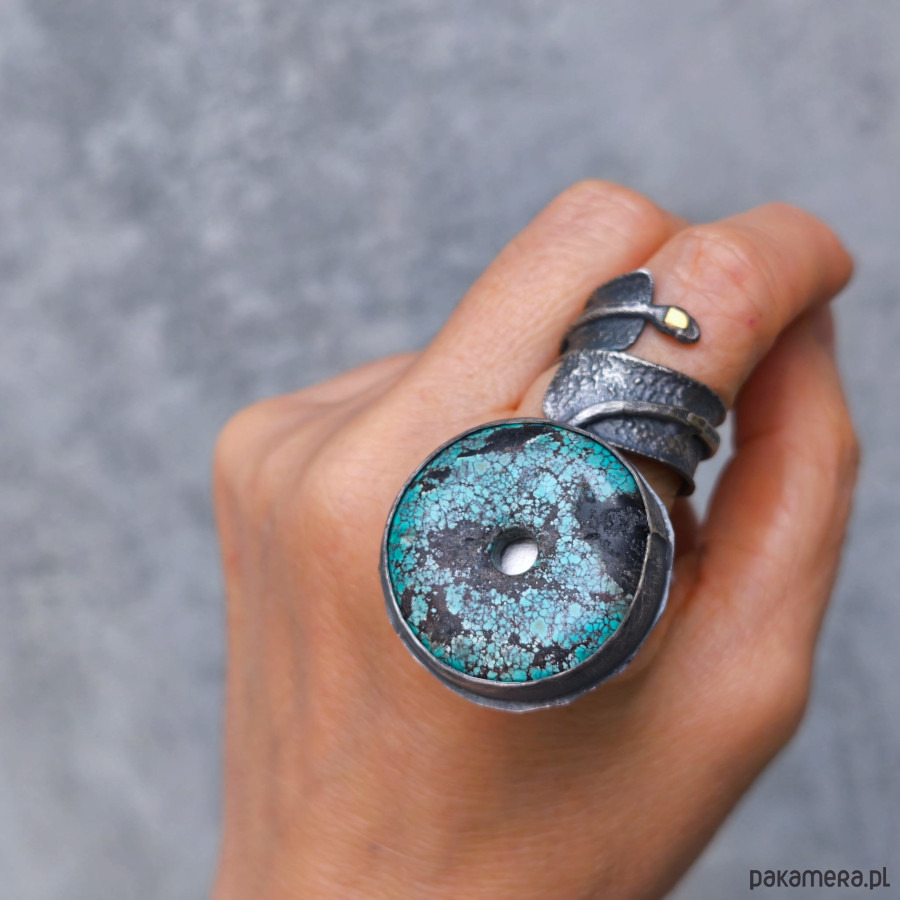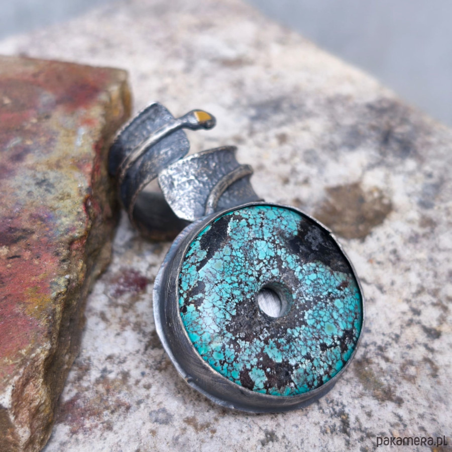 Wyjątkowy, artystyczny pierścień srebrny z naturalnym turkusem i kawałkiem złota.