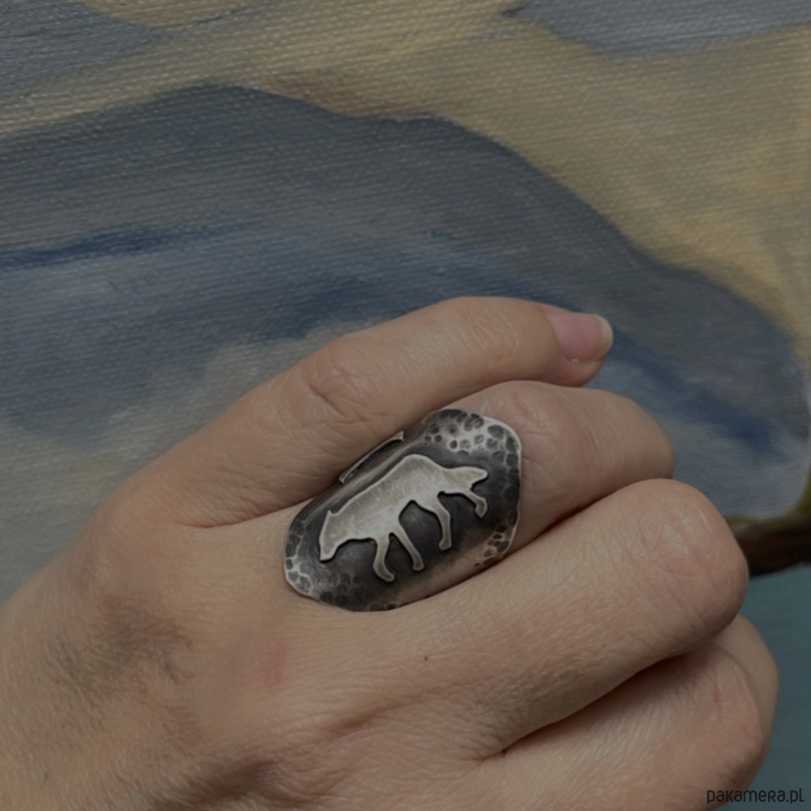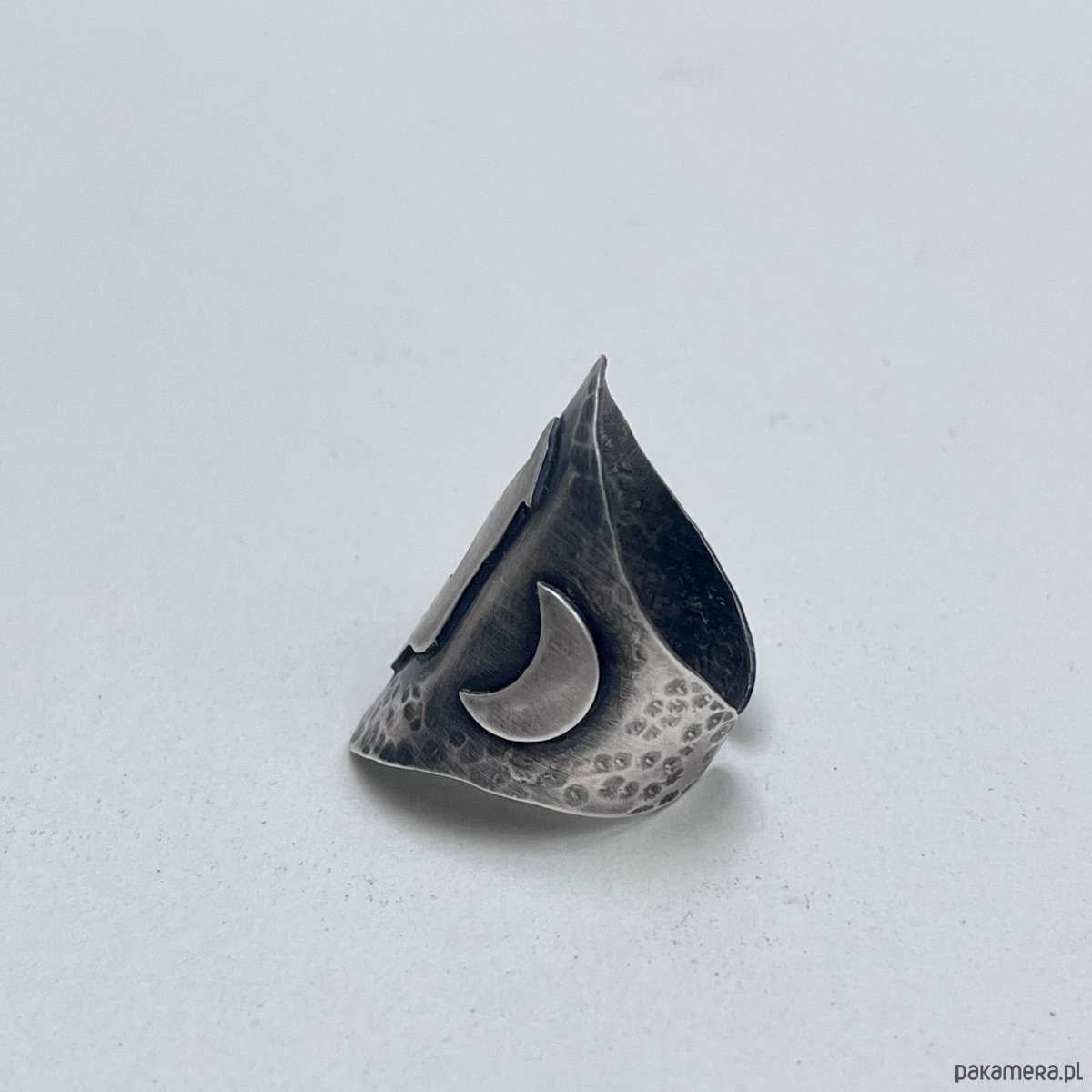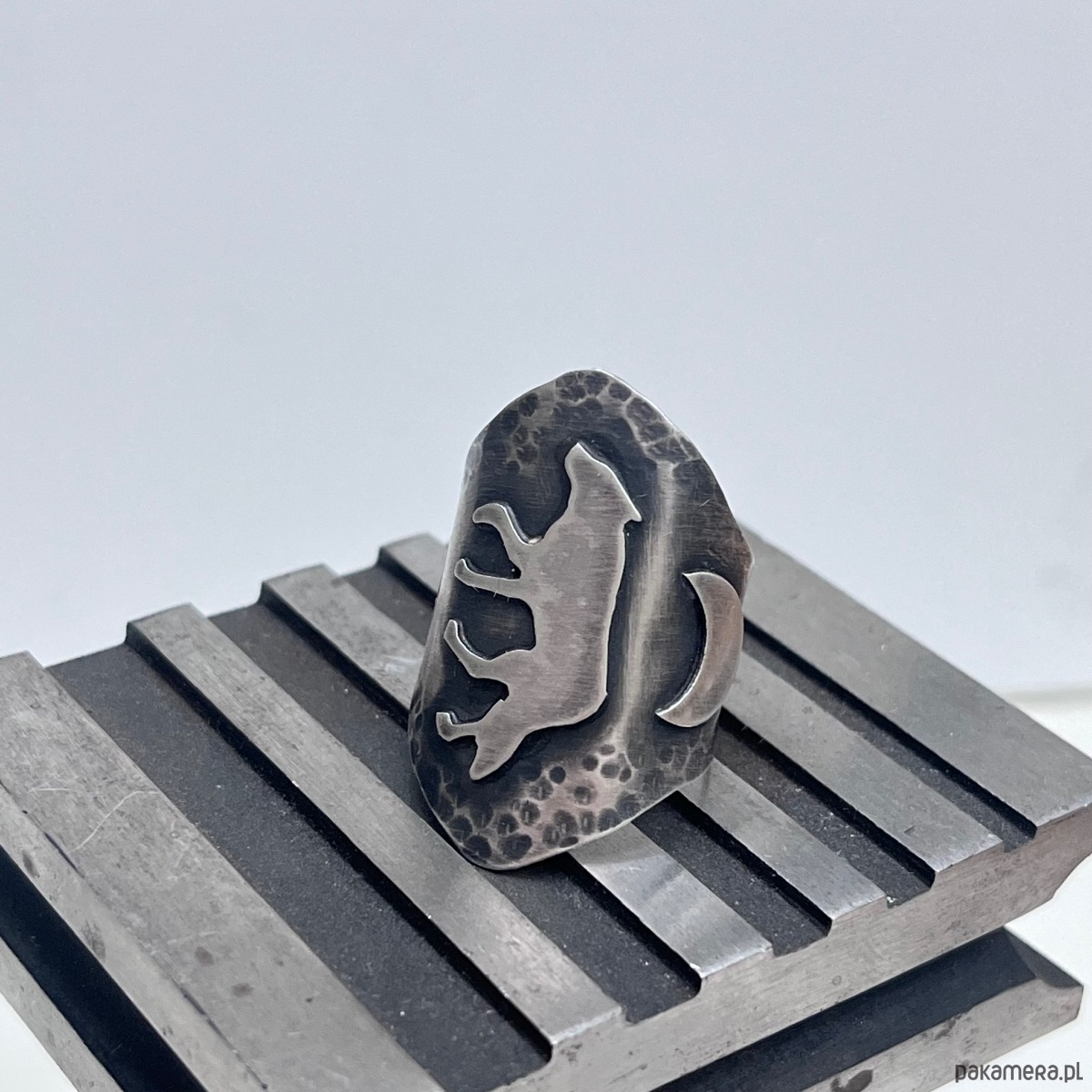 Efektowny pierścionek w formie szerokiej blaszki zwężającej się z tylu. Motyw przewodni to ręcznie wycięty wilk i księżyc.