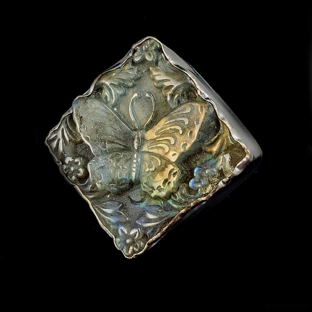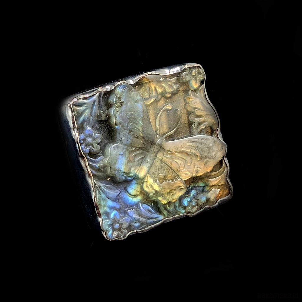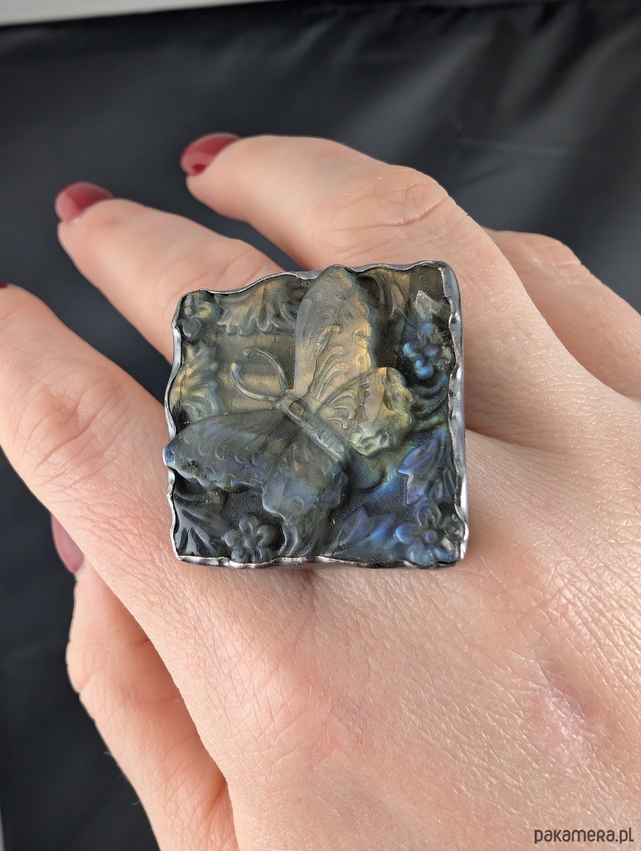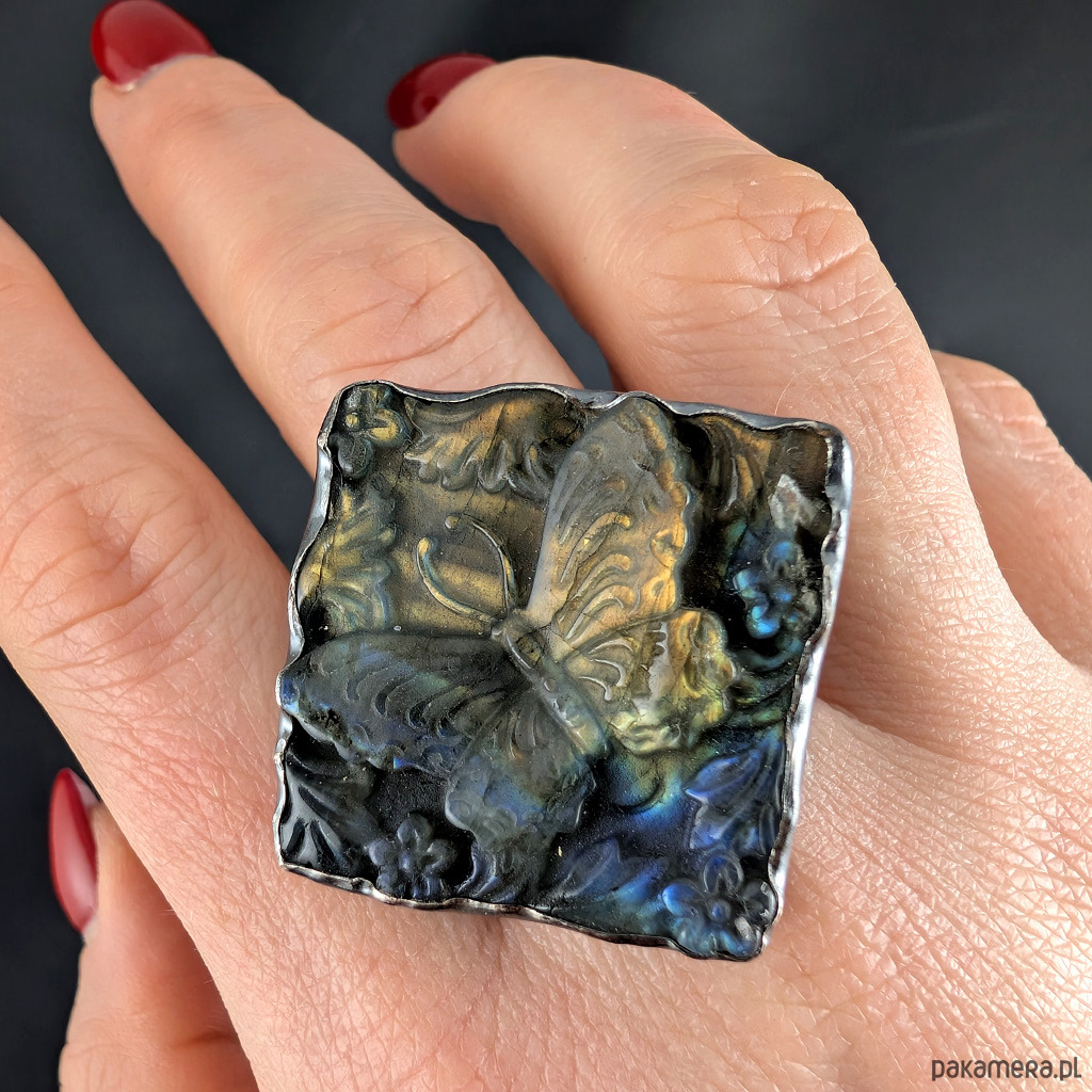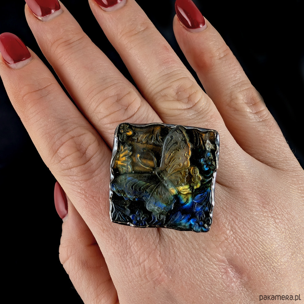 Cudny pierścionek wykonany z oksydowanego srebra pr. 925 oraz naturalnego labradorytu z pięknie wyrzeźbioną taflą. Oprawa o wymiarach 30 X 28 mm. Rozmiar julbilerski 20, mogę powiększyć na max 21. Obrączka szerokość 7 mm. Waga 26 g. Pierscionek zostanie zapakowany w ozdobne pudełeczko.