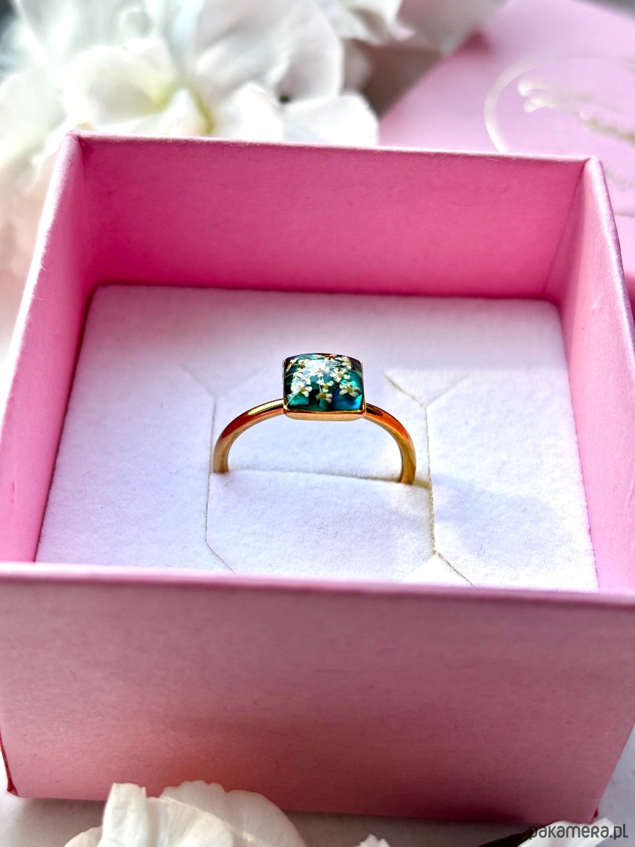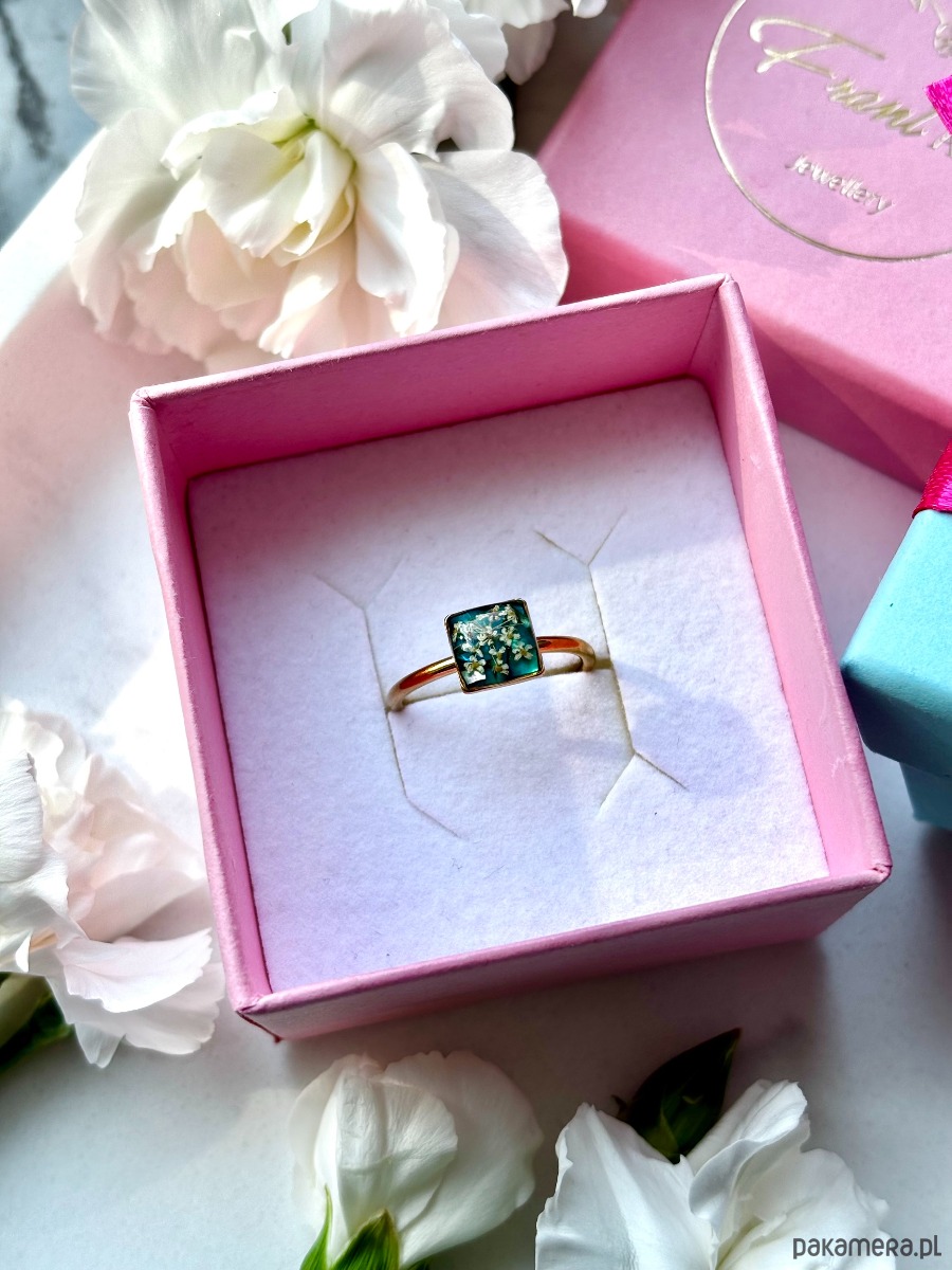 Głęboka turkusowa zieleń pięknie podkreśla jasne kwiaty, tworząc elegancki, a jednocześnie naturalny efekt. Minimalistyczna forma sprawia, że pierścionek pasuje zarówno do stylizacji codziennych, jak i bardziej kobiecych, romantycznych zestawów. To propozycja dla kobiet, które kochają autentyczność, naturę i rękodzieło.