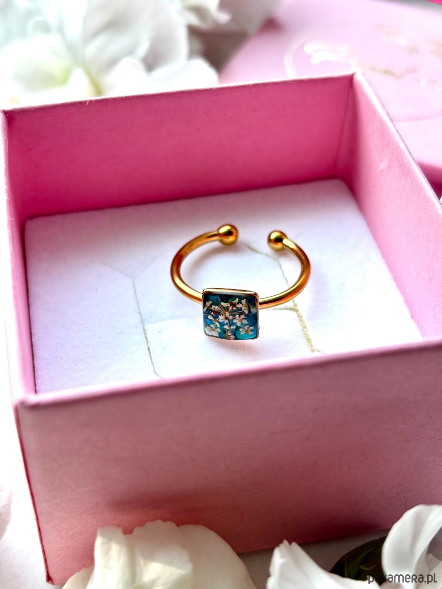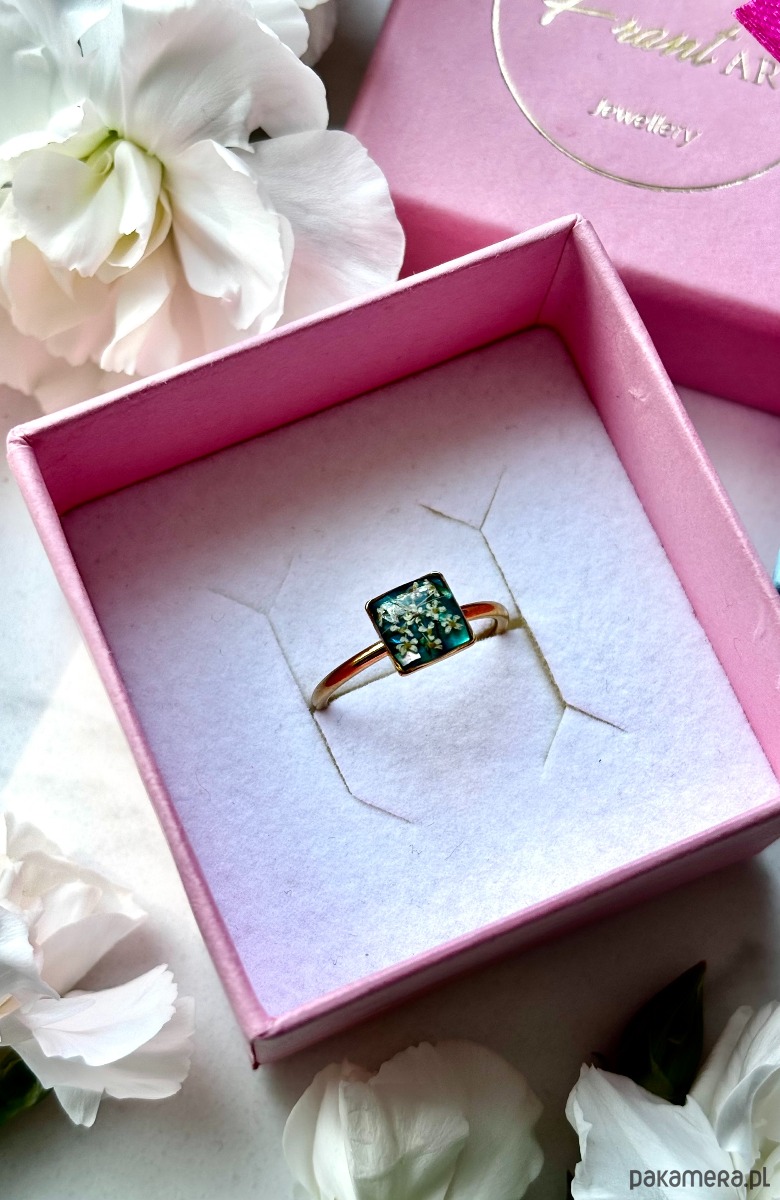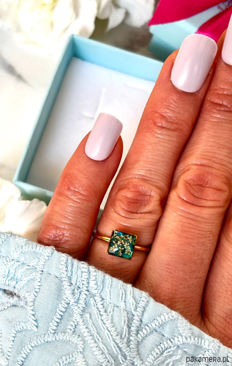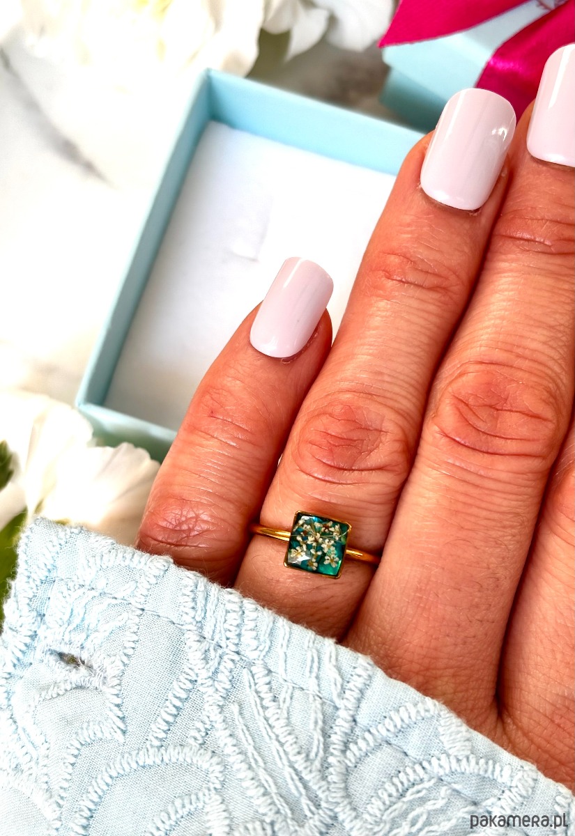 Ręcznie wykonany pierścionek z kwadratowym oczkiem Biżuteria wykonana jest z wyselekcjonowanych kawałków muszli i szkła w kolorze zieleni oraz suszonych kwiatów dzikiej marchwi. Pierścionek pięknie prezentuje się na dłoni, dzięki możliwości regulacji można dopasować go do większości placów.