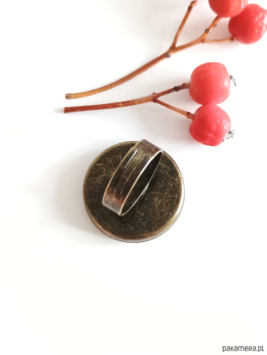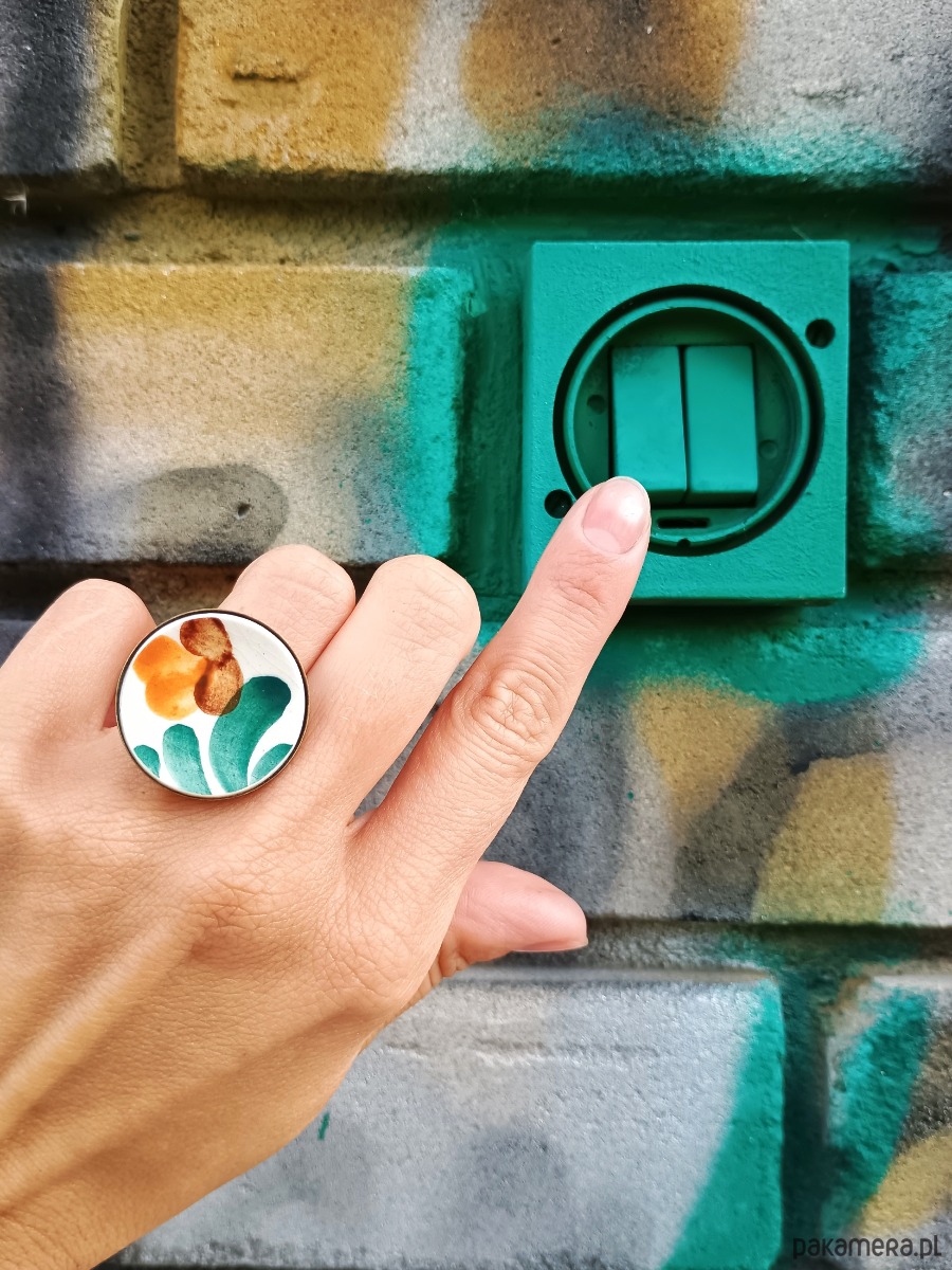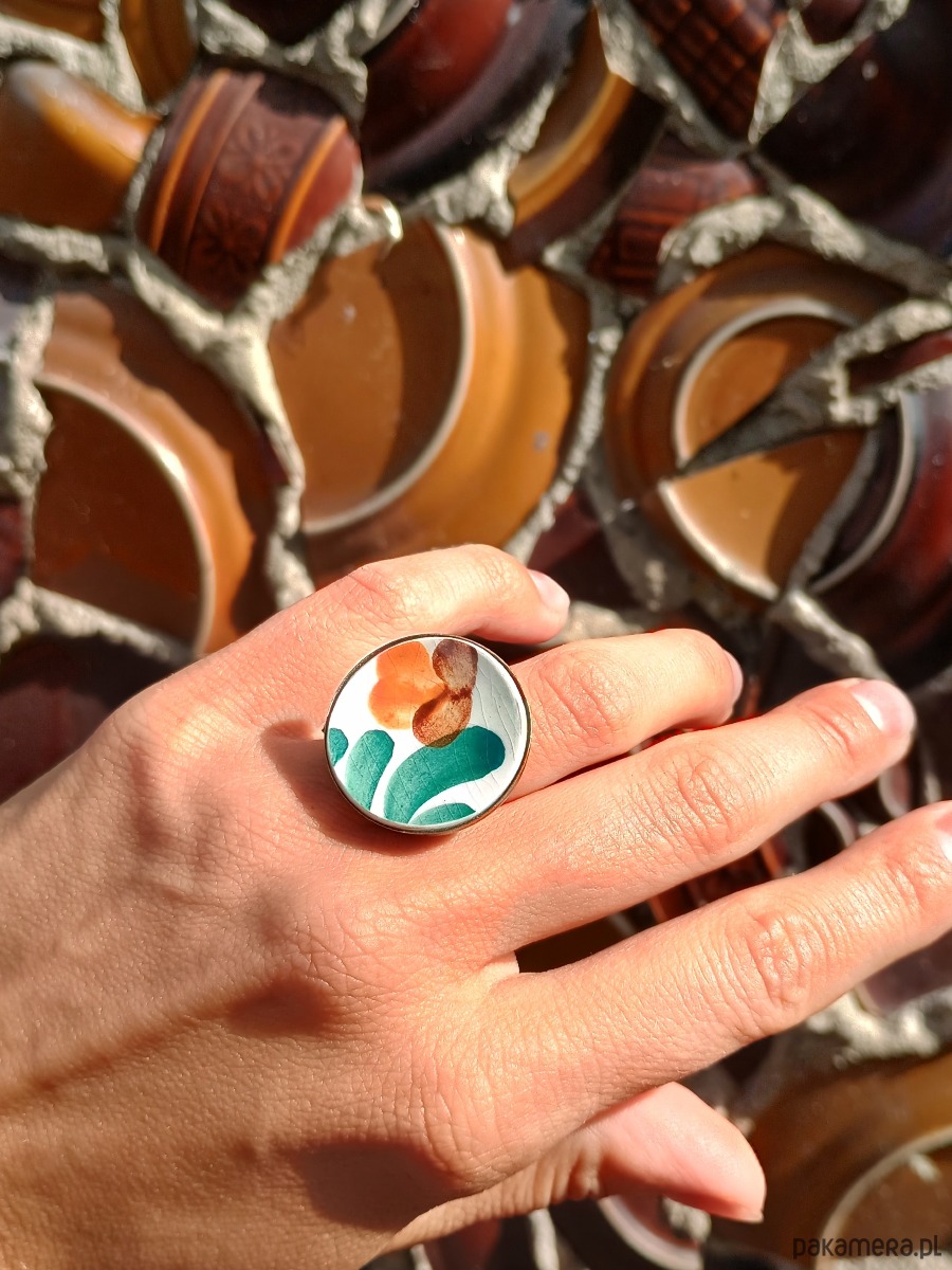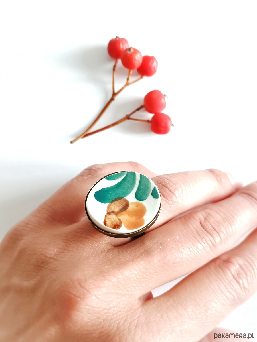 Historia fajansu włocławskiego sięga 1873 roku. Zakładów było kilka, zmieniali się właściciele i lokalizacje. Produkcja najbardziej rozwinęła się po II WŚ, kiedy w miejscowych zakładach powstawał nie tylko fajans, ale również porcelit i porcelana. Zróżnicowane było także wzornictwo - produkowano nie tylko naczynia, ale również elementy wyposażenia wnętrz (lampy, świeczniki, żyrandole). Mimo tej różnorodności, najbardziej rozpoznawalnym wyrobem z Włocławka jest talerz w ręcznie malowane kobaltowe kwiaty (z takich najchętniej korzystam :). I mimo, że najdłużej działająca fabryka zakończyła działalność w 1991 roku, dzięki lokalnym inicjatywom produkcja fajansu została wznowiona i trwa do dziś! Oto pierścionek, który wykonałam z fragmentu fajansu włocławskiego ręcznie malowanego w kolorowe wzory. Kawałek stłuczki oszlifowałam w okrągły kształt i połączyłam z metalową bazą w kolorze mosiądzu. Baza jest regulowana - będzie pasowała na każdy rozmiar. Ceramikę zeszlifowałam również z grubości - jest cieńsza niż pierwotnie, dzięki czemu pierścionek nie jest ciężki. Brzegi pokryłam lakierem, co sprawia, że nie brudzą się i nie chłoną wilgoci. Średnica elementu ceramicznego: 26 mm. Unikat - każdy z moich wyrobów występuje w jednym egzemplarzu. Upcykling - nie reprodukuję wykorzystywanych wzorów, niczego nie domalowuję - wykorzystuję wyłącznie oryginalne naczynia i motywy, które się na nich znajdują. Tym samym, stłuczce z odzysku nadaję nowe życie.