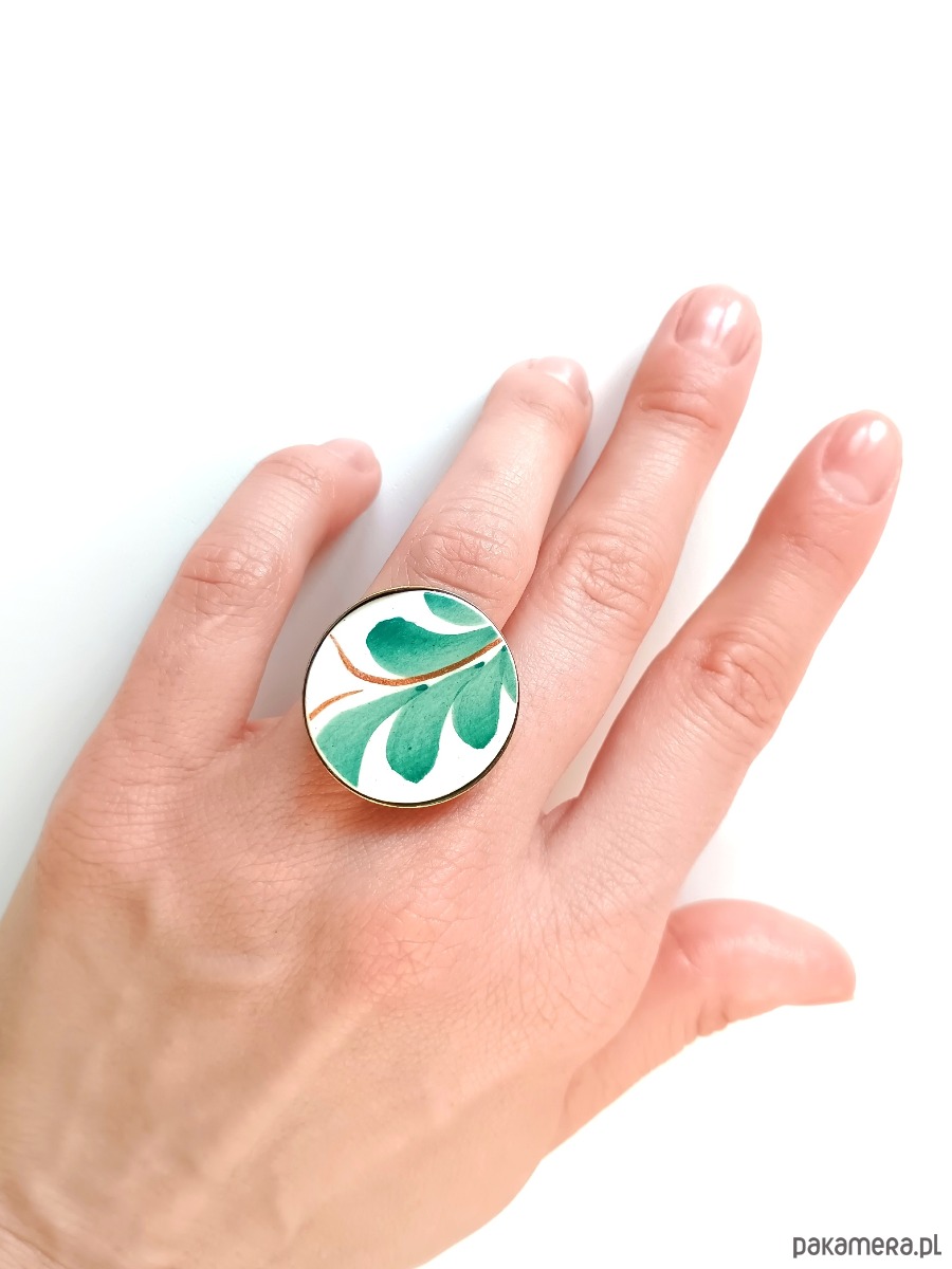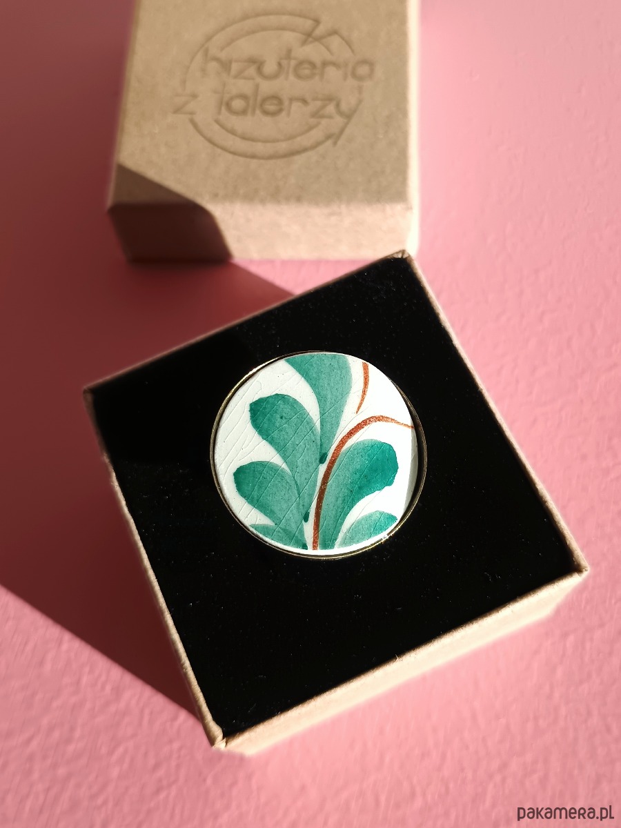 Historia fajansu włocławskiego sięga 1873 roku. Zakładów było kilka, zmieniali się właściciele i lokalizacje. Produkcja najbardziej rozwinęła się po II WŚ, kiedy w miejscowych zakładach powstawał nie tylko fajans, ale również porcelit i porcelana. Zróżnicowane było także wzornictwo - produkowano nie tylko naczynia, ale również elementy wyposażenia wnętrz (lampy, świeczniki, żyrandole). Mimo tej różnorodności, najbardziej rozpoznawalnym wyrobem z Włocławka jest talerz w ręcznie malowane kobaltowe kwiaty (z takich najchętniej korzystam :). I mimo, że najdłużej działająca fabryka zakończyła działalność w 1991 roku, dzięki lokalnym inicjatywom produkcja fajansu została wznowiona i trwa do dziś! Oto pierścionek, który wykonałam z fragmentu fajansu włocławskiego ręcznie malowanego w kolorowe wzory. Kawałek stłuczki oszlifowałam w okrągły kształt i połączyłam z metalową bazą w kolorze mosiądzu. Baza jest regulowana - będzie pasowała na każdy rozmiar. Ceramikę zeszlifowałam również z grubości - jest cieńsza niż pierwotnie, dzięki czemu pierścionek nie jest ciężki. Brzegi pokryłam lakierem, co sprawia, że nie brudzą się i nie chłoną wilgoci. Średnica elementu ceramicznego: 26 mm. Unikat - każdy z moich wyrobów występuje w jednym egzemplarzu. Upcykling - nie reprodukuję wykorzystywanych wzorów, niczego nie domalowuję - wykorzystuję wyłącznie oryginalne naczynia i motywy, które się na nich znajdują. Tym samym, stłuczce z odzysku nadaję nowe życie.