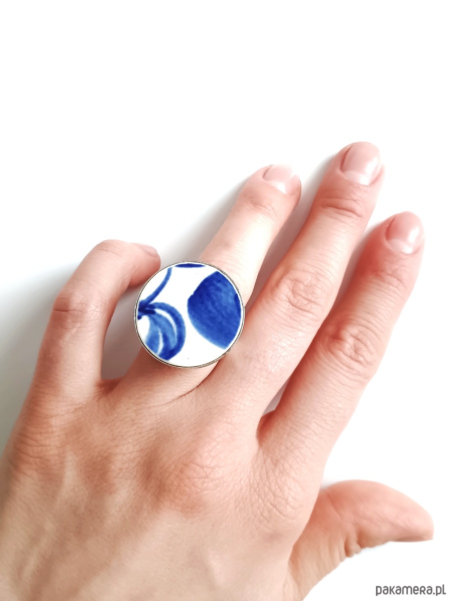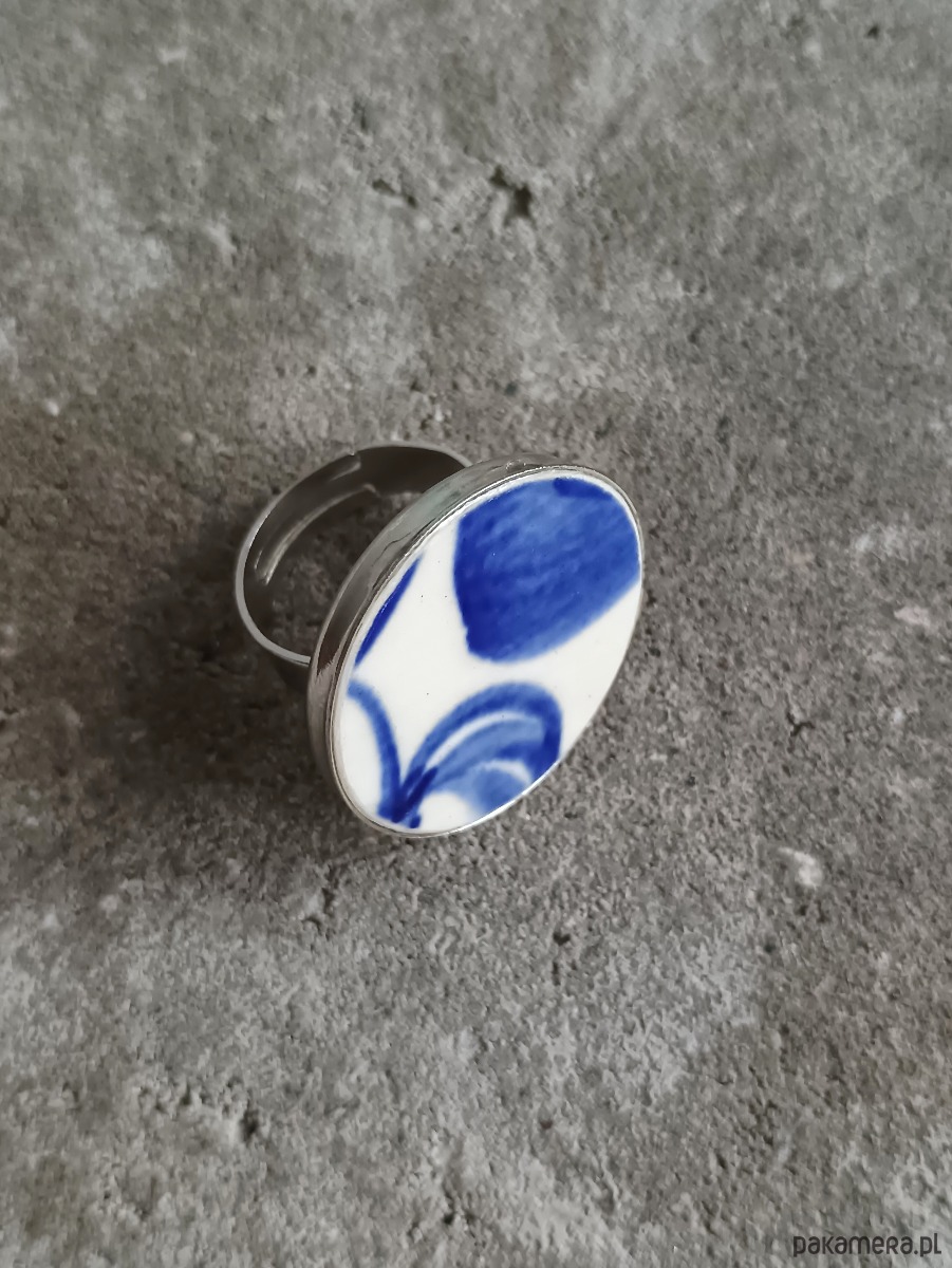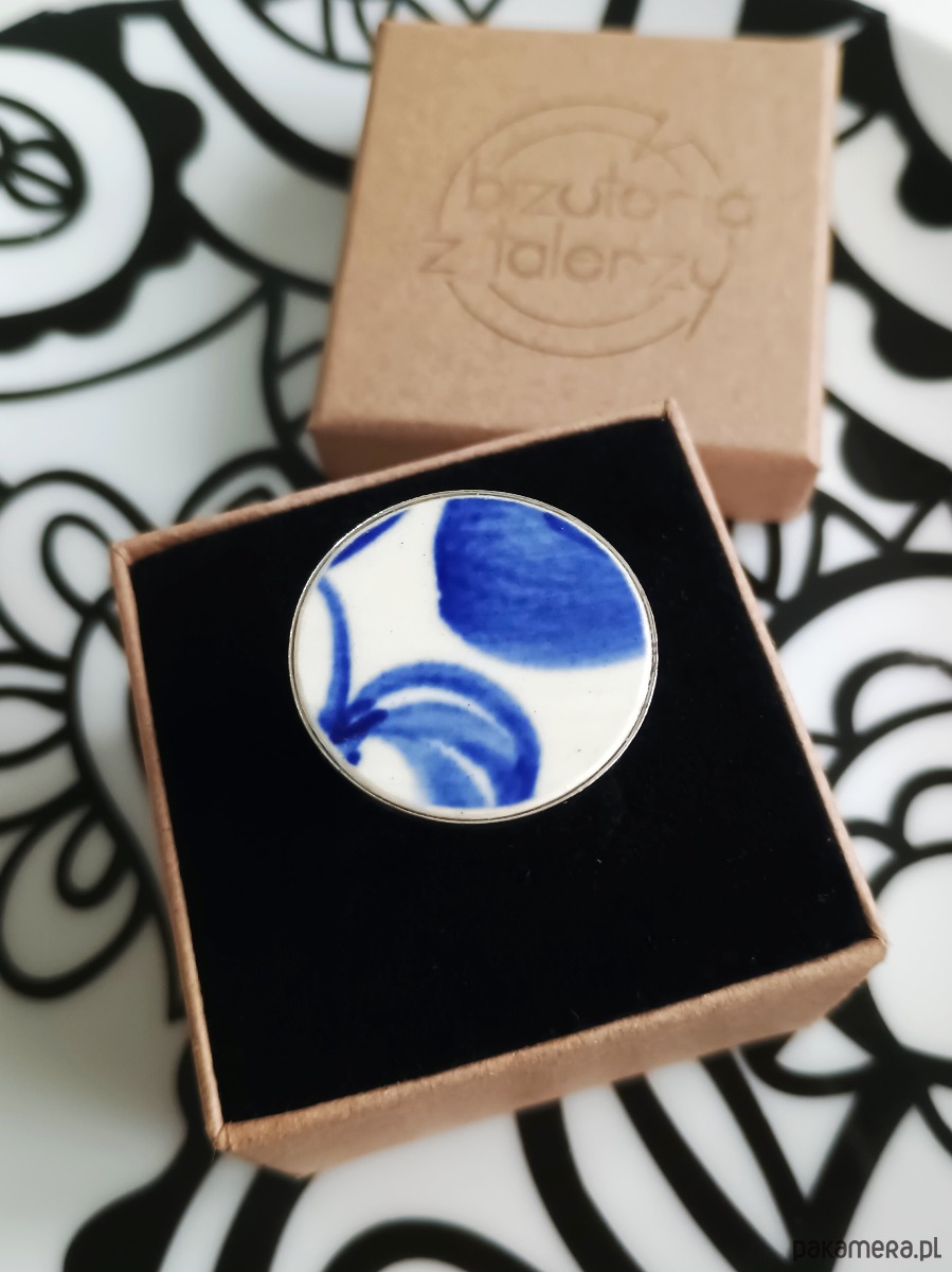 Historia fajansu włocławskiego sięga 1873 roku. Zakładów było kilka, zmieniali się właściciele i lokalizacje. Produkcja najbardziej rozwinęła się po II WŚ, kiedy w miejscowych zakładach powstawał nie tylko fajans, ale również porcelit i porcelana. Zróżnicowane było także wzornictwo - produkowano nie tylko naczynia, ale również elementy wyposażenia wnętrz (lampy, świeczniki, żyrandole). Mimo tej różnorodności, najbardziej rozpoznawalnym wyrobem z Włocławka jest talerz w ręcznie malowane kobaltowe kwiaty (z takich najchętniej korzystam :). I mimo, że najdłużej działająca fabryka zakończyła działalność w 1991 roku, dzięki lokalnym inicjatywom produkcja fajansu została wznowiona i trwa do dziś! Oto pierścionek, który wykonałam z fragmentu fajansu włocławskiego ręcznie malowanego w kobaltowe wzory. Kawałek stłuczki oszlifowałam w okrągły kształt i połączyłam z metalową bazą w kolorze srebrnym. Baza jest regulowana - będzie pasowała na każdy rozmiar. Ceramikę zeszlifowałam również z grubości - jest cieńsza niż pierwotnie, dzięki czemu pierścionek nie jest ciężki. Brzegi pokryłam lakierem, co sprawia, że nie brudzą się i nie chłoną wilgoci. Średnica elementu ceramicznego: 26 mm. Unikat - każdy z moich wyrobów występuje w jednym egzemplarzu. Upcykling - nie reprodukuję wykorzystywanych wzorów, niczego nie domalowuję - wykorzystuję wyłącznie oryginalne naczynia i motywy, które się na nich znajdują. Tym samym, stłuczce z odzysku nadaję nowe życie.