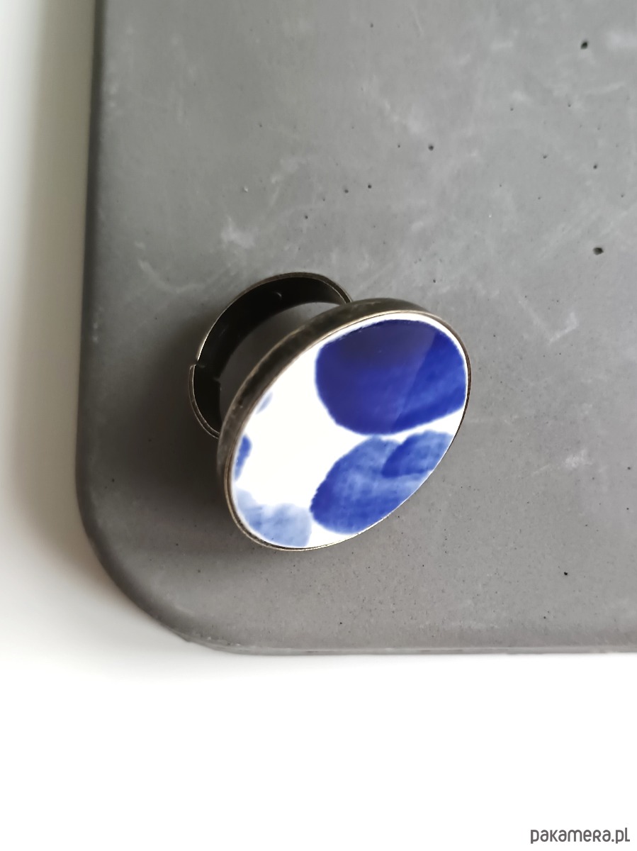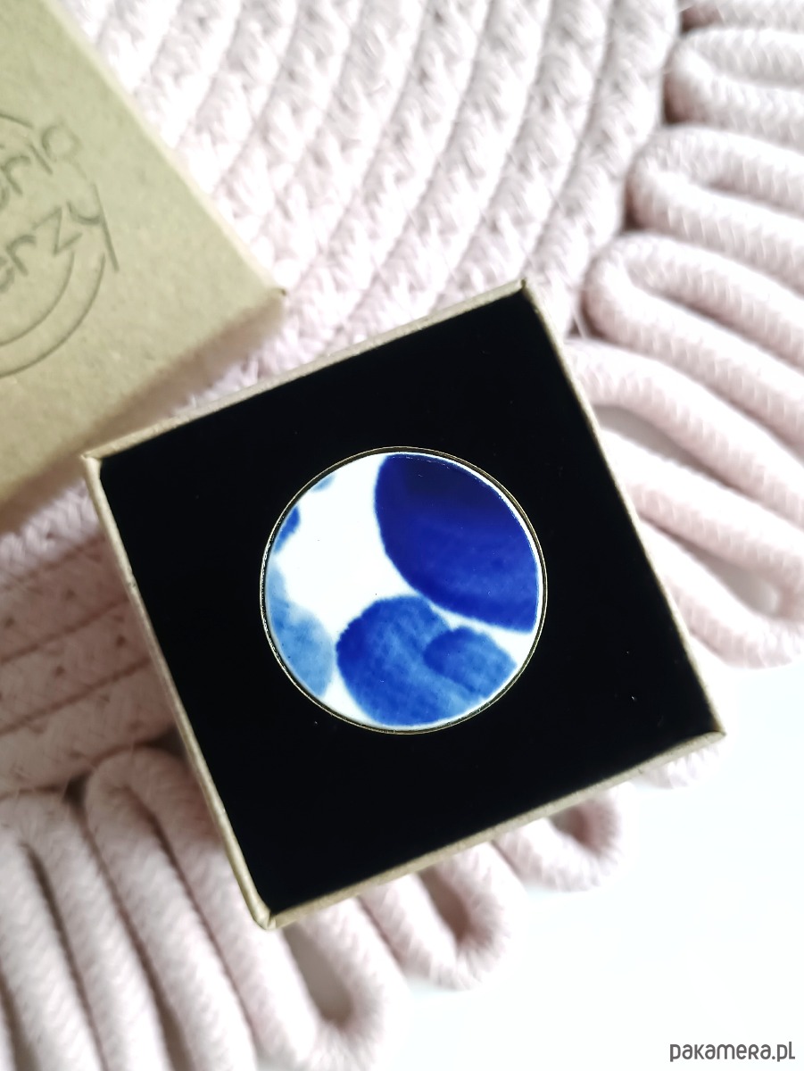 Historia fajansu włocławskiego sięga 1873 roku. Zakładów było kilka, zmieniali się właściciele i lokalizacje. Produkcja najbardziej rozwinęła się po II WŚ, kiedy w miejscowych zakładach powstawał nie tylko fajans, ale również porcelit i porcelana. Zróżnicowane było także wzornictwo - produkowano nie tylko naczynia, ale również elementy wyposażenia wnętrz (lampy, świeczniki, żyrandole). Mimo tej różnorodności, najbardziej rozpoznawalnym wyrobem z Włocławka jest talerz w ręcznie malowane kobaltowe kwiaty (z takich najchętniej korzystam :). I mimo, że najdłużej działająca fabryka zakończyła działalność w 1991 roku, dzięki lokalnym inicjatywom produkcja fajansu została wznowiona i trwa do dziś! Oto pierścionek, który wykonałam z fragmentu fajansu włocławskiego ręcznie malowanego w kobaltowe wzory. Kawałek stłuczki oszlifowałam w okrągły kształt i połączyłam z metalową bazą w kolorze mosiądzu. Baza jest regulowana - będzie pasowała na każdy rozmiar. Ceramikę zeszlifowałam również z grubości - jest cieńsza niż pierwotnie, dzięki czemu pierścionek nie jest ciężki. Brzegi pokryłam lakierem, co sprawia, że nie brudzą się i nie chłoną wilgoci. Średnica elementu ceramicznego: 26 mm. Unikat - każdy z moich wyrobów występuje w jednym egzemplarzu. Upcykling - nie reprodukuję wykorzystywanych wzorów, niczego nie domalowuję - wykorzystuję wyłącznie oryginalne naczynia i motywy, które się na nich znajdują. Tym samym, stłuczce z odzysku nadaję nowe życie.