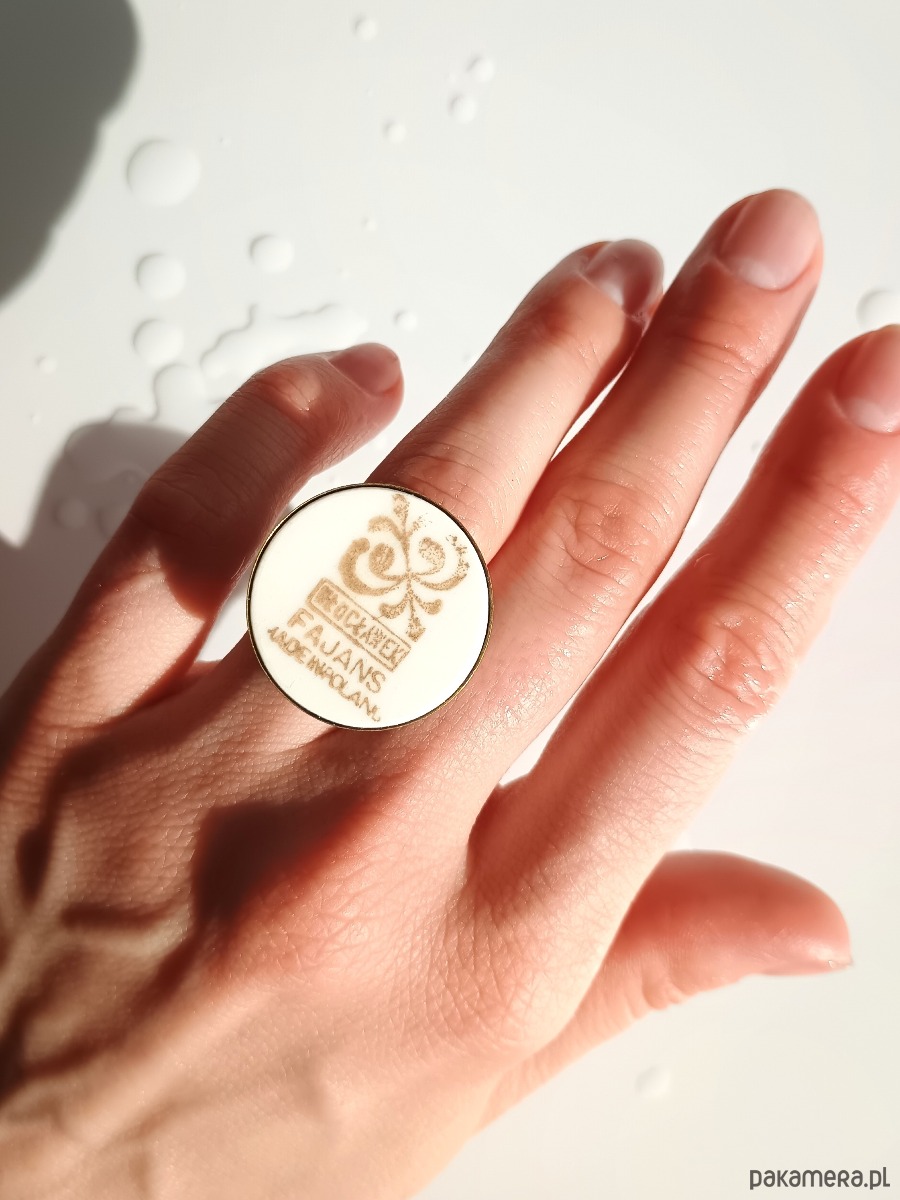 Historia fajansu włocławskiego sięga 1873 roku. Zakładów było kilka, zmieniali się właściciele i lokalizacje. Produkcja najbardziej rozwinęła się po II WŚ, kiedy w miejscowych zakładach powstawał nie tylko fajans, ale również porcelit i porcelana. Zróżnicowane było także wzornictwo - produkowano nie tylko naczynia, ale również elementy wyposażenia wnętrz (lampy, świeczniki, żyrandole). Mimo tej różnorodności, najbardziej rozpoznawalnym wyrobem z Włocławka jest talerz w ręcznie malowane kobaltowe kwiaty (z takich najchętniej korzystam :). I mimo, że najdłużej działająca fabryka zakończyła działalność w 1991 roku, dzięki lokalnym inicjatywom produkcja fajansu została wznowiona i trwa do dziś! Oto pierścionek, który wykonałam z fragmentu fajansu włocławskiego z widoczną sygnaturą. Kawałek stłuczki oszlifowałam w okrągły kształt i połączyłam z metalową bazą w kolorze mosiądzu. Baza jest regulowana - będzie pasowała na każdy rozmiar. Ceramikę zeszlifowałam również z grubości - jest cieńsza niż pierwotnie, dzięki czemu pierścionek nie jest ciężki. Brzegi pokryłam lakierem, co sprawia, że nie brudzą się i nie chłoną wilgoci. Średnica elementu ceramicznego: 26 mm. Unikat - każdy z moich wyrobów występuje w jednym egzemplarzu. Upcykling - nie reprodukuję wykorzystywanych wzorów, niczego nie domalowuję - wykorzystuję wyłącznie oryginalne naczynia i motywy, które się na nich znajdują. Tym samym, stłuczce z odzysku nadaję nowe życie.