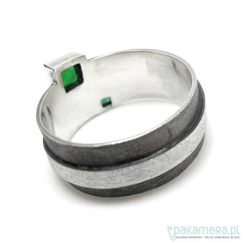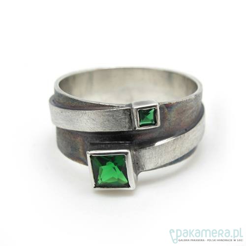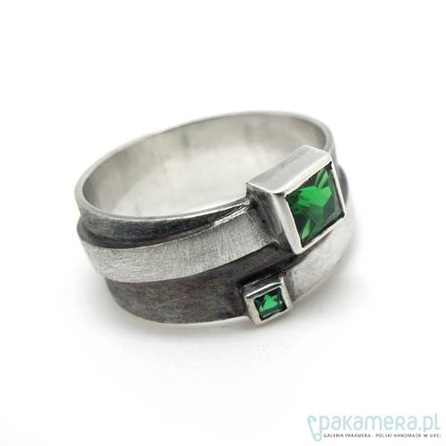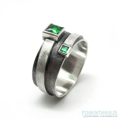 Pierścionek srebrny z dwiema cyrkoniami różnej wielkości. Szeroki na 1 cm, z dwoma kamieniami po 2 i 4 mm. Jego powierzchnia jest matowiona i częściowo oksydowana.