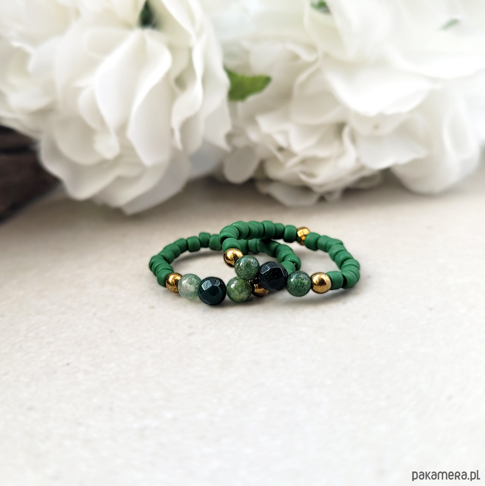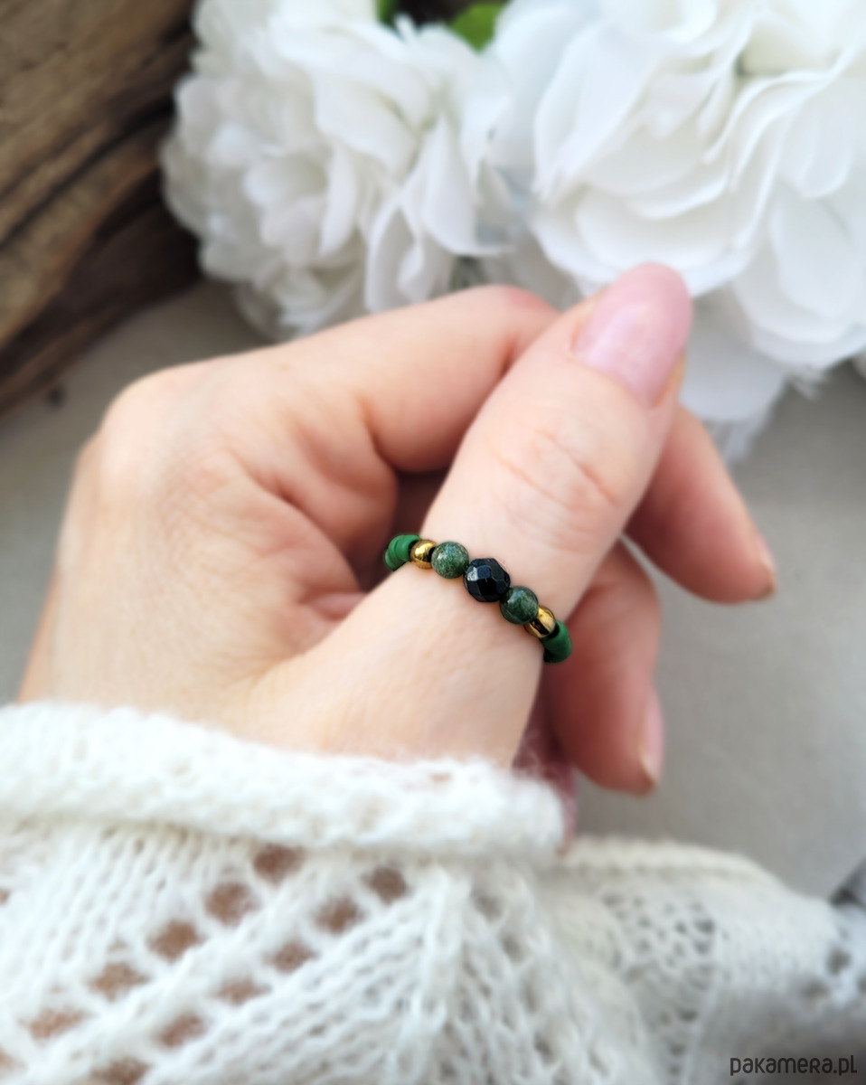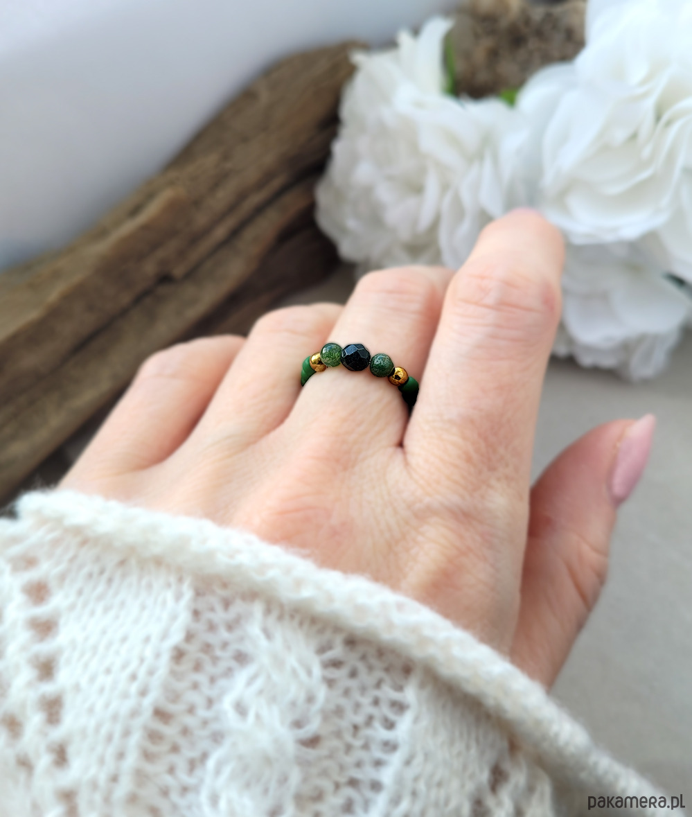 Piękny pierścionek elastyczny z Agatem mszystym, indyjskim oraz Hematytem w kolorze złota.